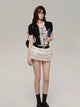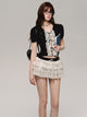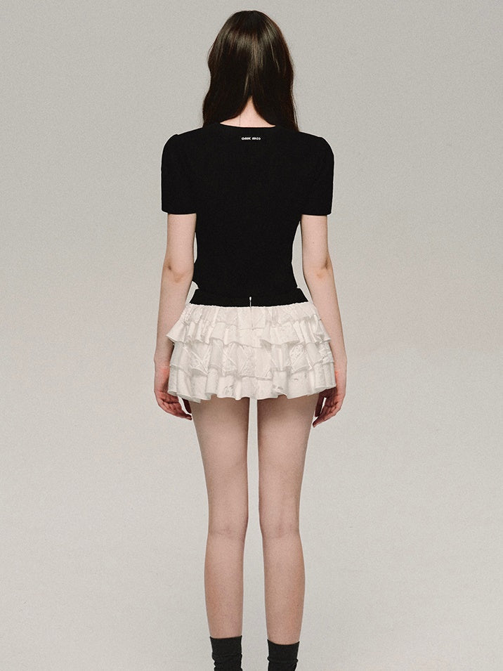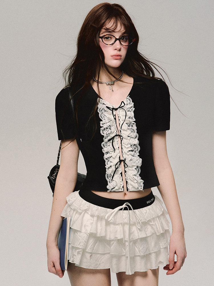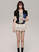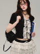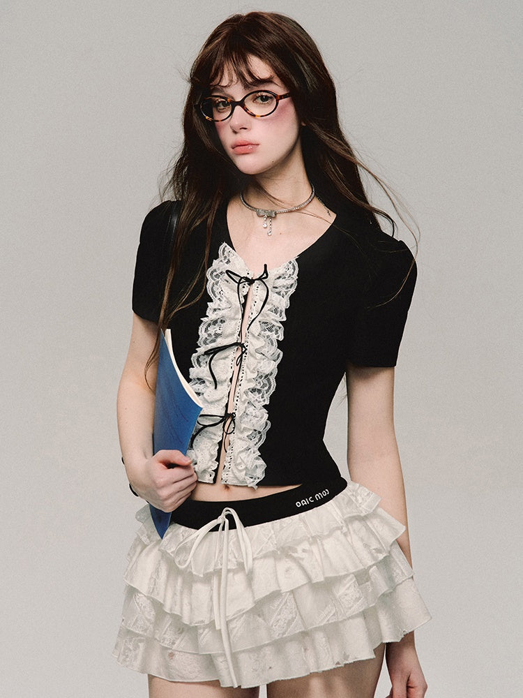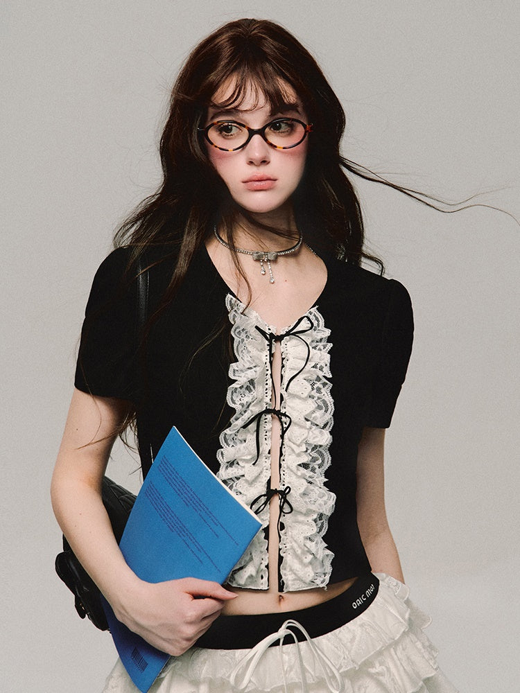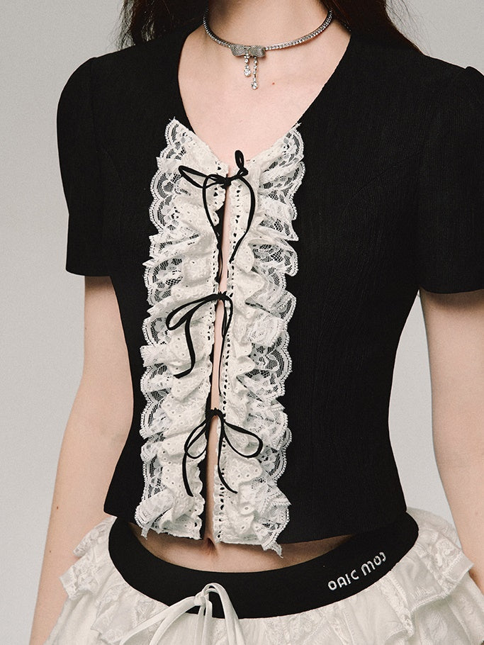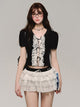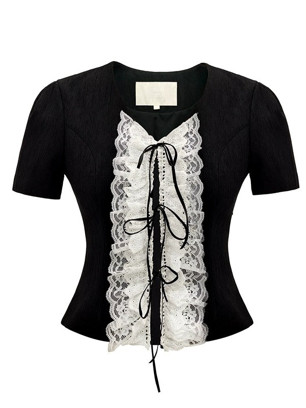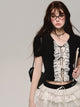 레이스 자수 플래킷 반소매 티셔츠