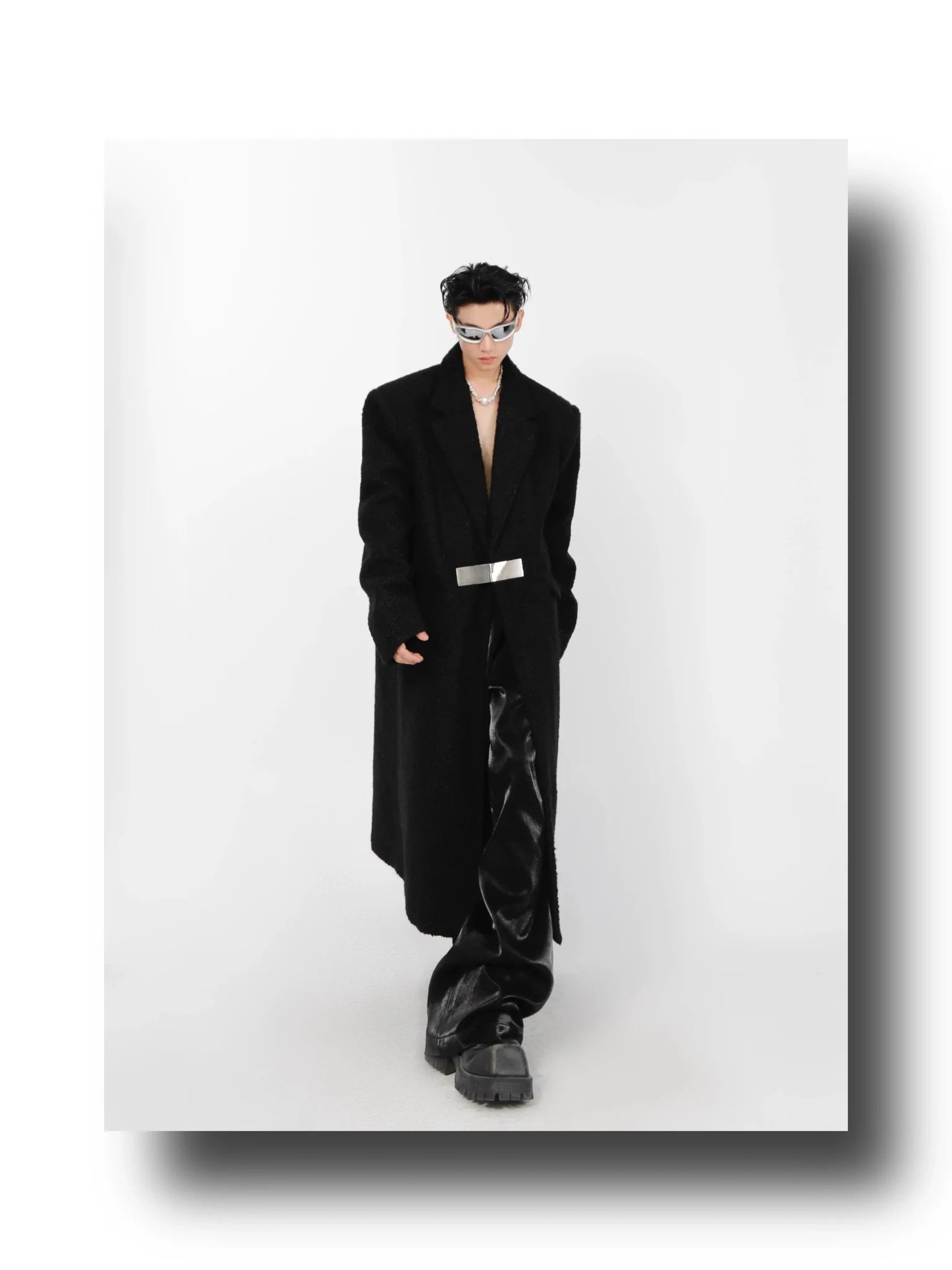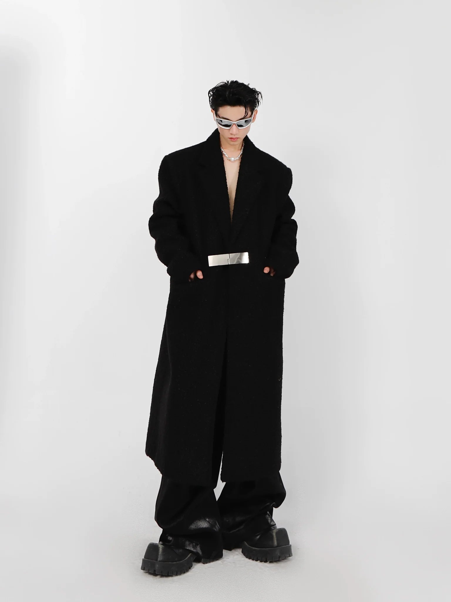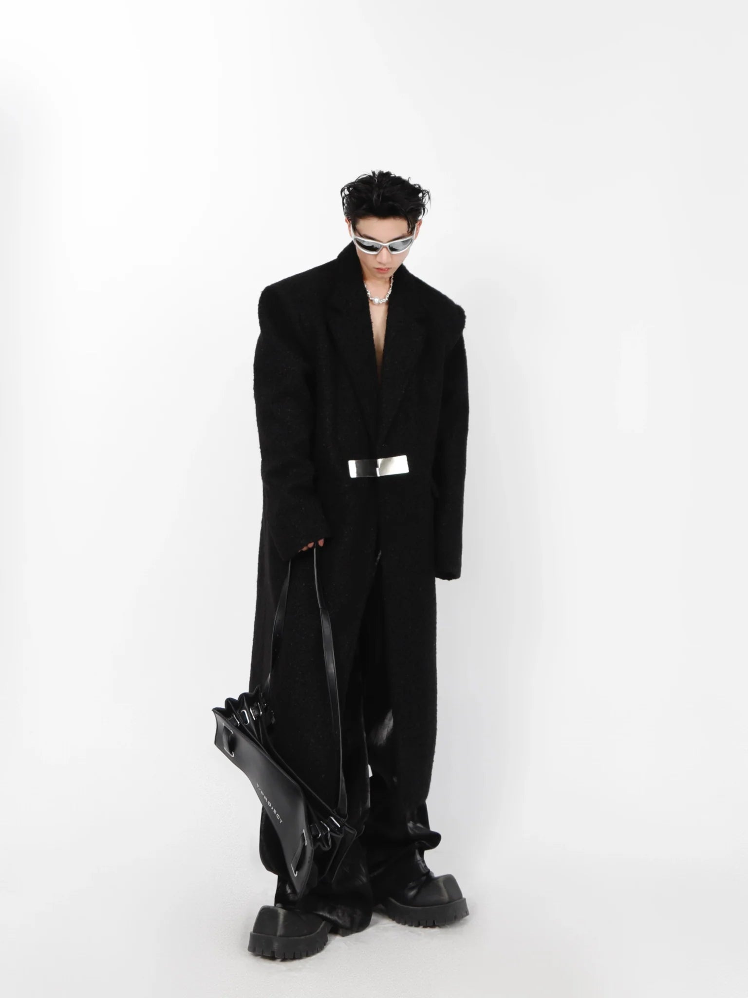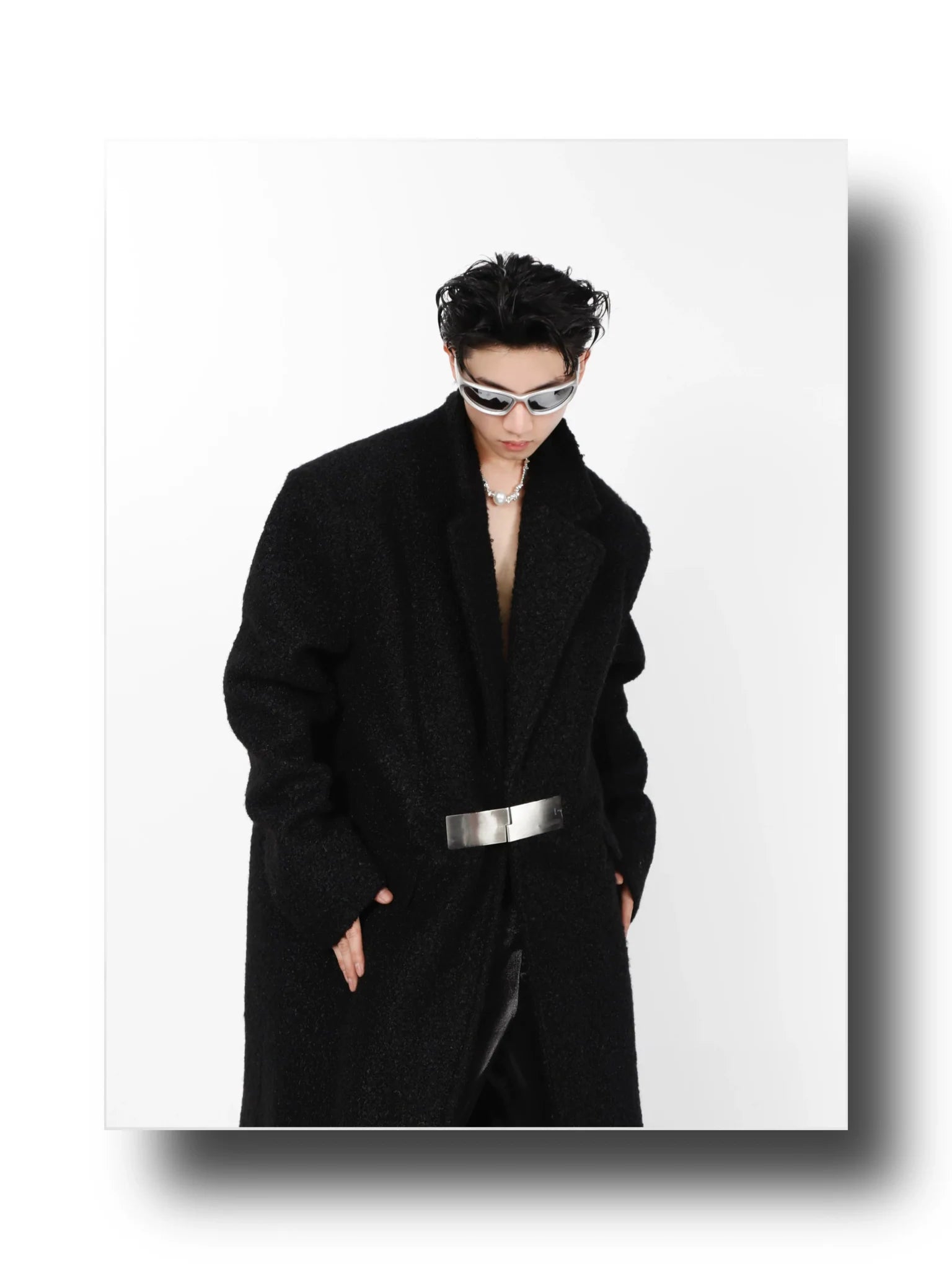 - Our Lamb Wool Shoulder-Pad Overcoat is a masterpiece of avant-garde tailoring, featuring a sophisticated blend of minimalist aesthetics with pioneering design elements. The metal buckle closure adds a distinctive touch, elevating the classic woolen trench into a modern icon of style.