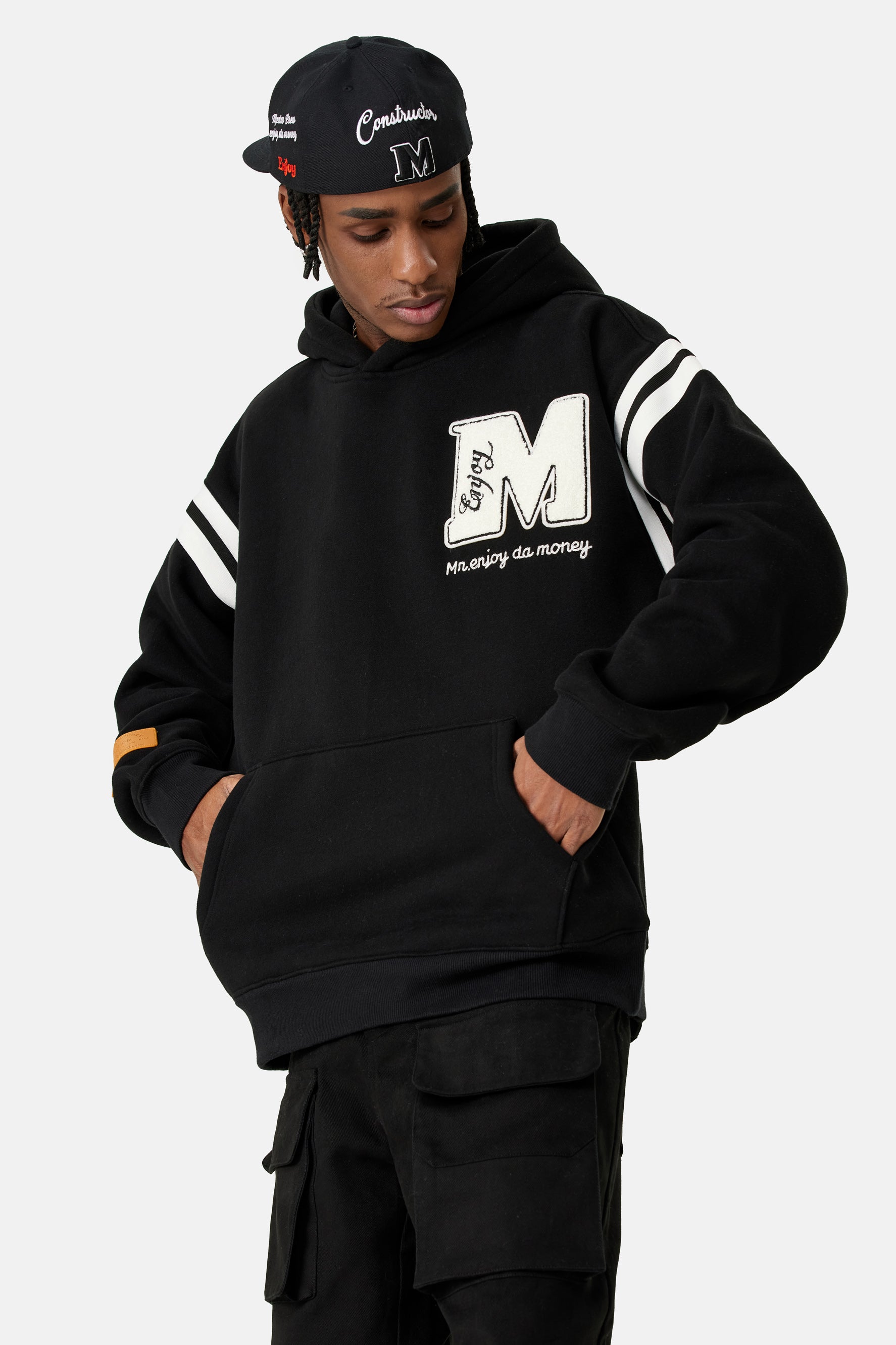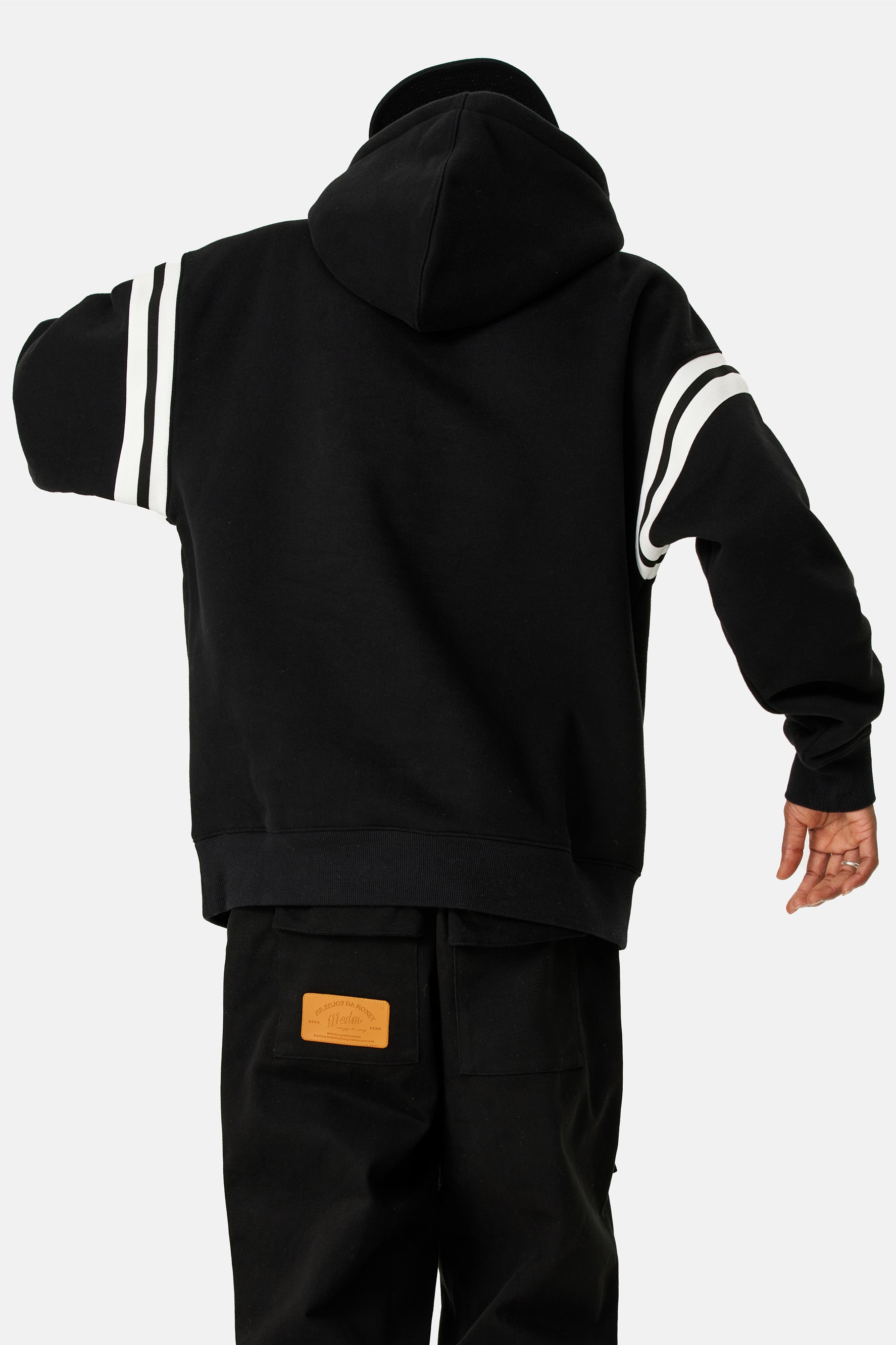 드롭 숄더 디자인과 손목과 허리 부분의 골지 디테일로 여유로운 핏을 선사하는 후디입니다. ~이다 어깨 부분에 대조적인 스트라이프 모티프가 장식되어 있습니다. 앞면과 뒷면에 Medm 자수 로고가 있습니다.