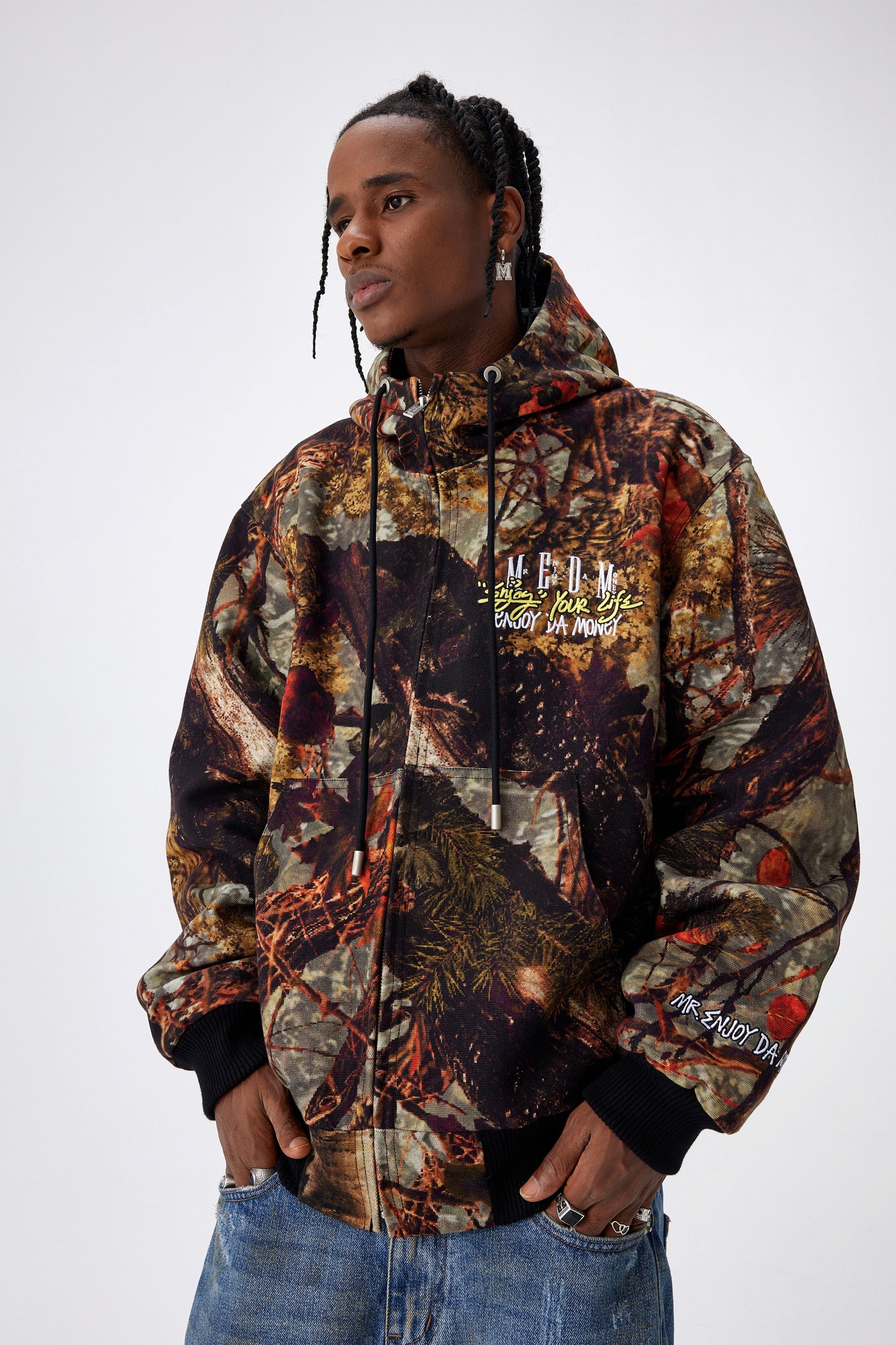 이 고급 MEDM 디트로이트 지퍼 재킷은 폴리에스테르로 제작되었으며, 전체적으로 세련된 카모 패턴과 후드가 있는 집업 앞면이 특징입니다. 모든 야외 행사에 적합합니다.