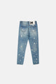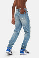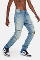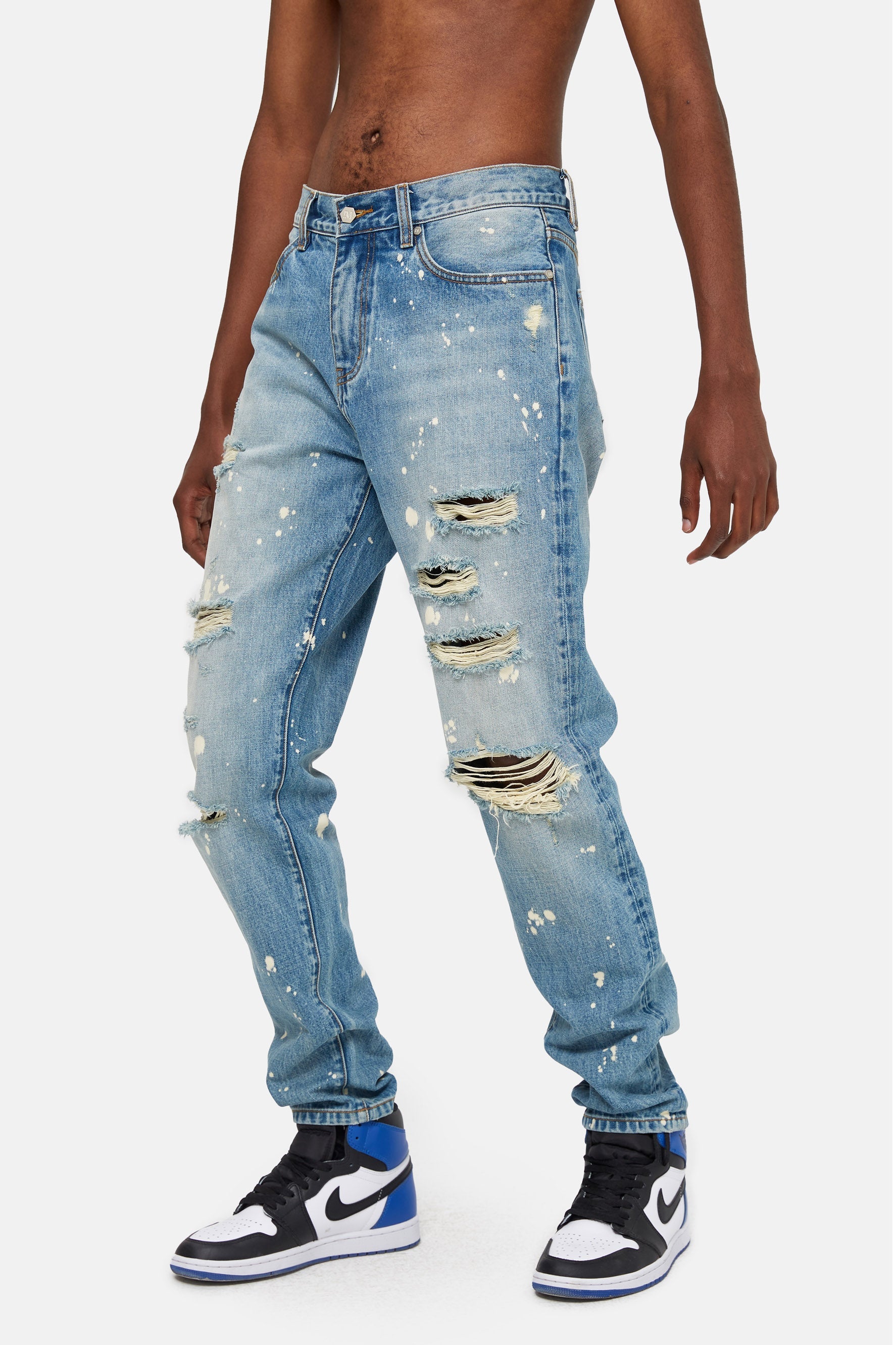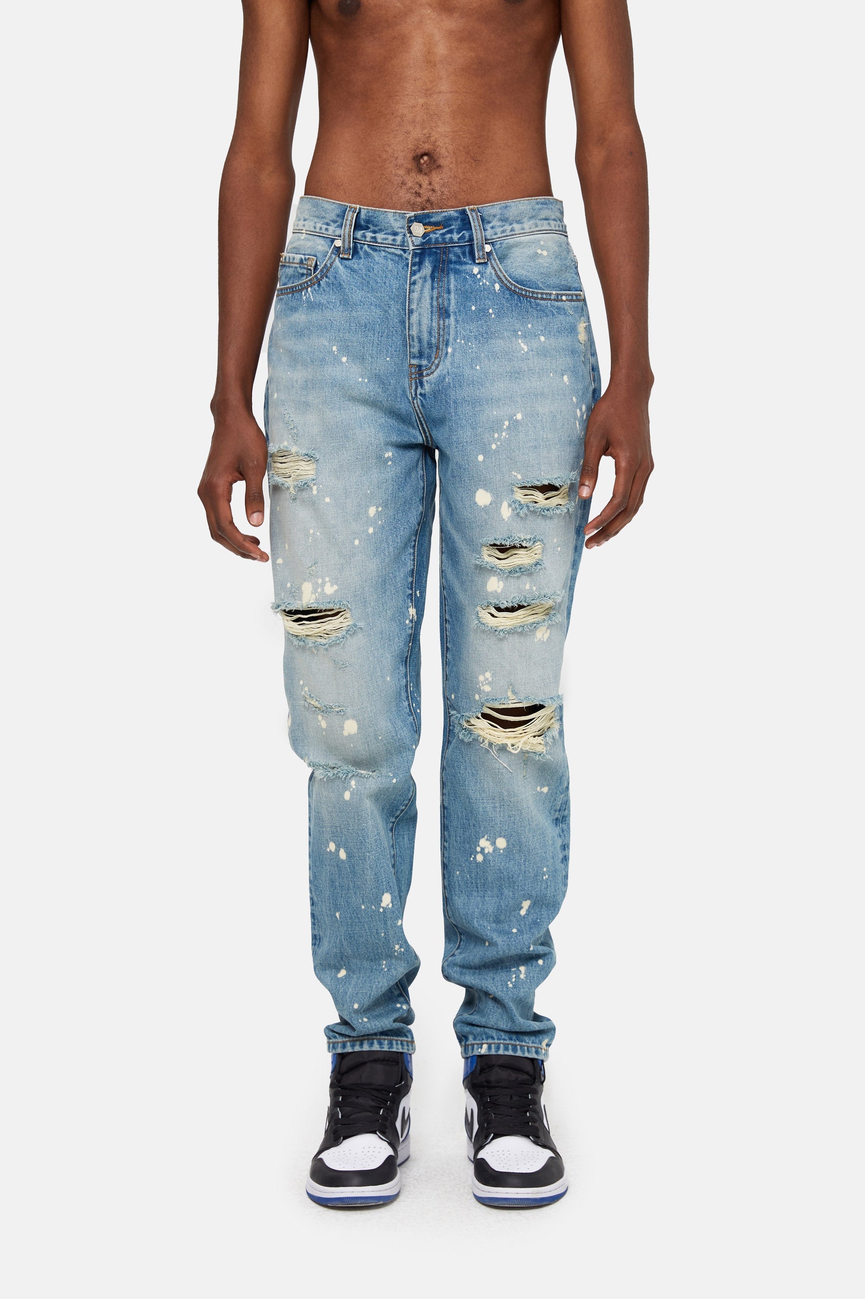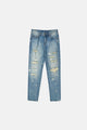 이 청바지는 편안한 핏과 디스트레스드 효과가 있는 스트레이트 레그가 특징입니다.