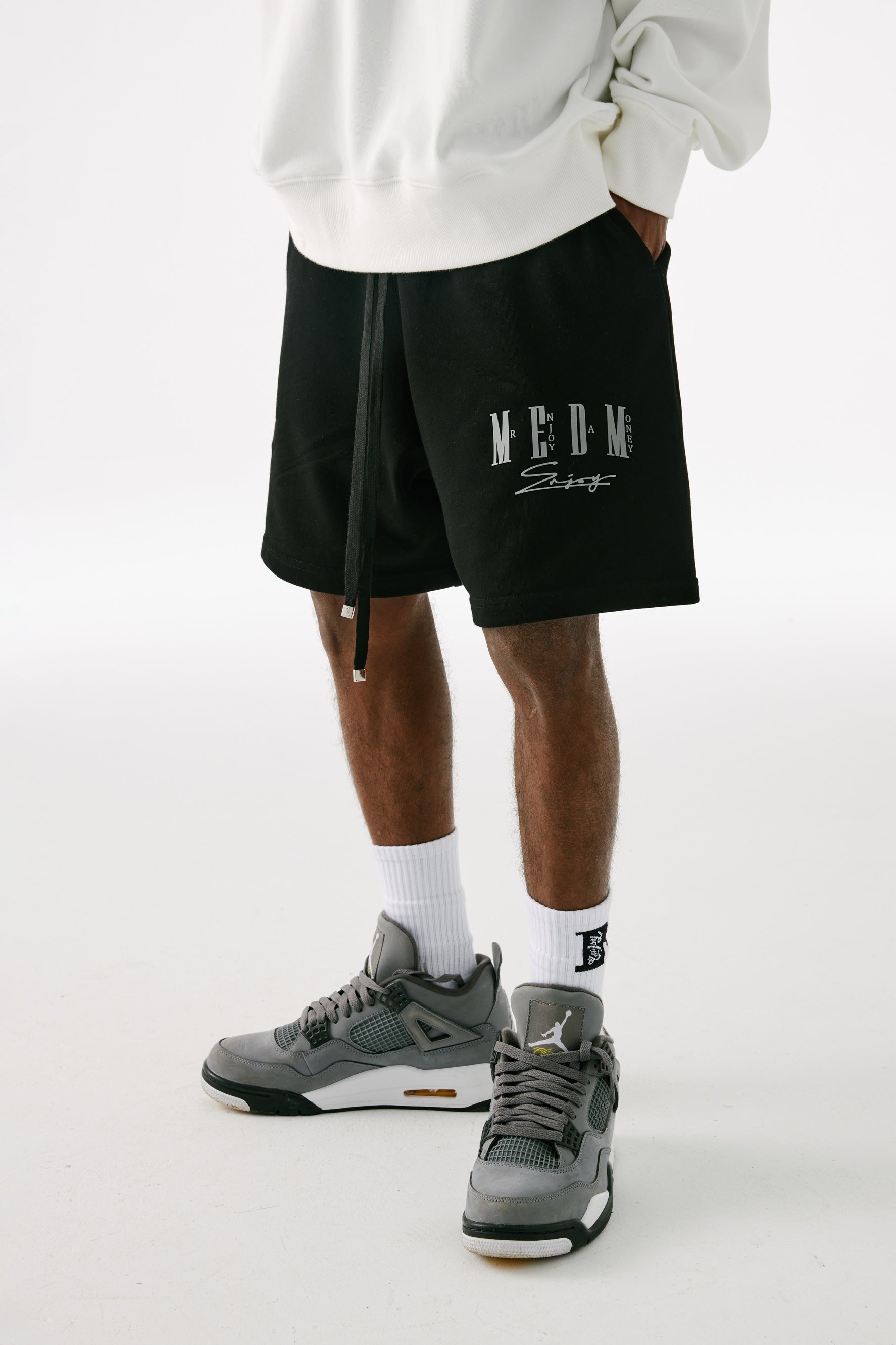 MEDM의 DRAWSTRING SHORTS로 편안함을 유지하고 스타일리시해 보세요. 오가닉 코튼으로 제작되어 매우 부드러운 느낌을 주는 이 쇼츠는 긴 조임끈이 있어 핏을 조절할 수 있으며 왼쪽에는 로고가 있습니다. 어떤 캐주얼룩에도 딱!