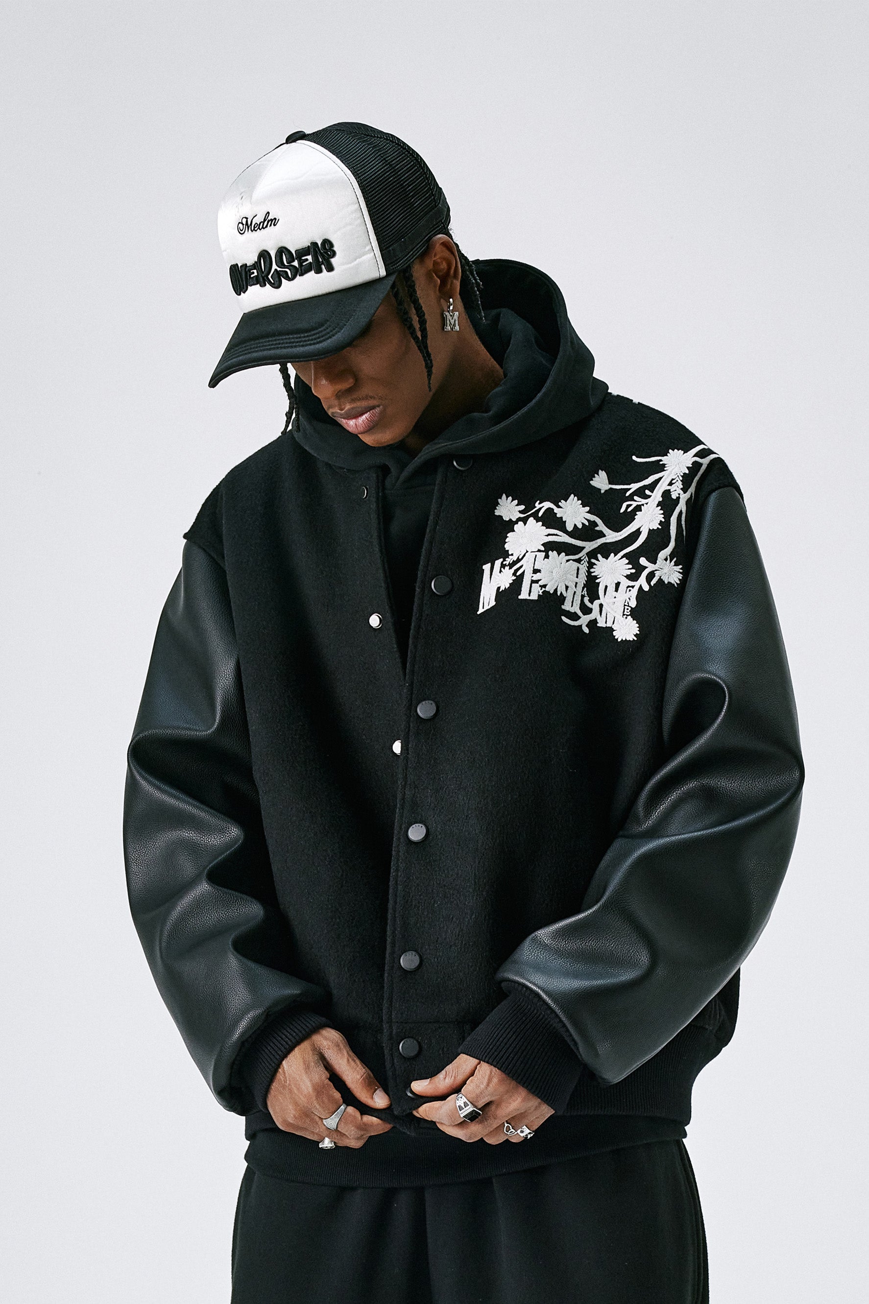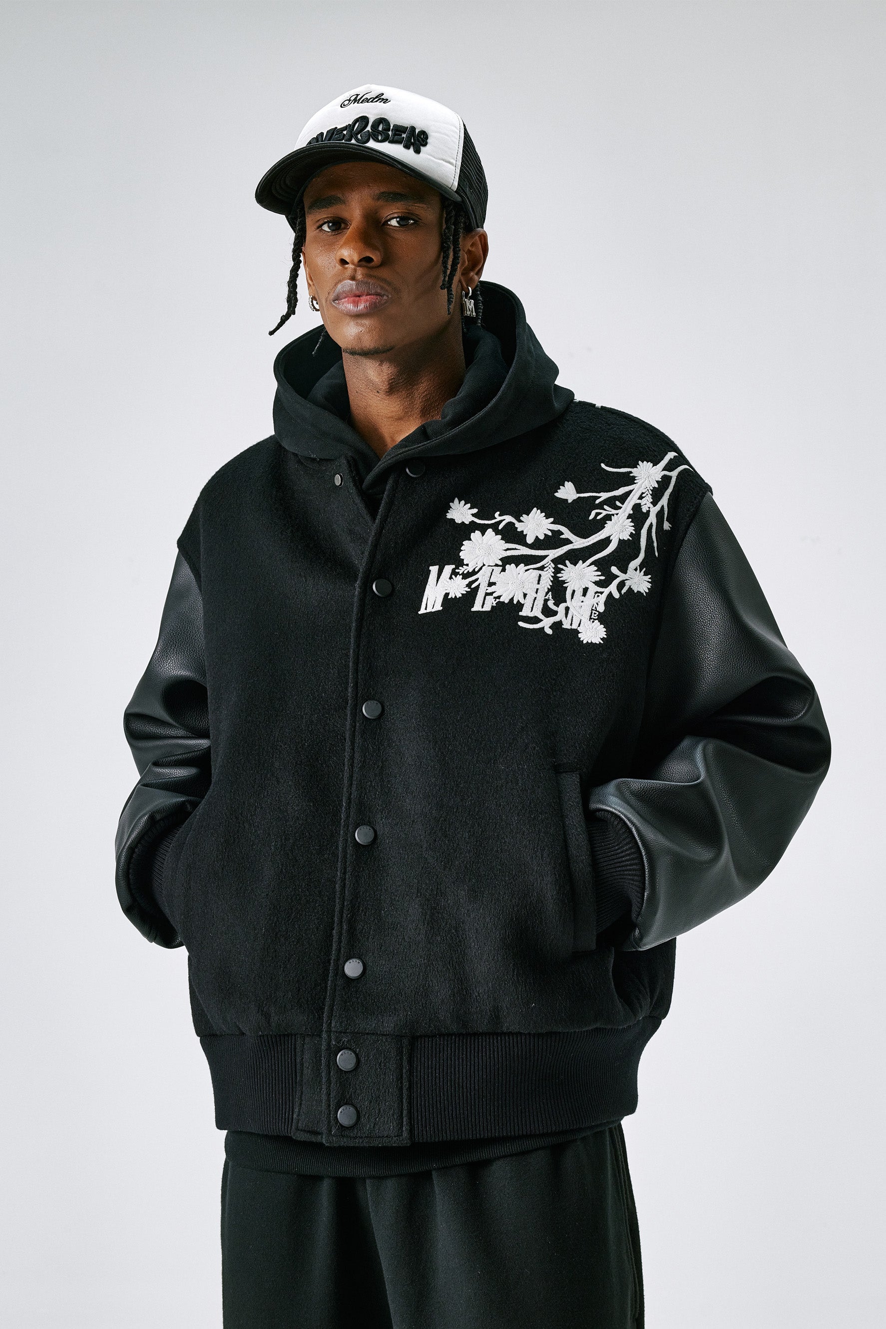 MEDM 자수 데이지 바시티 재킷을 입고 대담해 보세요. 울과 비건 가죽이 혼합된 이 재킷은 앞면과 뒷면 모두 눈길을 끄는 데이지 자수가 특징입니다. 클래식한 버튼 업 클로저로 꼭 맞는 핏과 시대를 초월한 스타일 감각을 보장합니다.