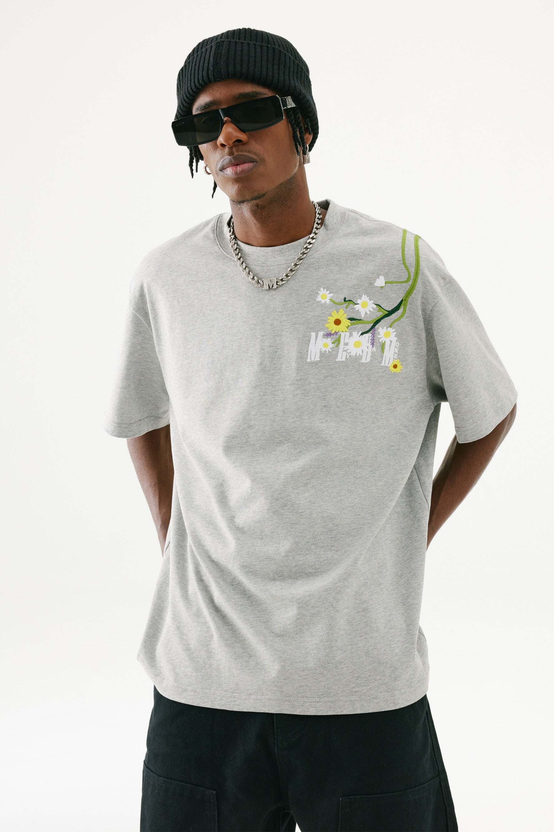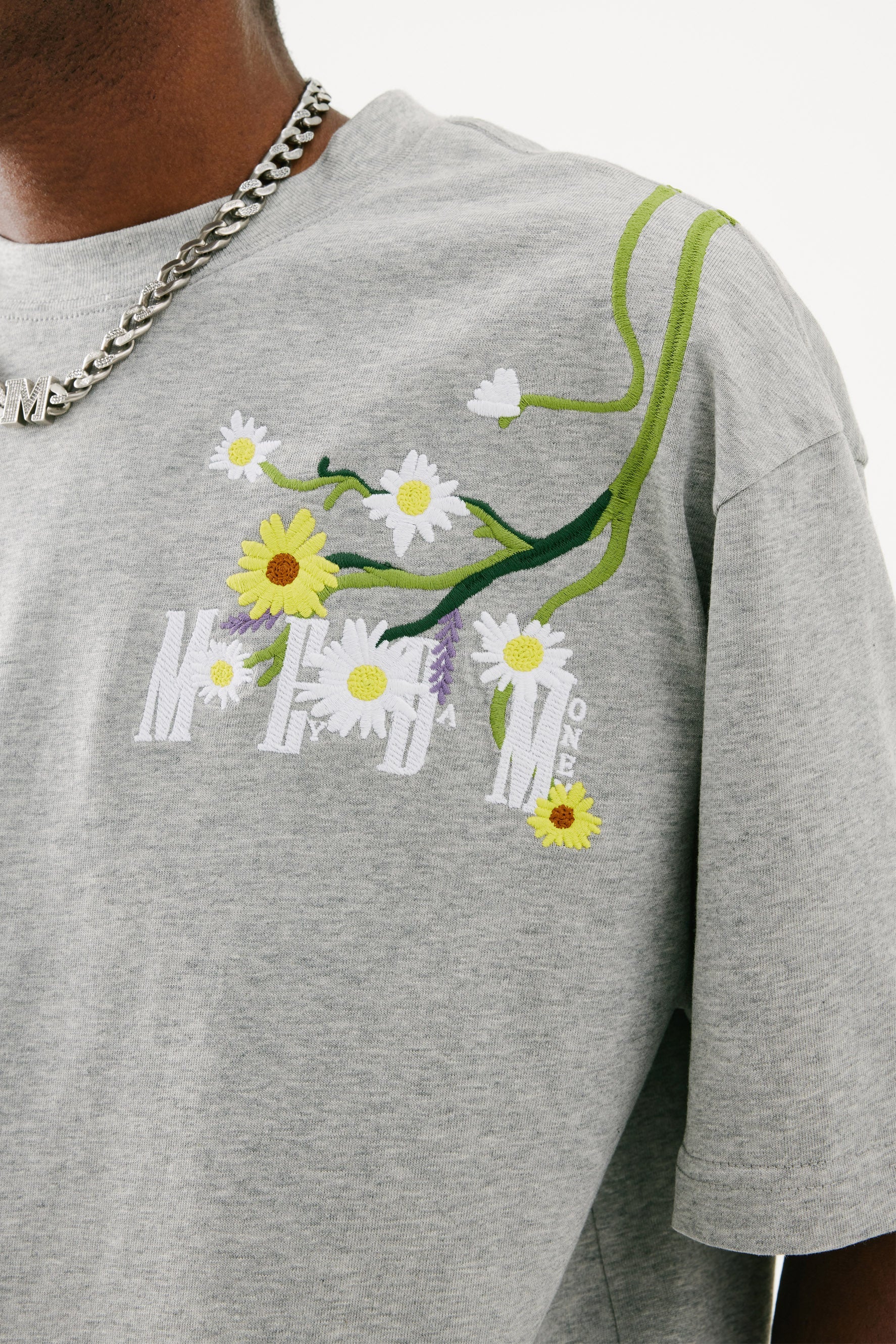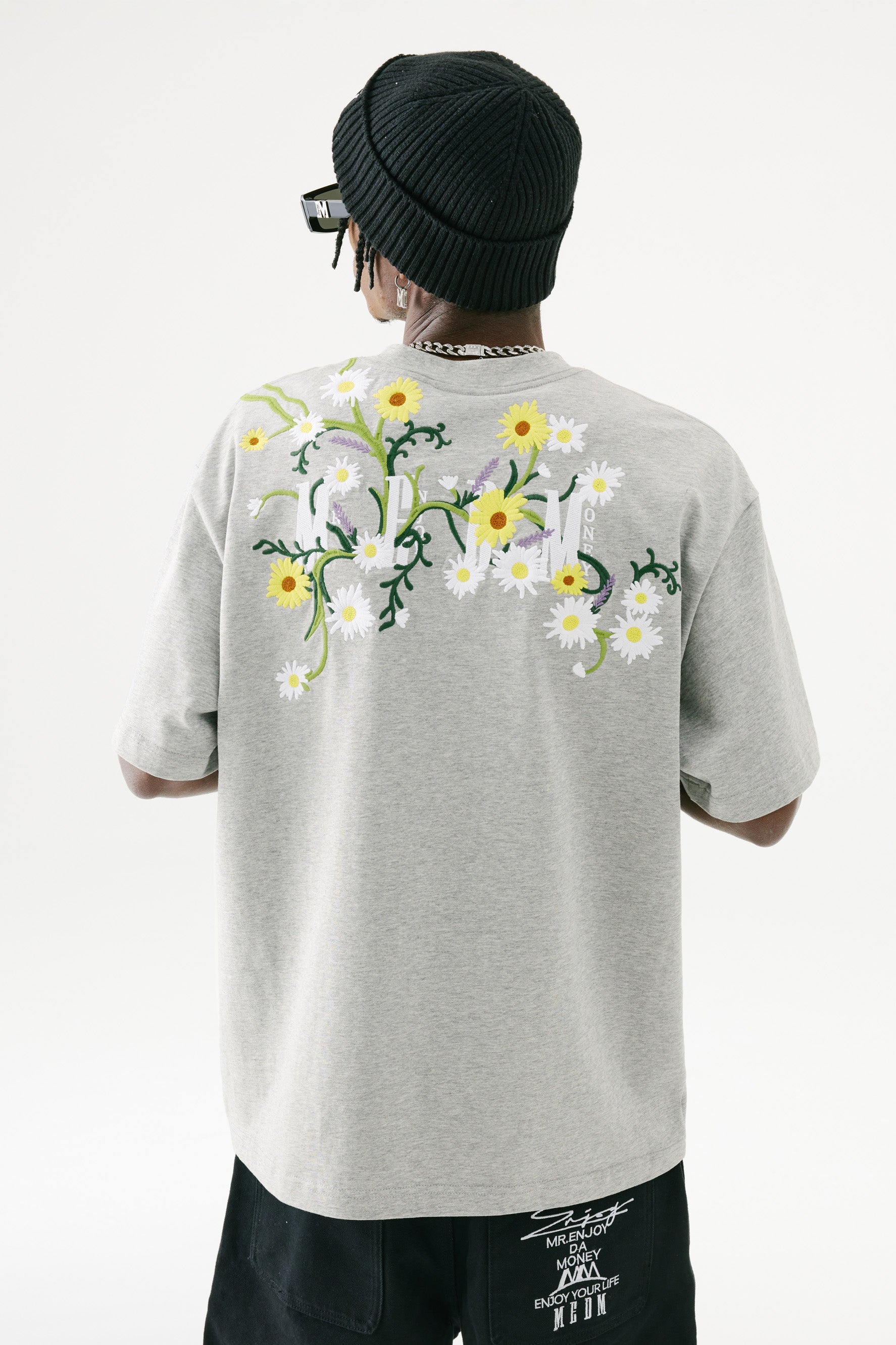 100% 오가닉 코튼으로 제작된 이 티셔츠는 통기성이 뛰어나 여유로운 핏으로 디자인되었으며 앞면과 뒷면에 복잡한 꽃 자수로 장식되어 있습니다. 쌀쌀한 계절에 딱!
