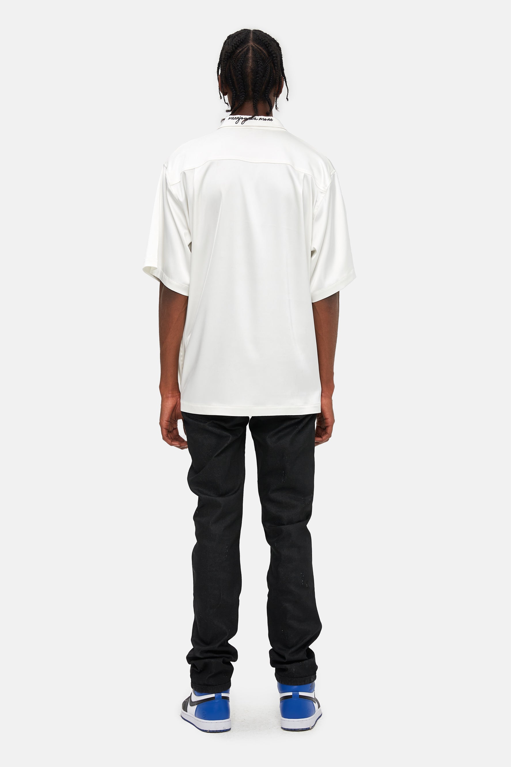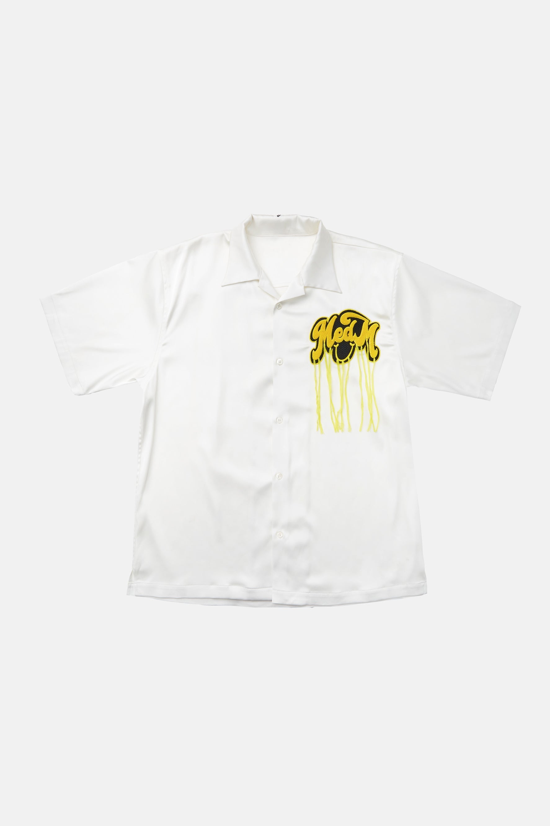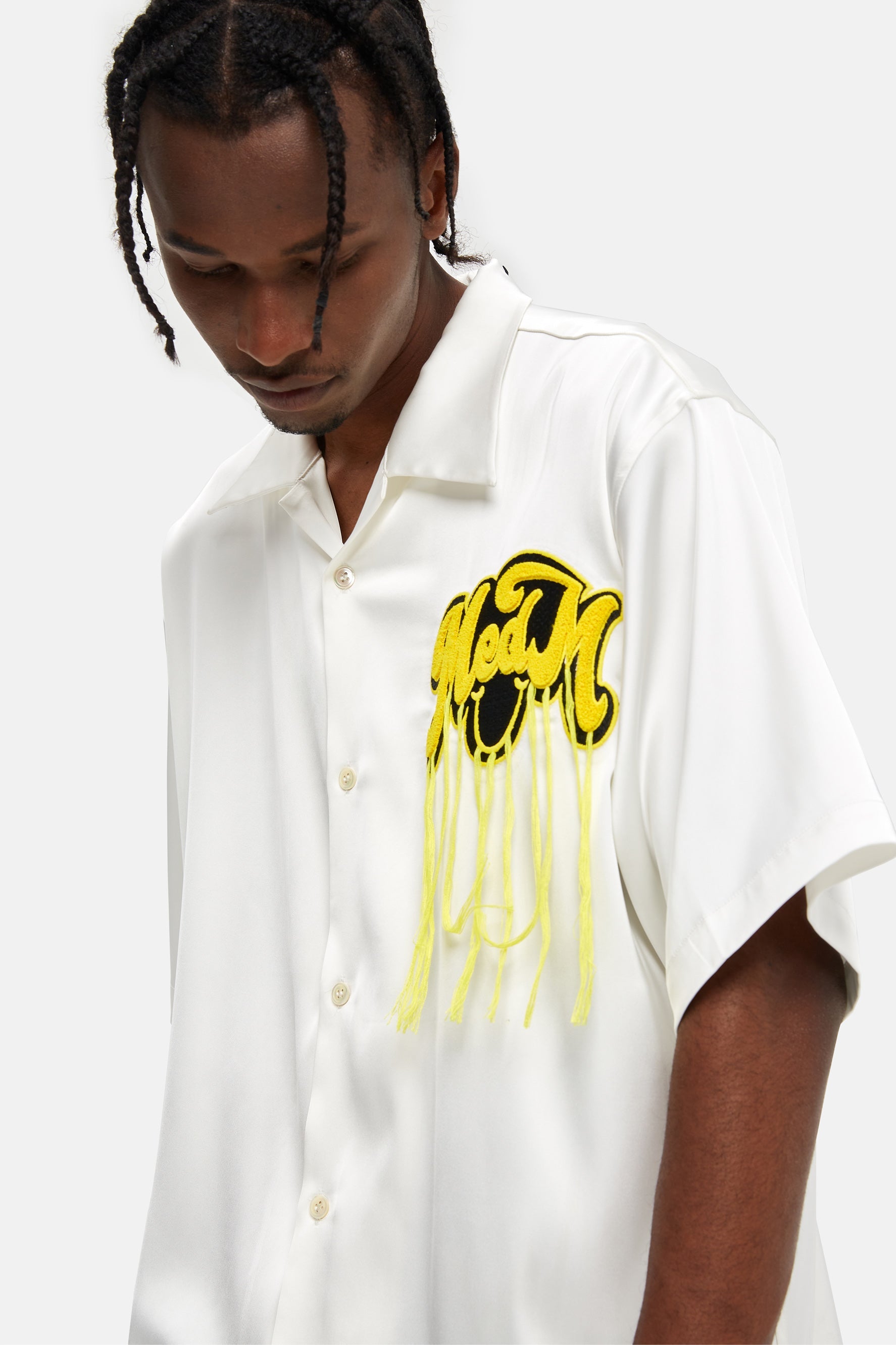 이 반소매 화이트 셔츠는 여유로운 핏과 앞면에 자수 로고가 특징입니다.