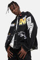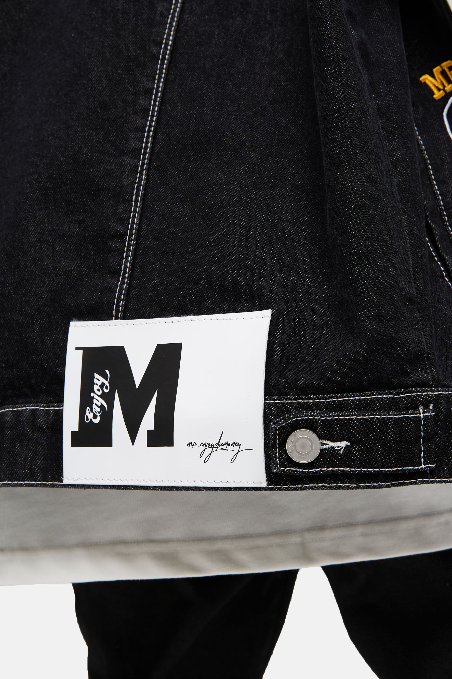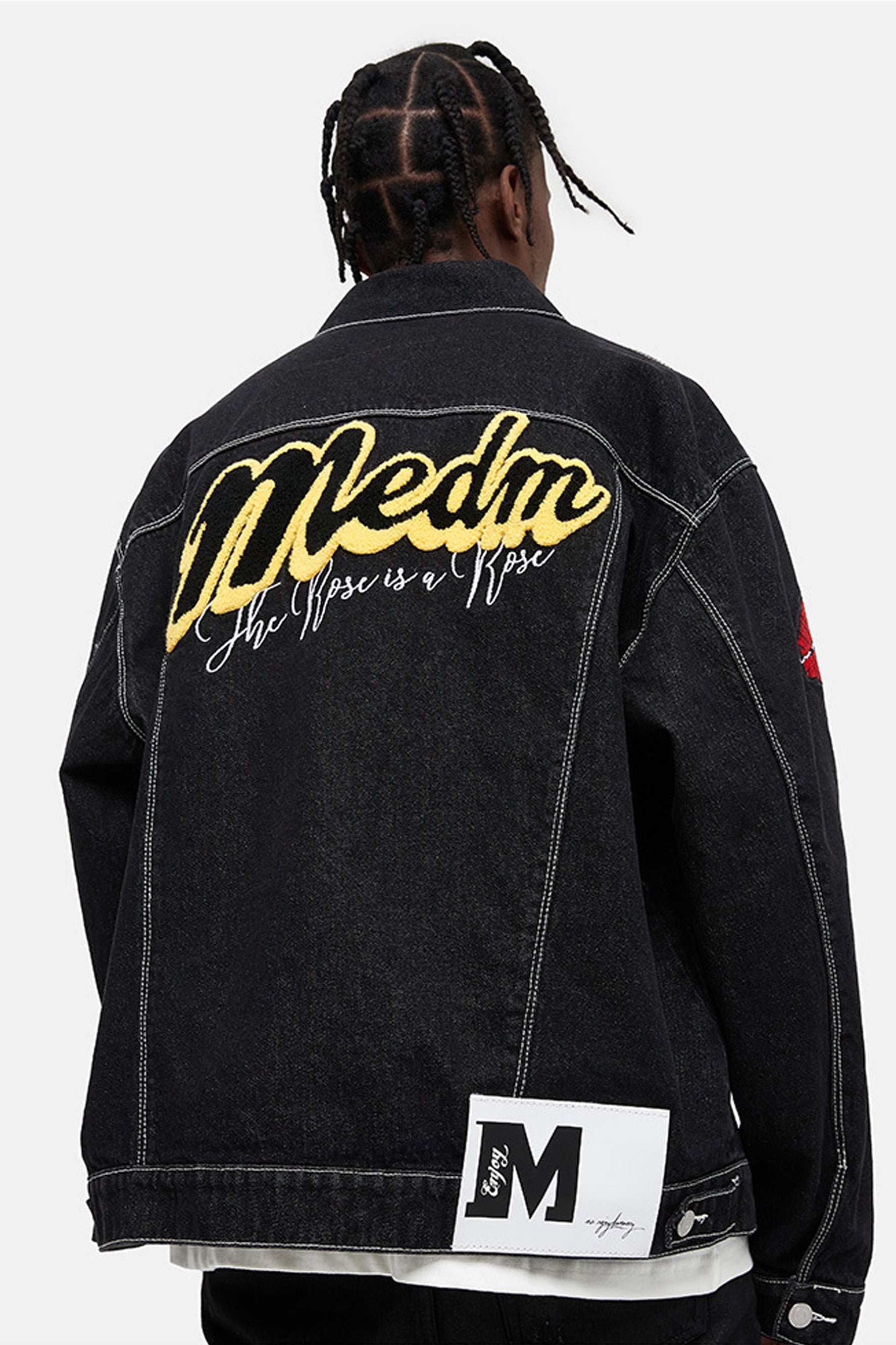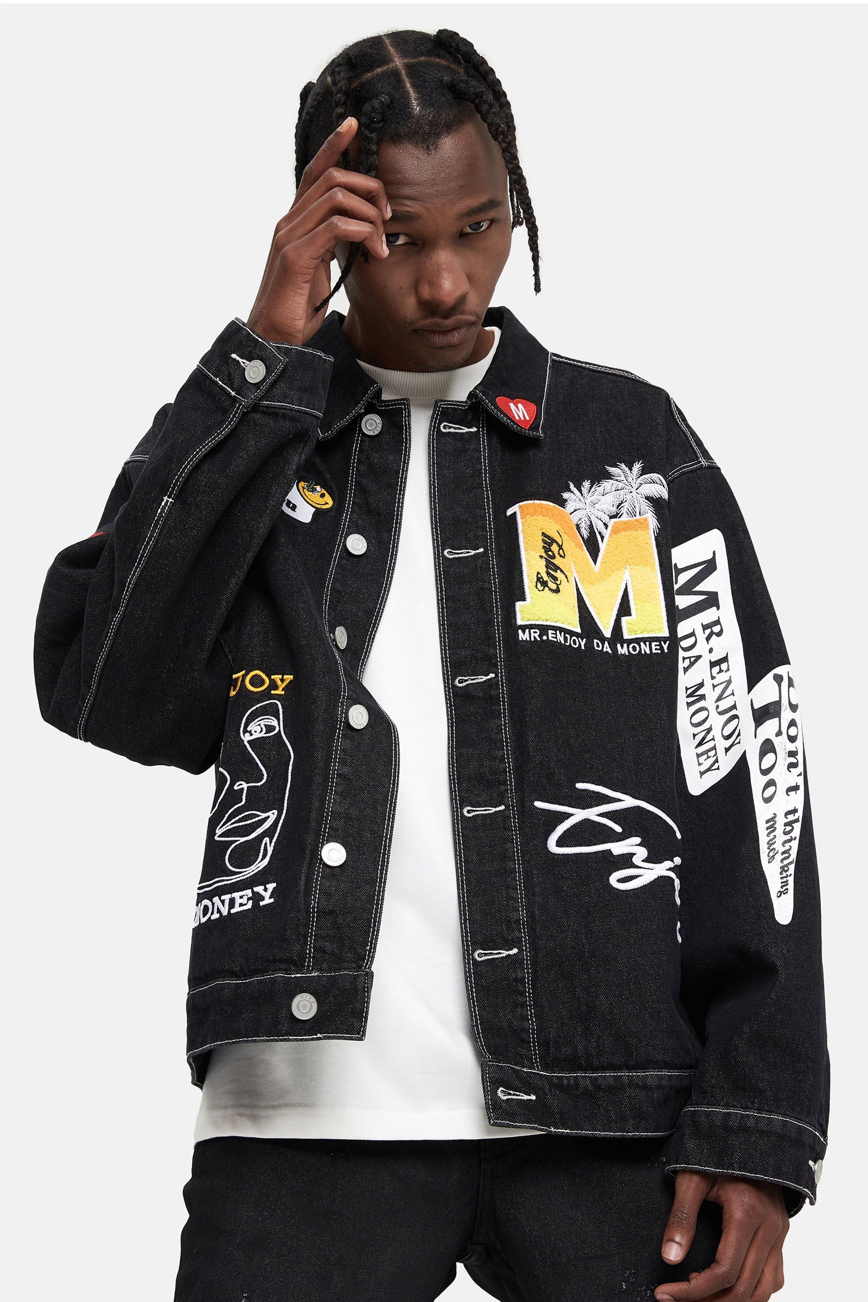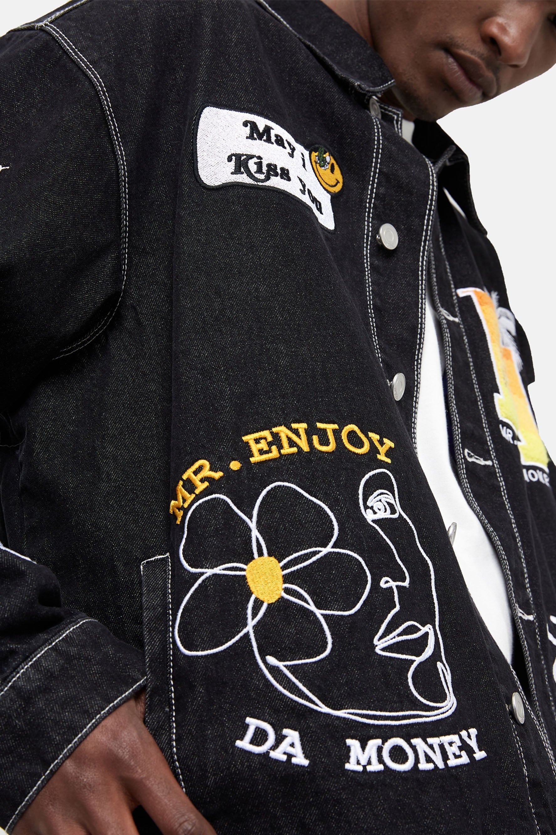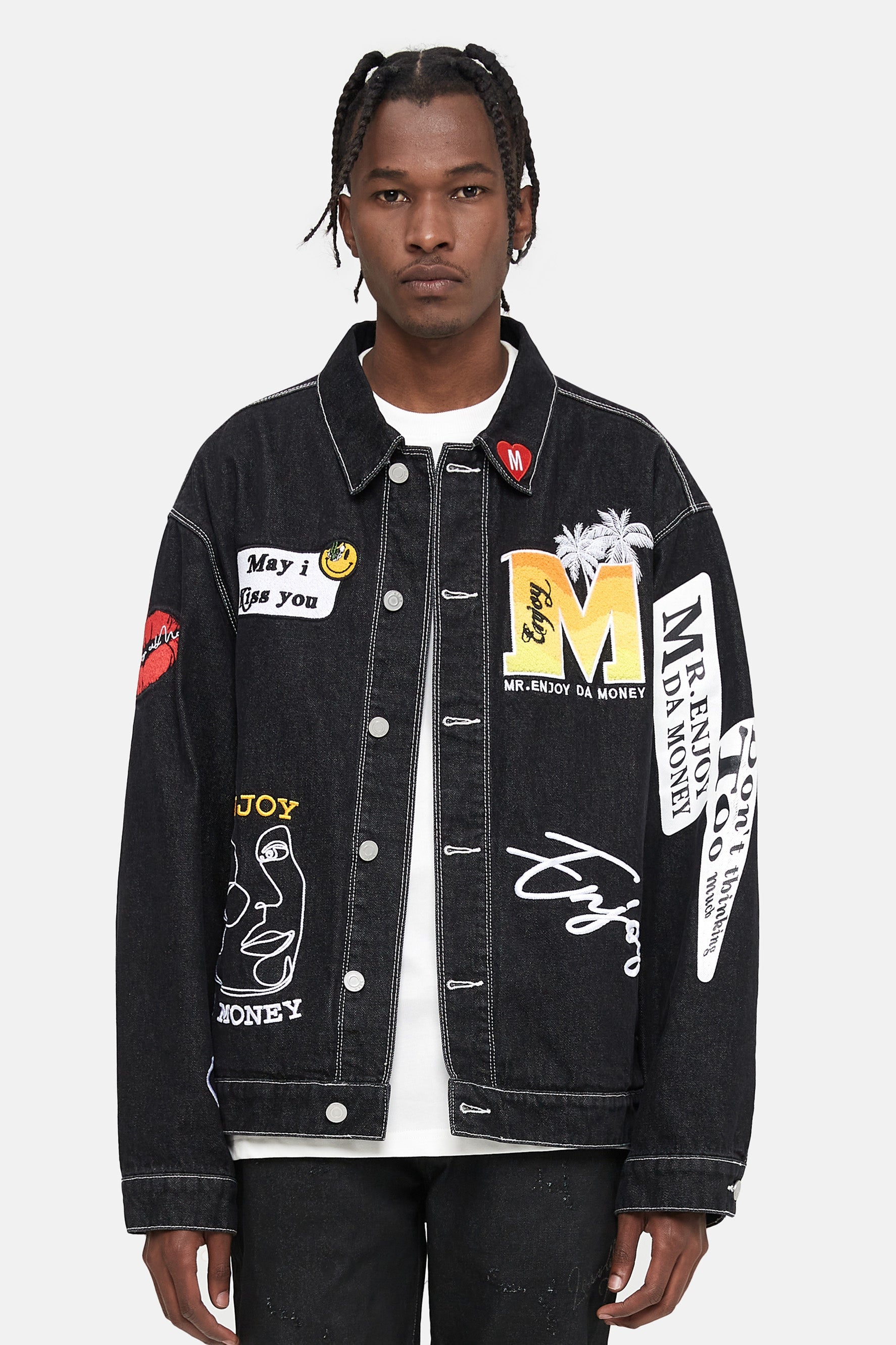 이 재킷은 앞면에 다양한 패치가 자수되어 있습니다. 버튼 업 클로저. 데님 코튼 소재로 제작되어 내구성이 더욱 뛰어납니다.