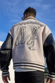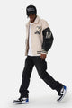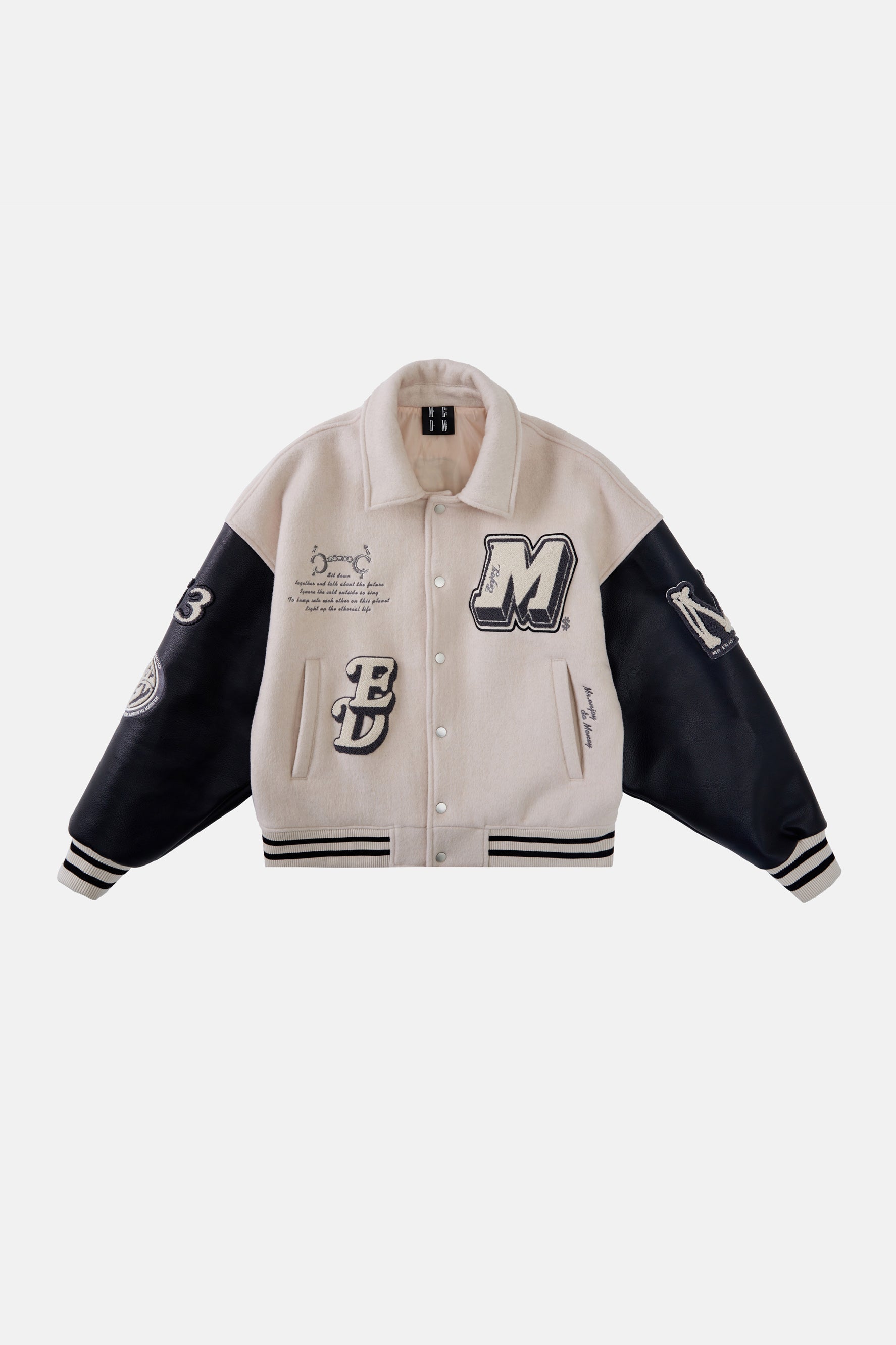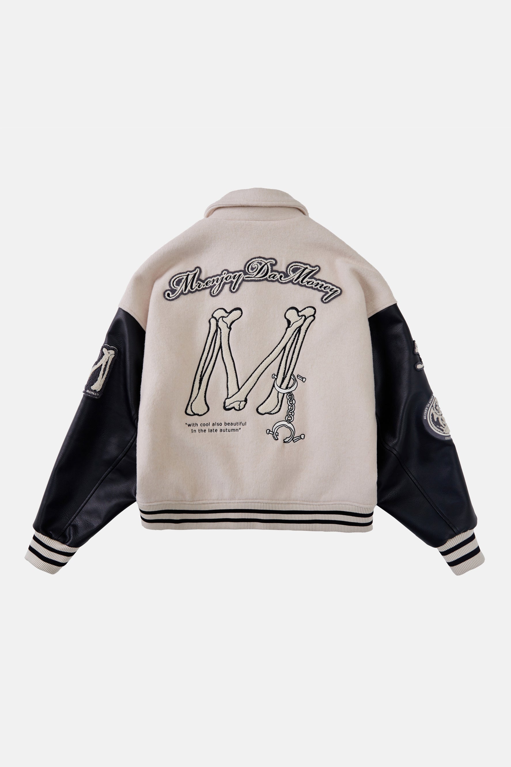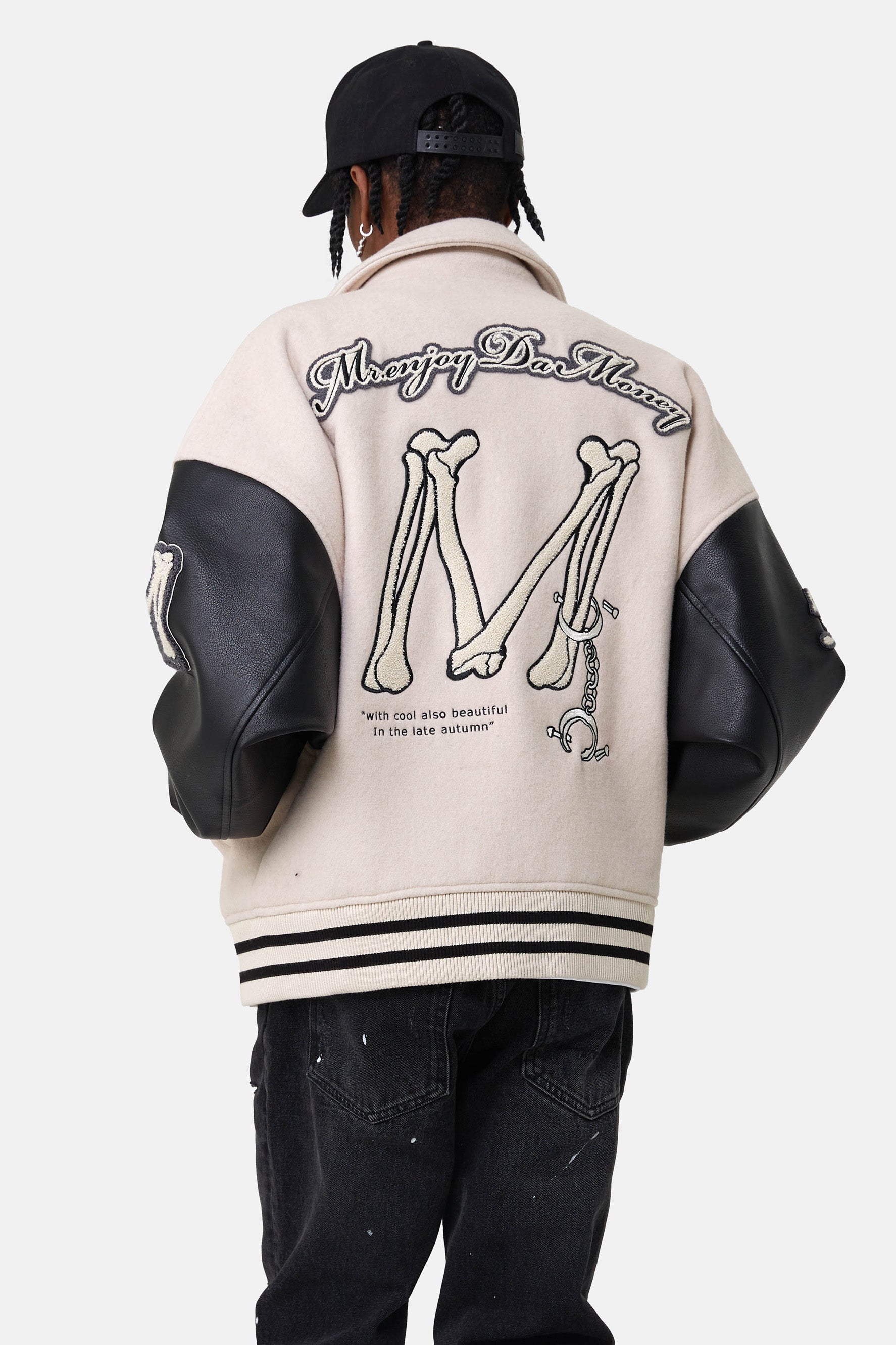 소매, 재킷 앞면과 뒷면에 자수 그래픽이 있습니다. 버튼업 클로저.