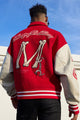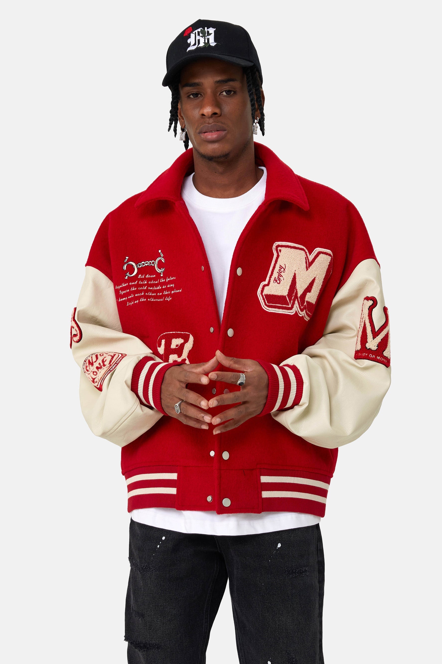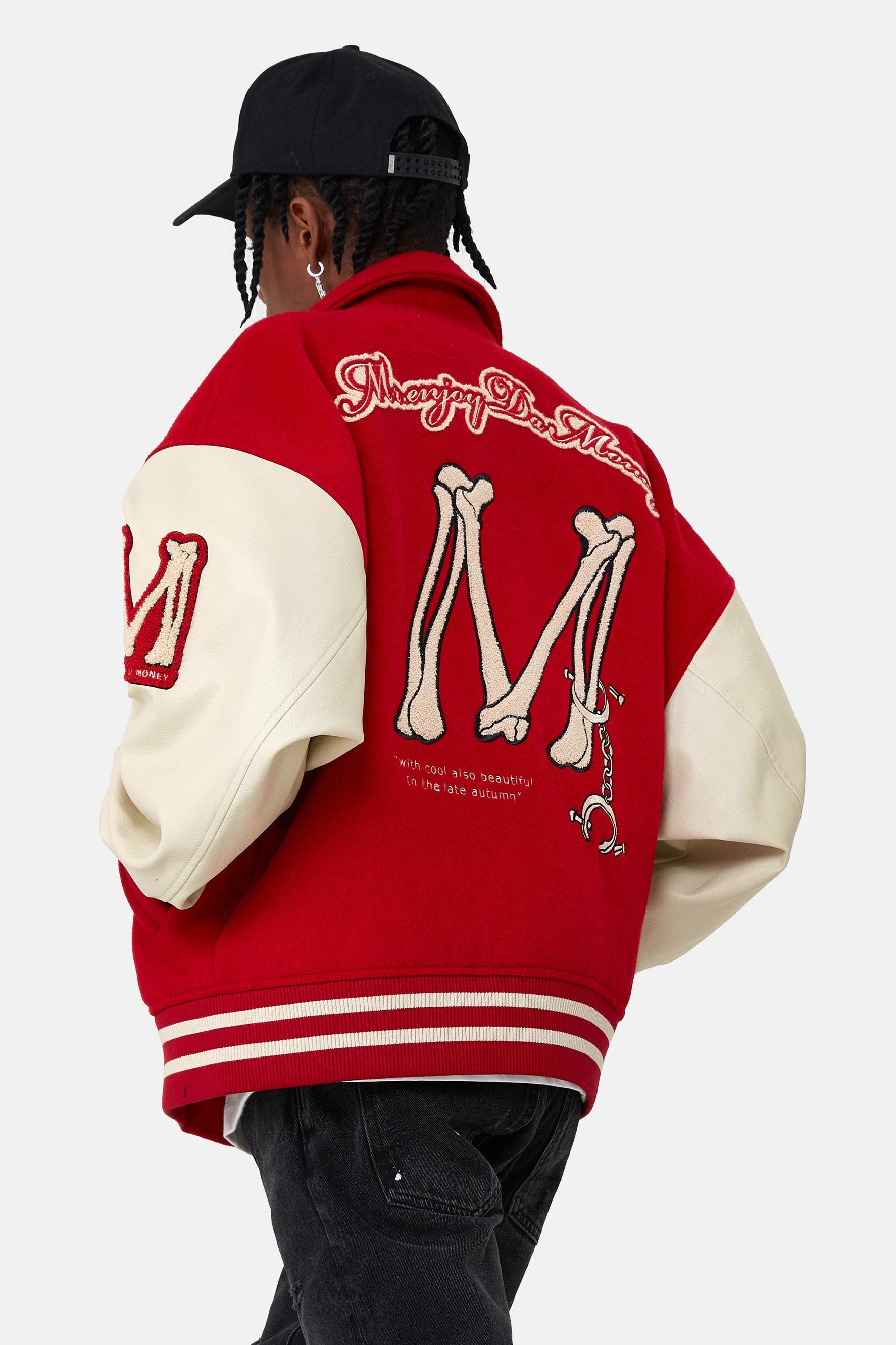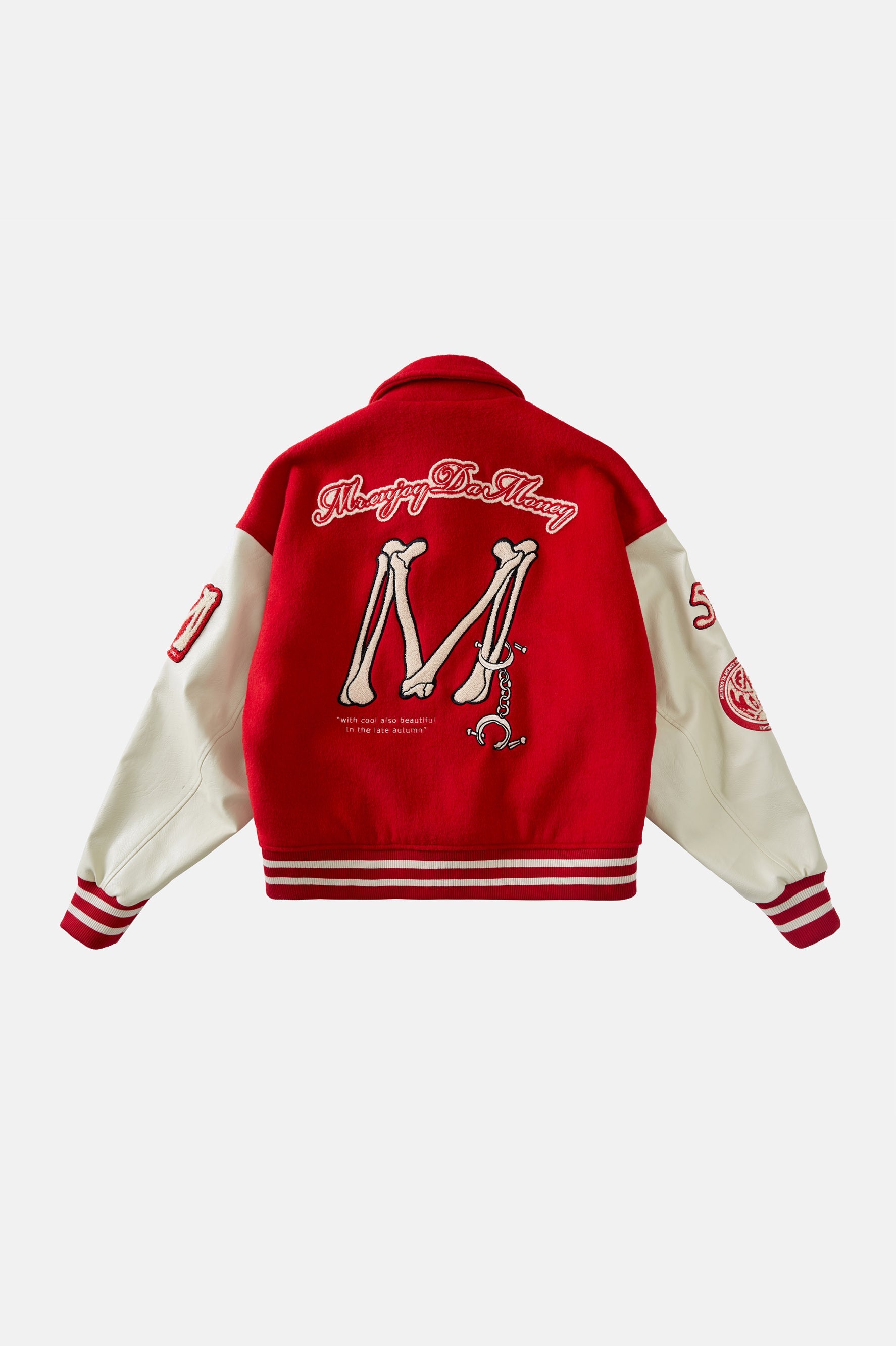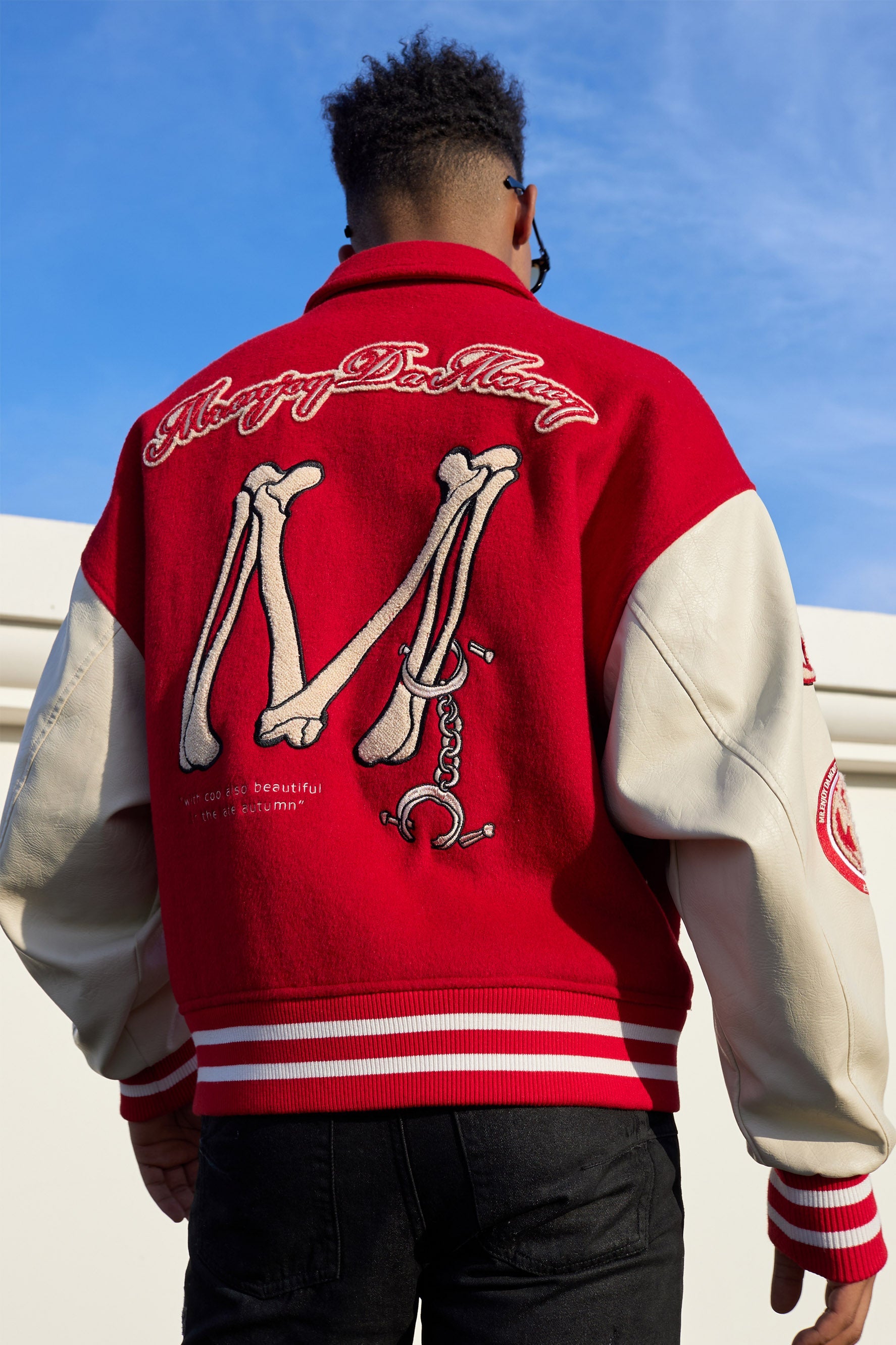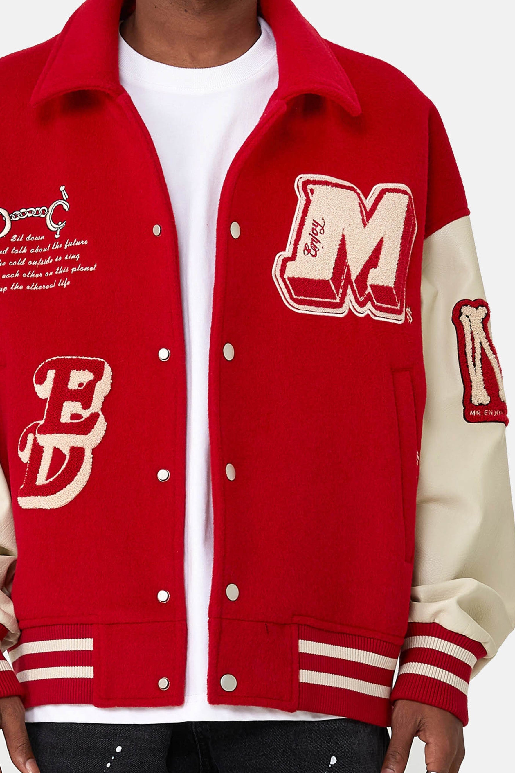 소매, 재킷 앞면과 뒷면에 자수 그래픽이 있습니다. 버튼업 클로저.