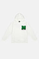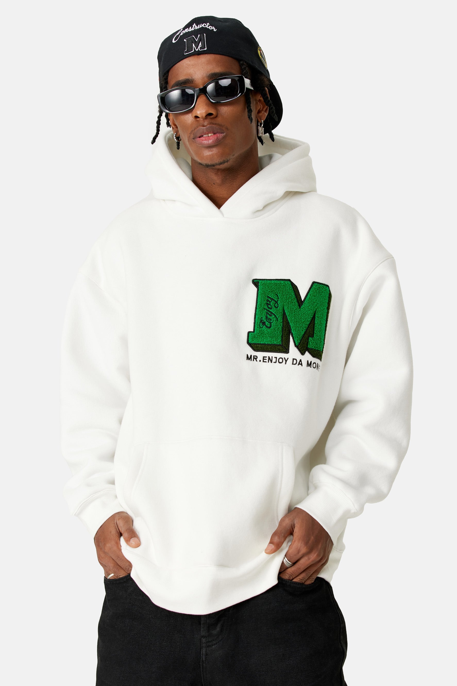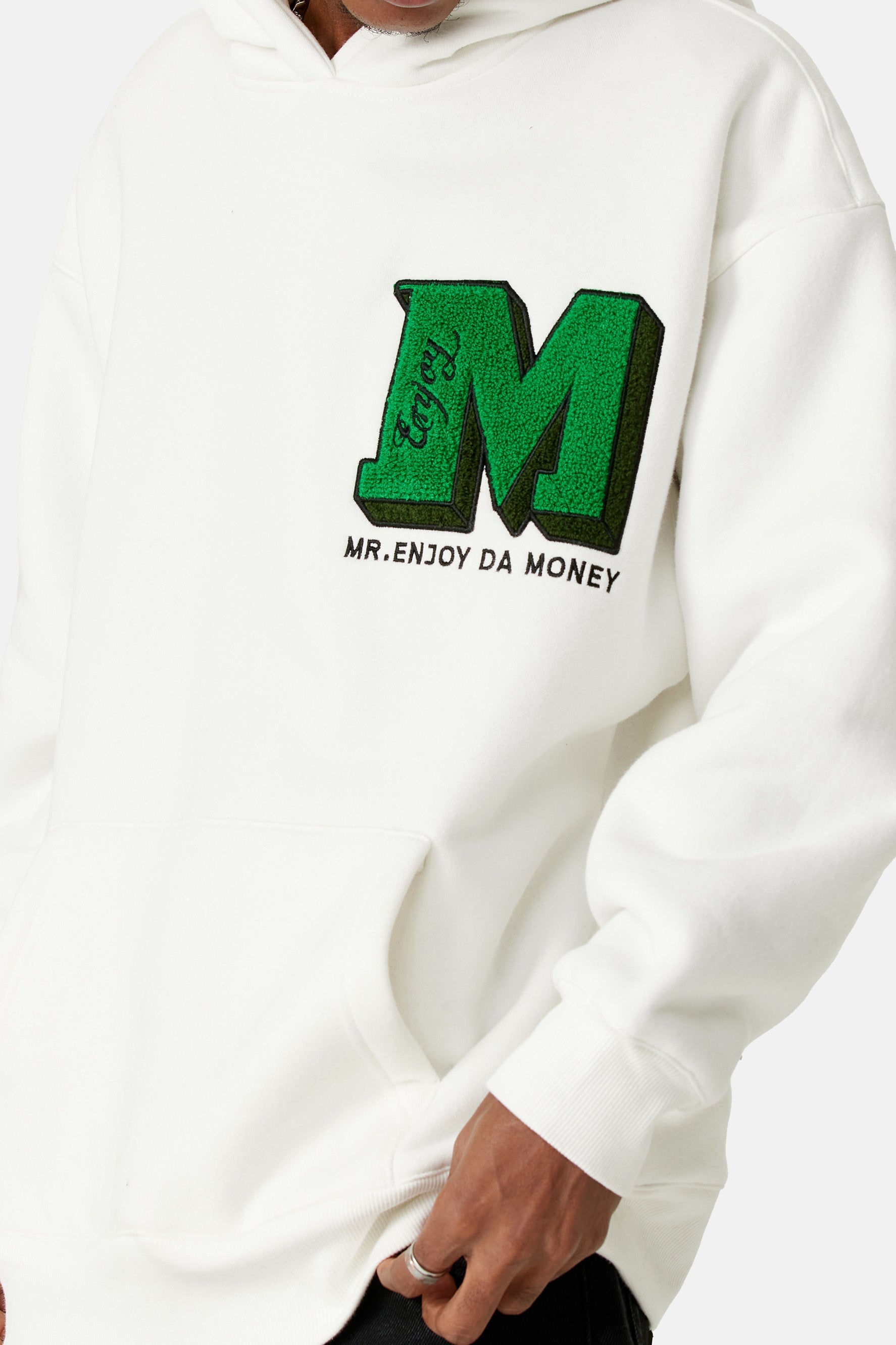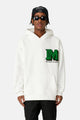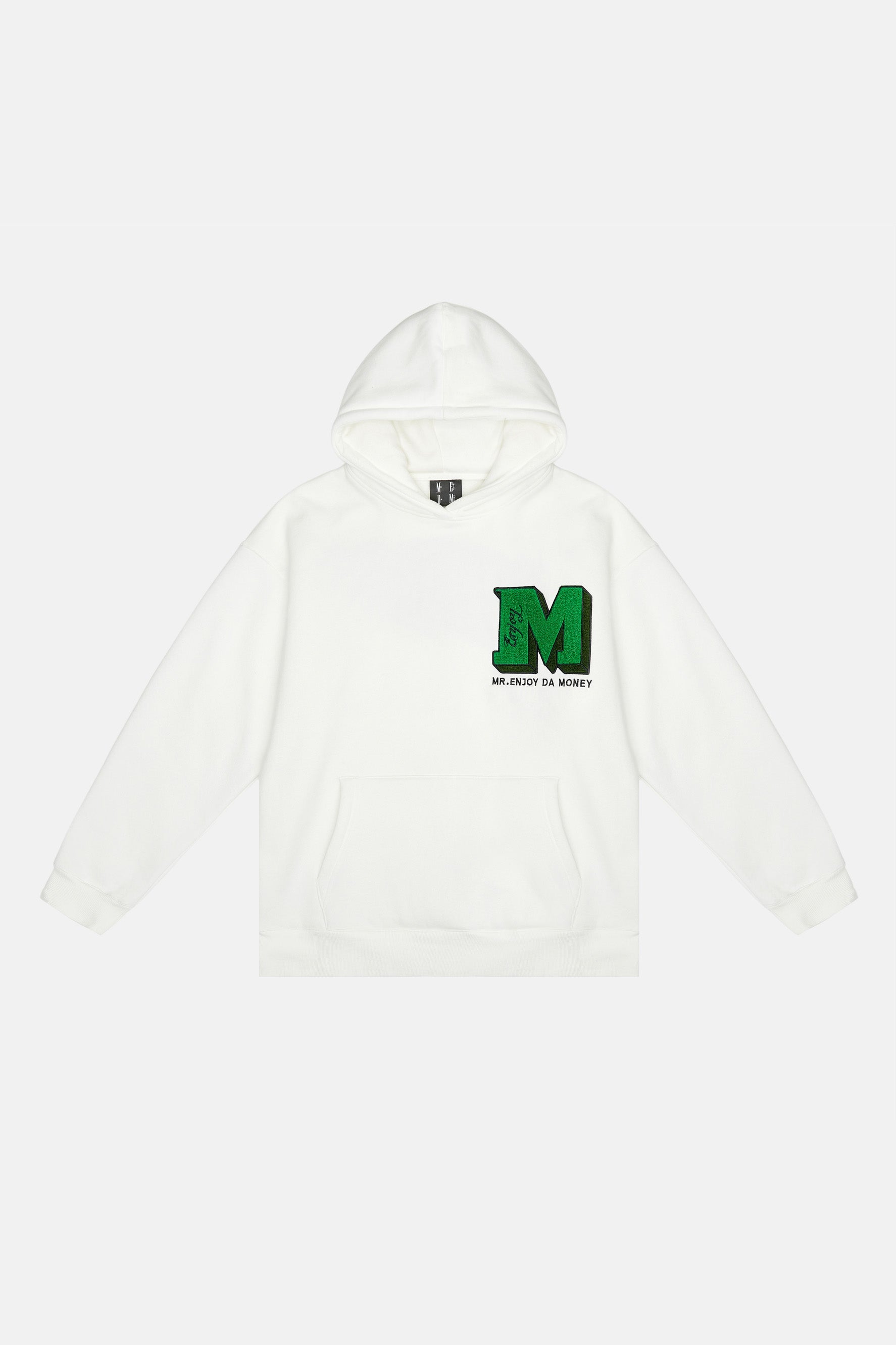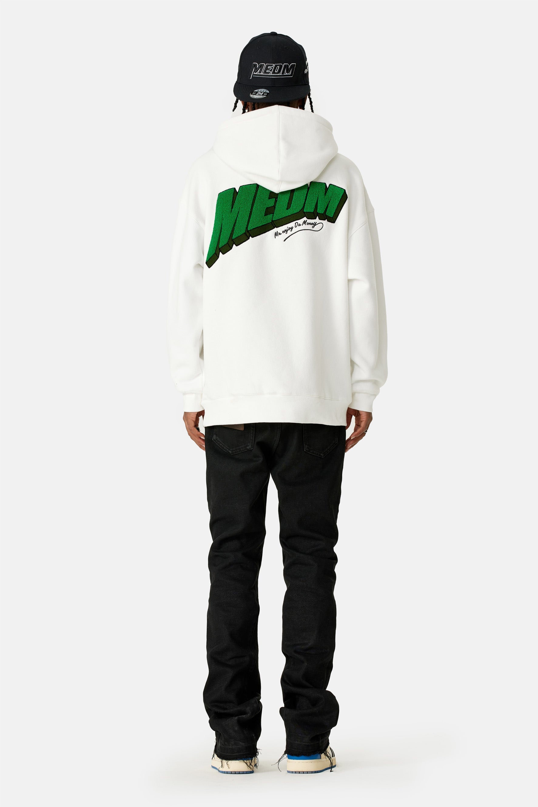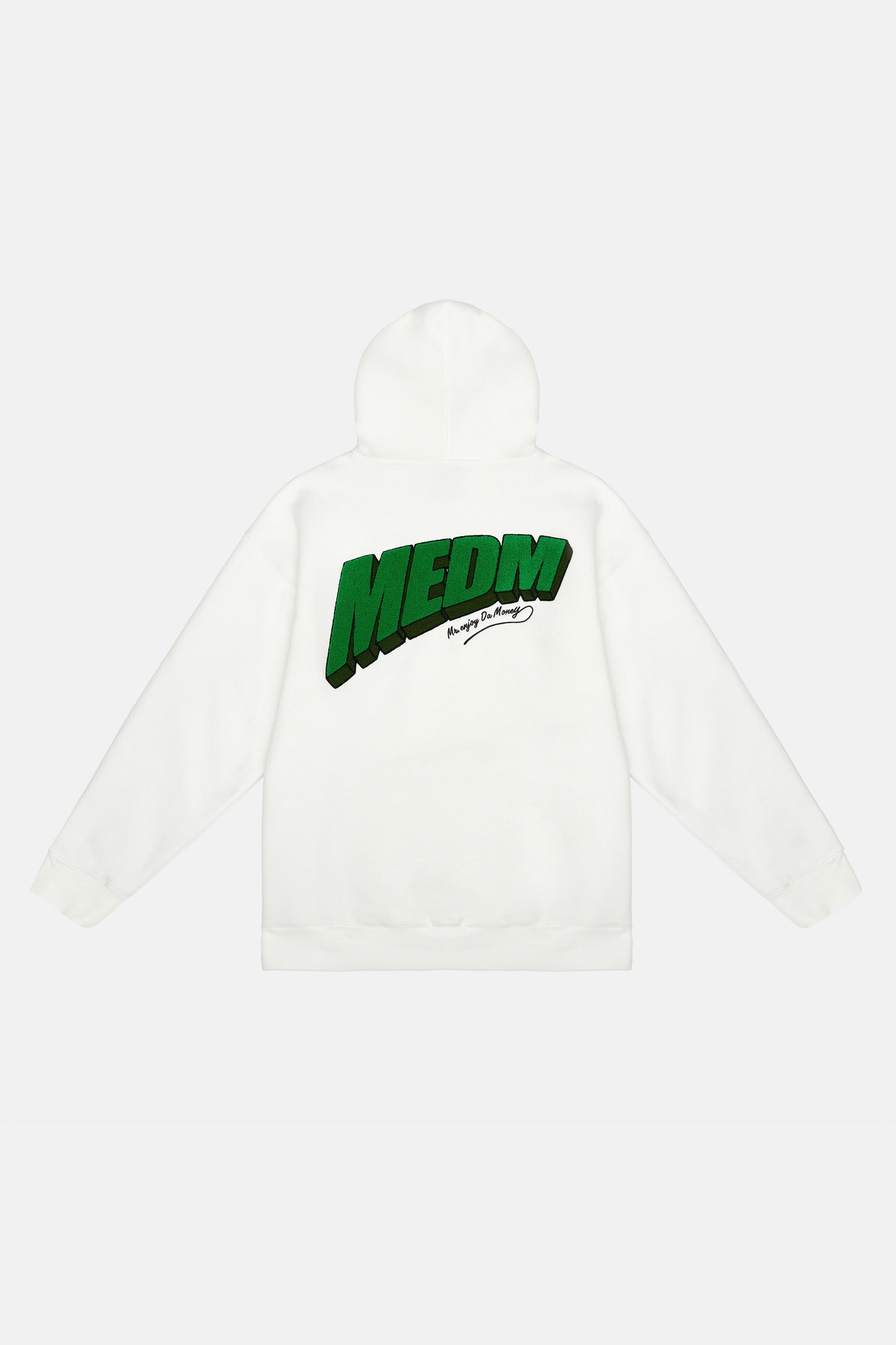 이 후디는 드롭 숄더 디자인, 손목과 허리 부분에 골지 디테일이 있어 여유로운 핏이 특징입니다. 앞면과 뒷면에 Medm 자수 로고가 있습니다.
