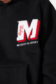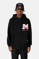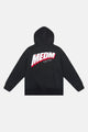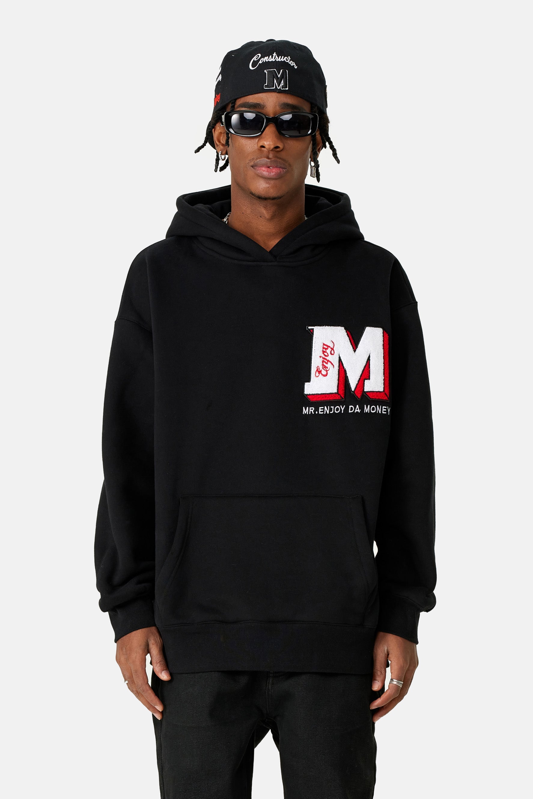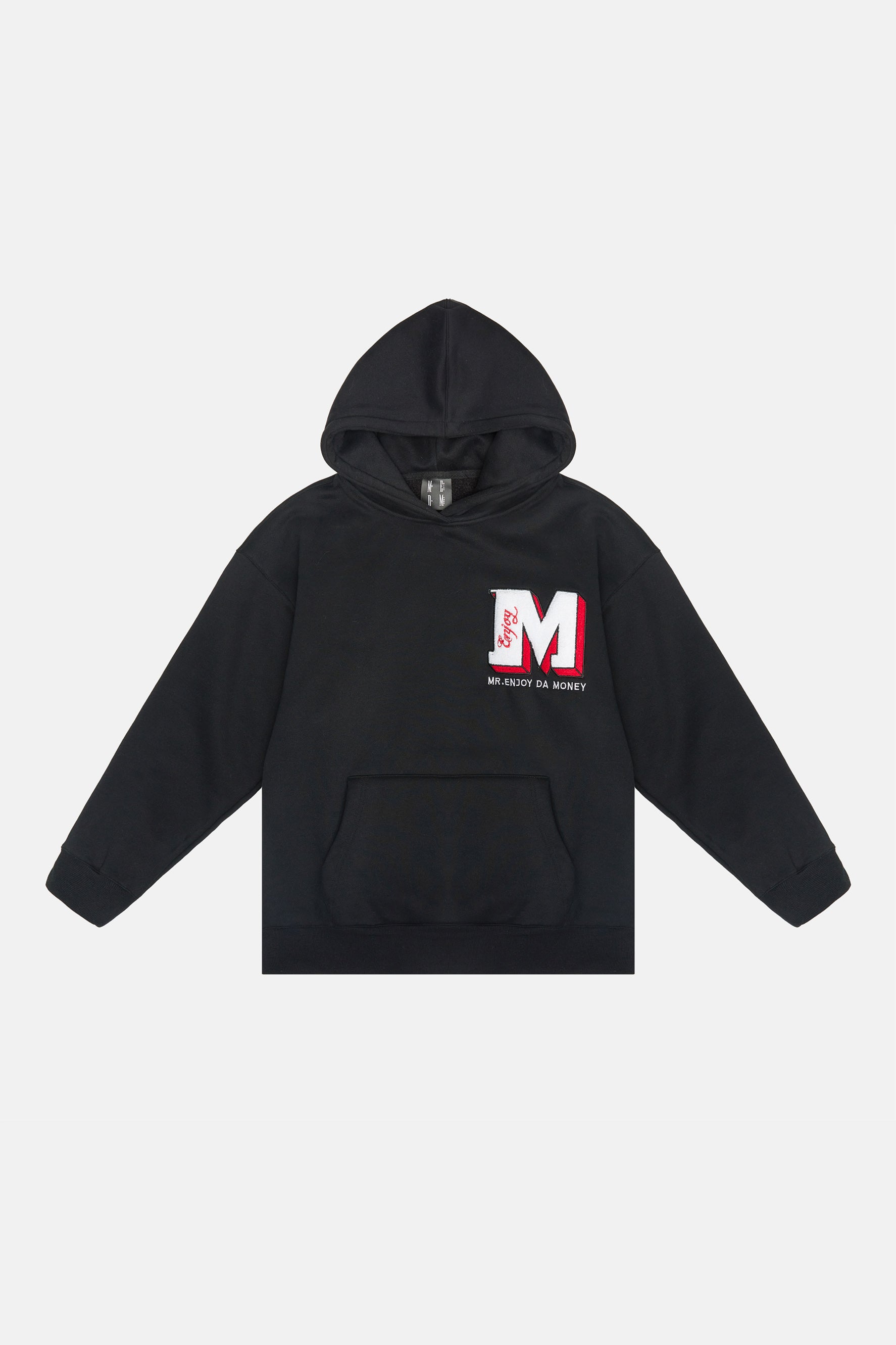 이 후디는 드롭 숄더 디자인, 손목과 허리 부분에 골지 디테일이 있어 여유로운 핏이 특징입니다. 앞면과 뒷면에 Medm 자수 로고가 있습니다.