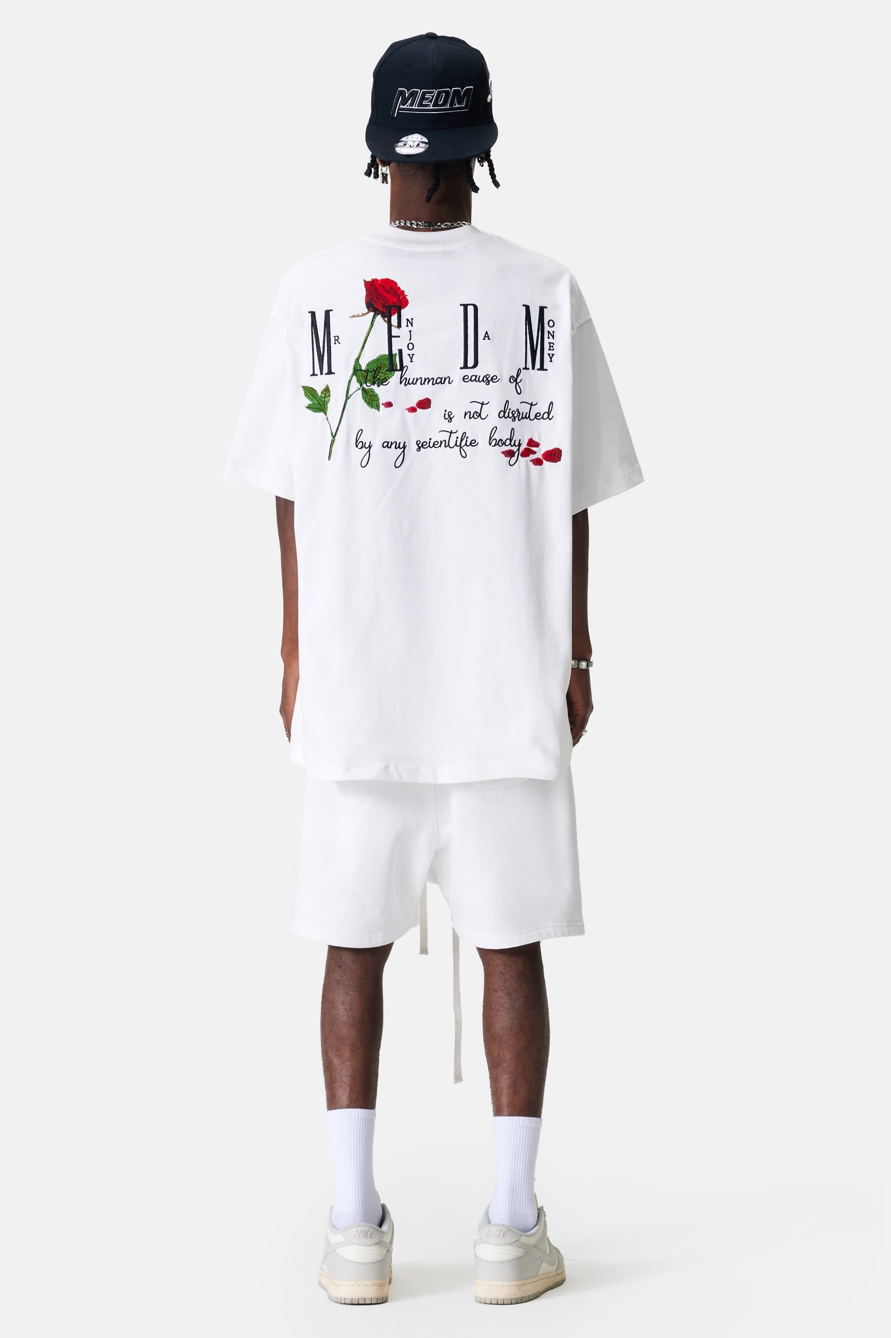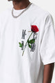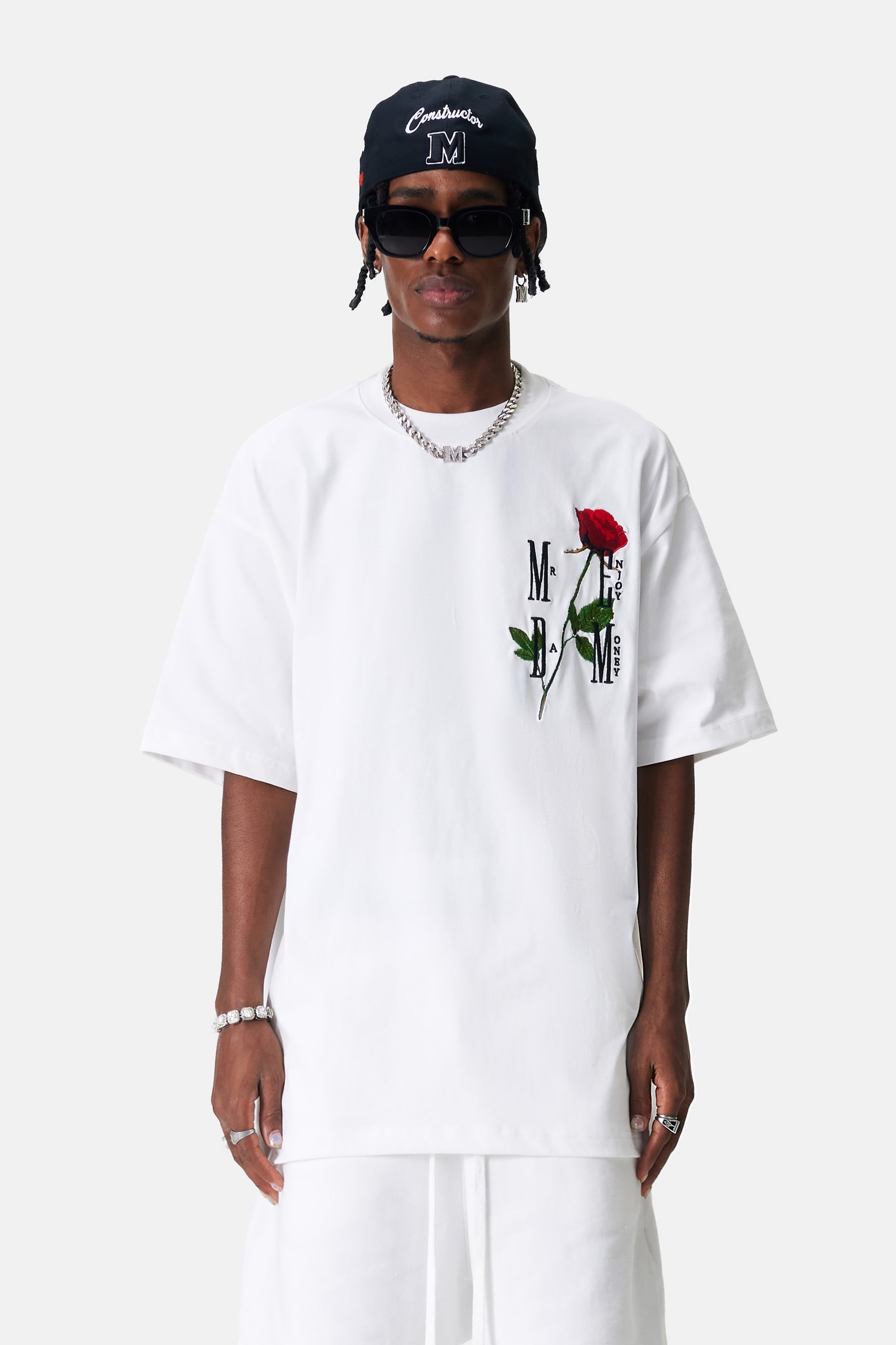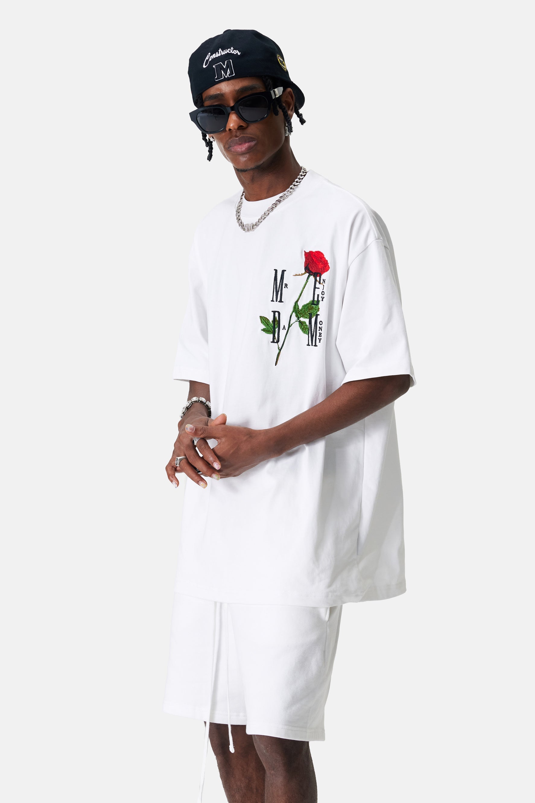 약간 루즈한 핏으로 제작된 이 의류는 왼쪽 가슴에 장미 자수가 특징입니다. 컴팩트한 코튼 저지 베이스에 살짝 드롭된 어깨가 돋보이는 루즈한 핏으로 제작 되었습니다 .