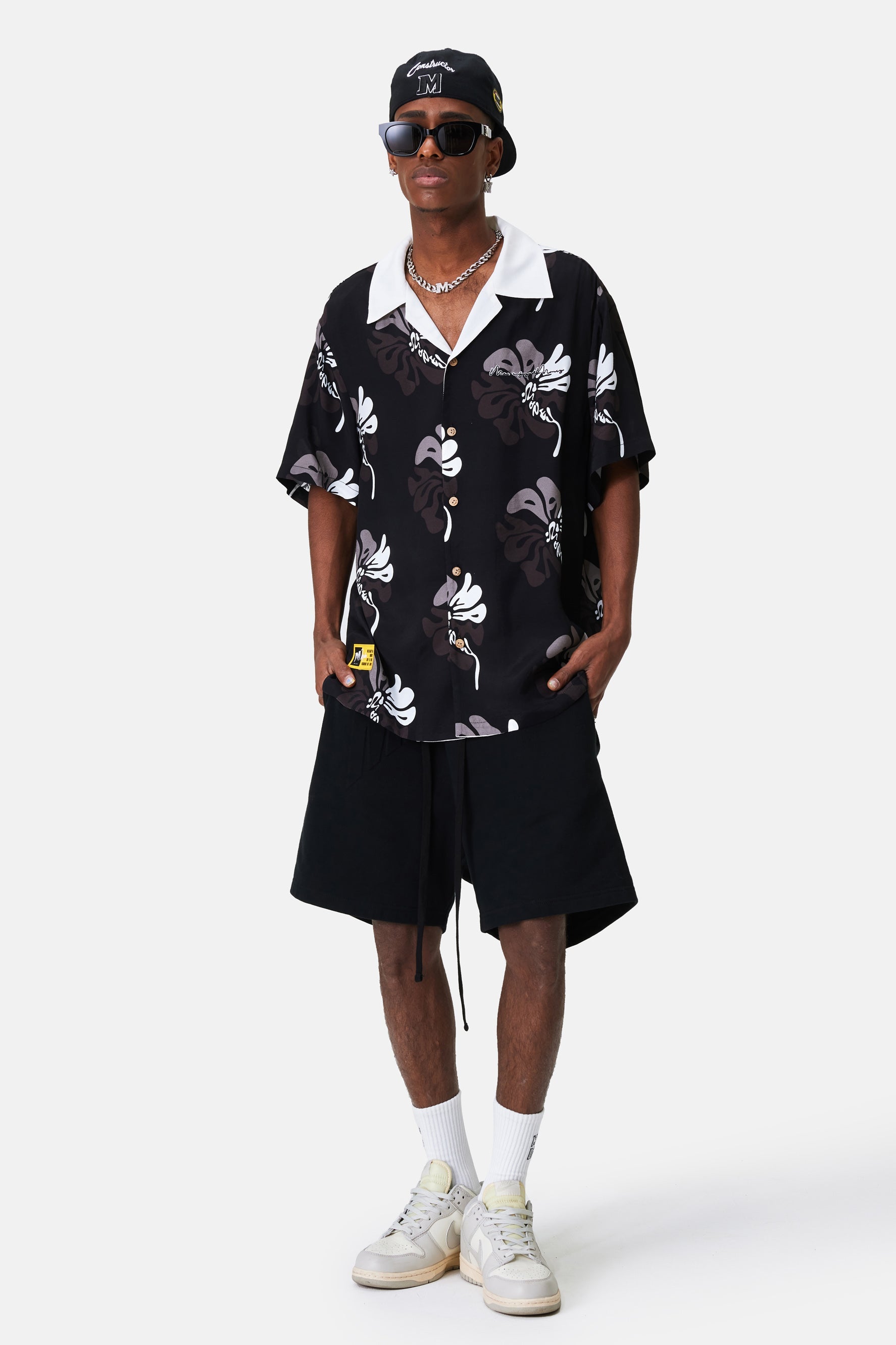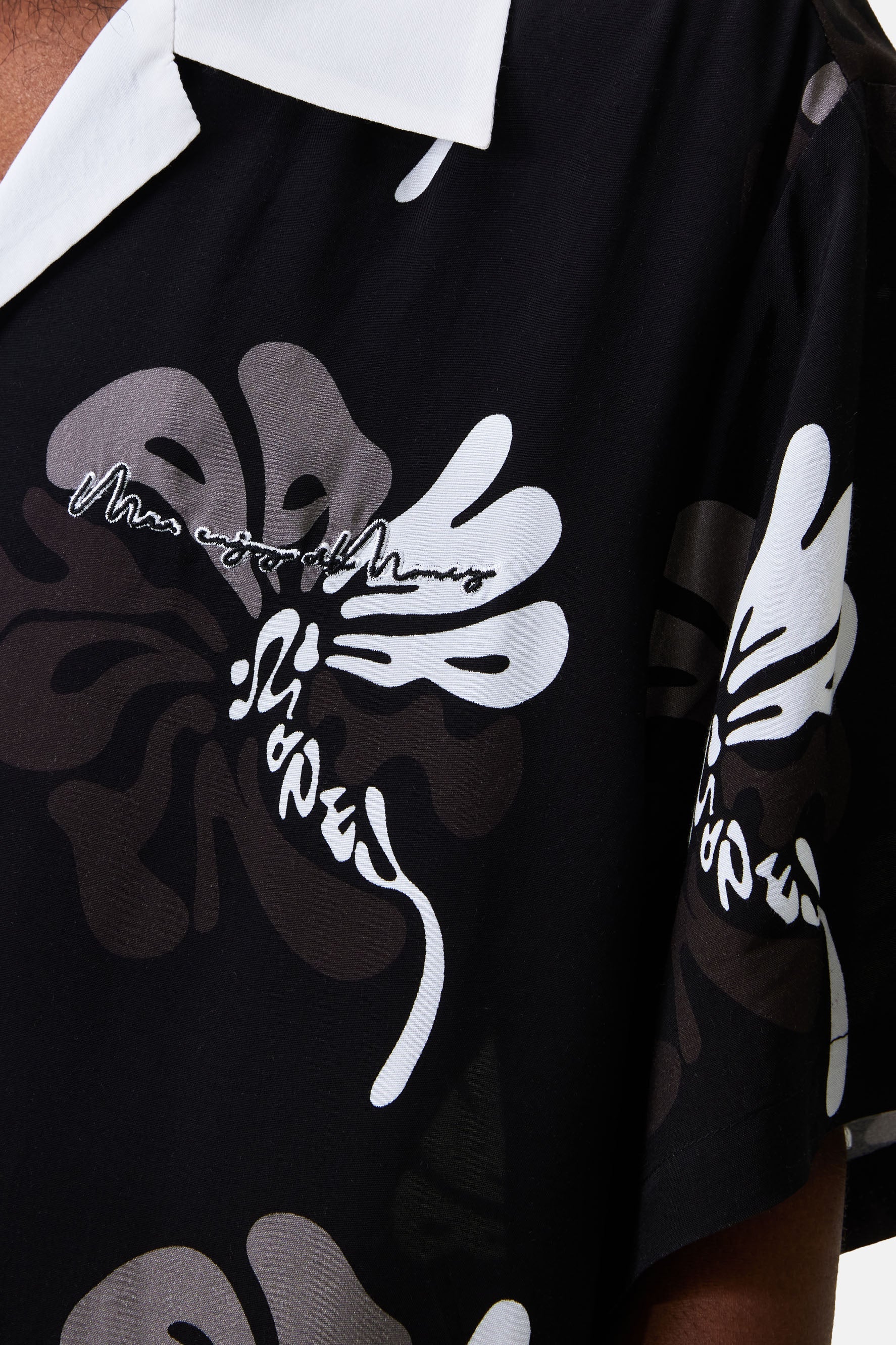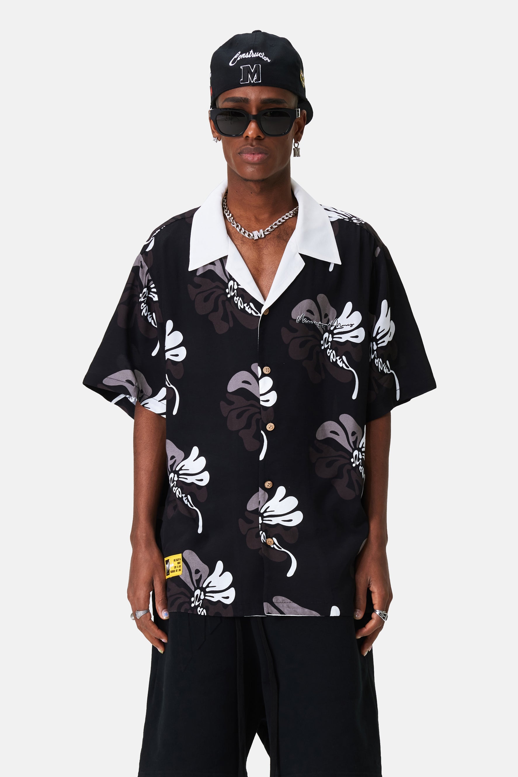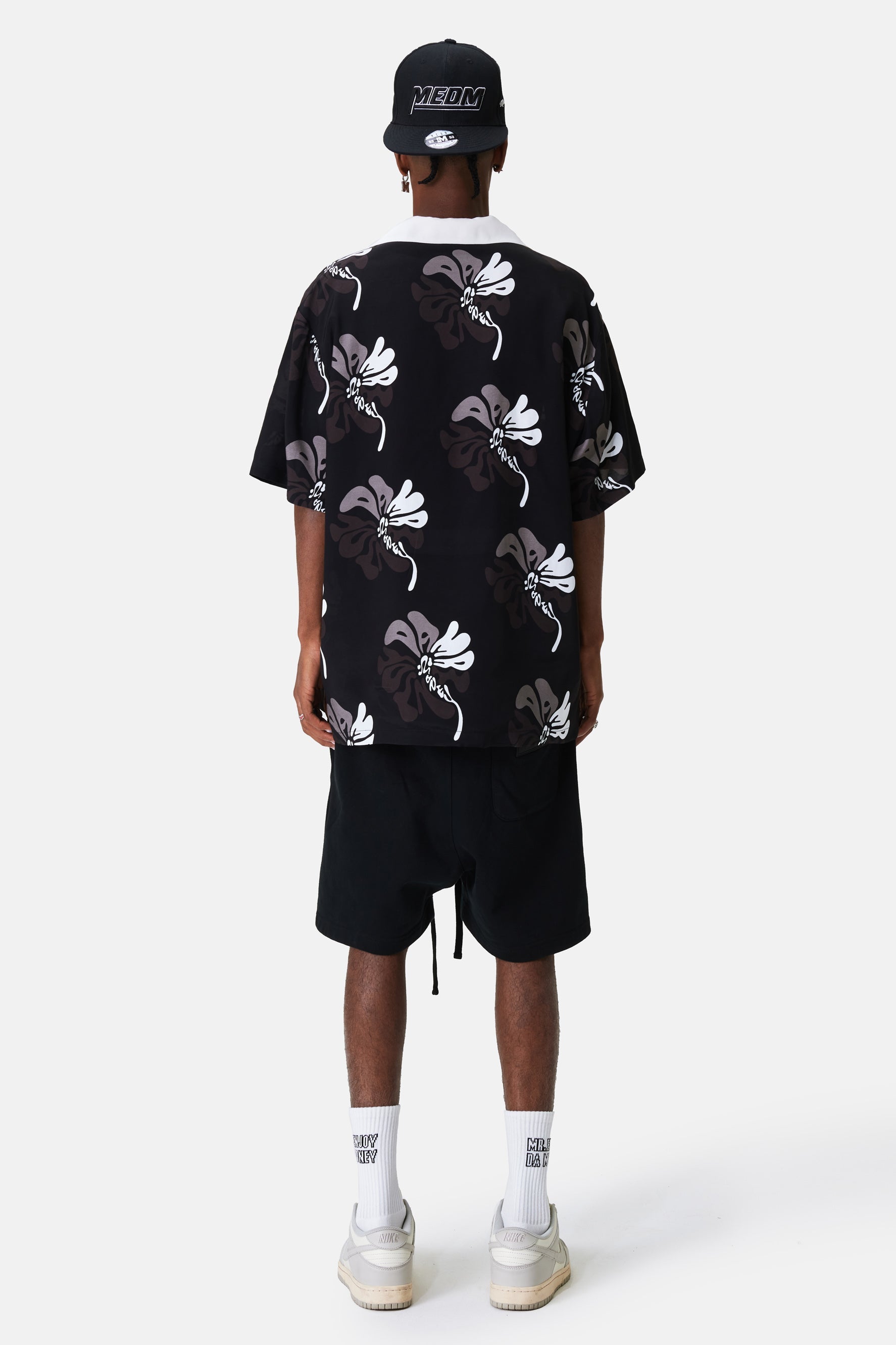 전체적으로 플라워 패턴 프린트가 돋보이는 셔츠입니다. 가슴 부분에 Medm 자수 로고가 있습니다. 디테일에는 직선형 밑단과 쿠반 칼라가 포함됩니다.