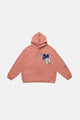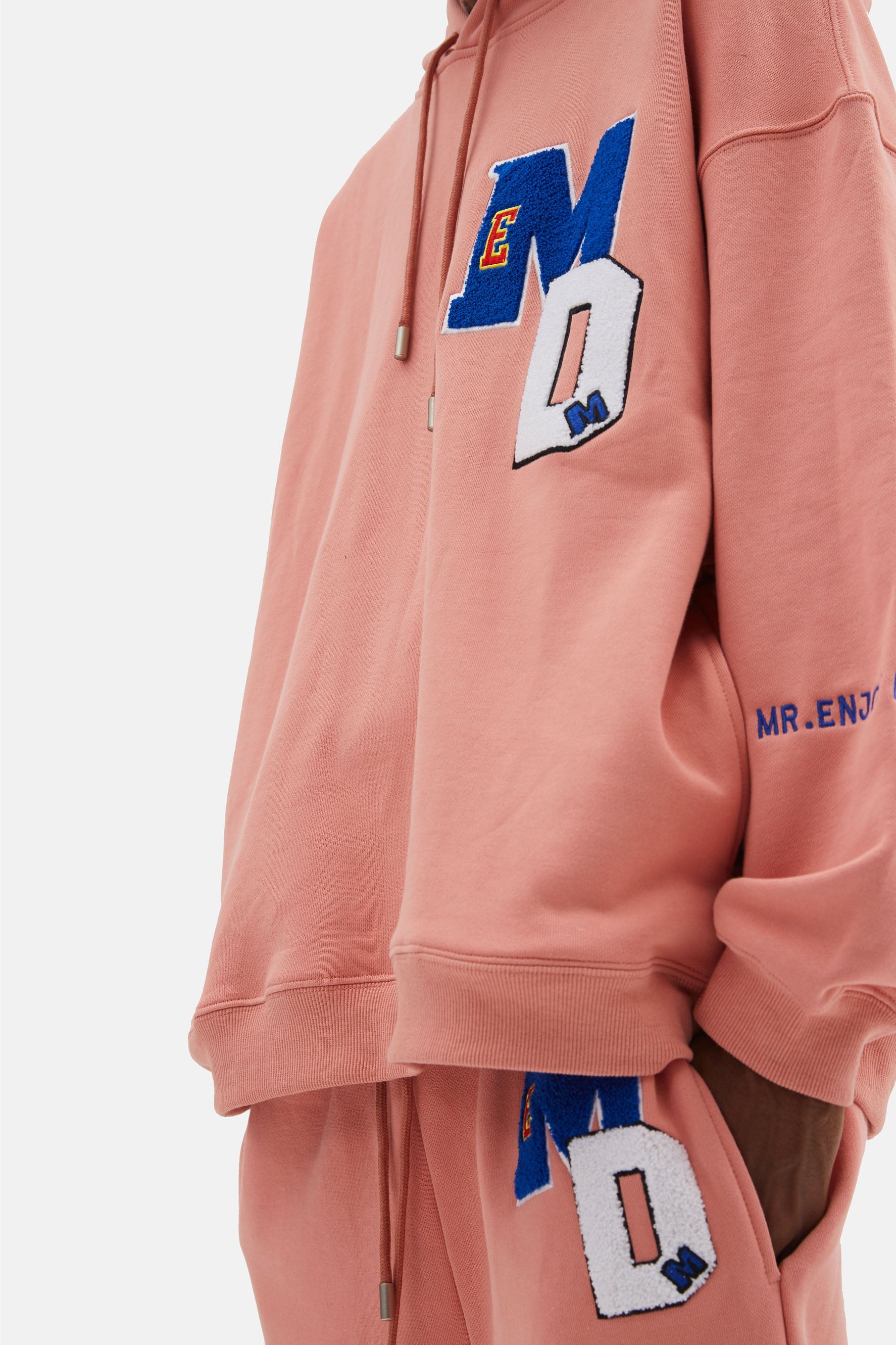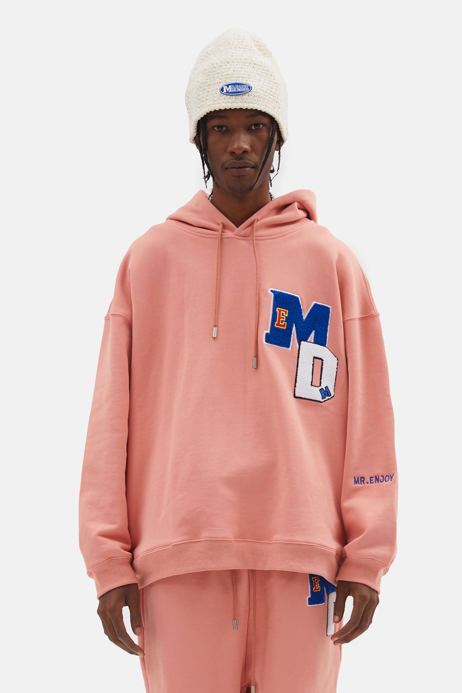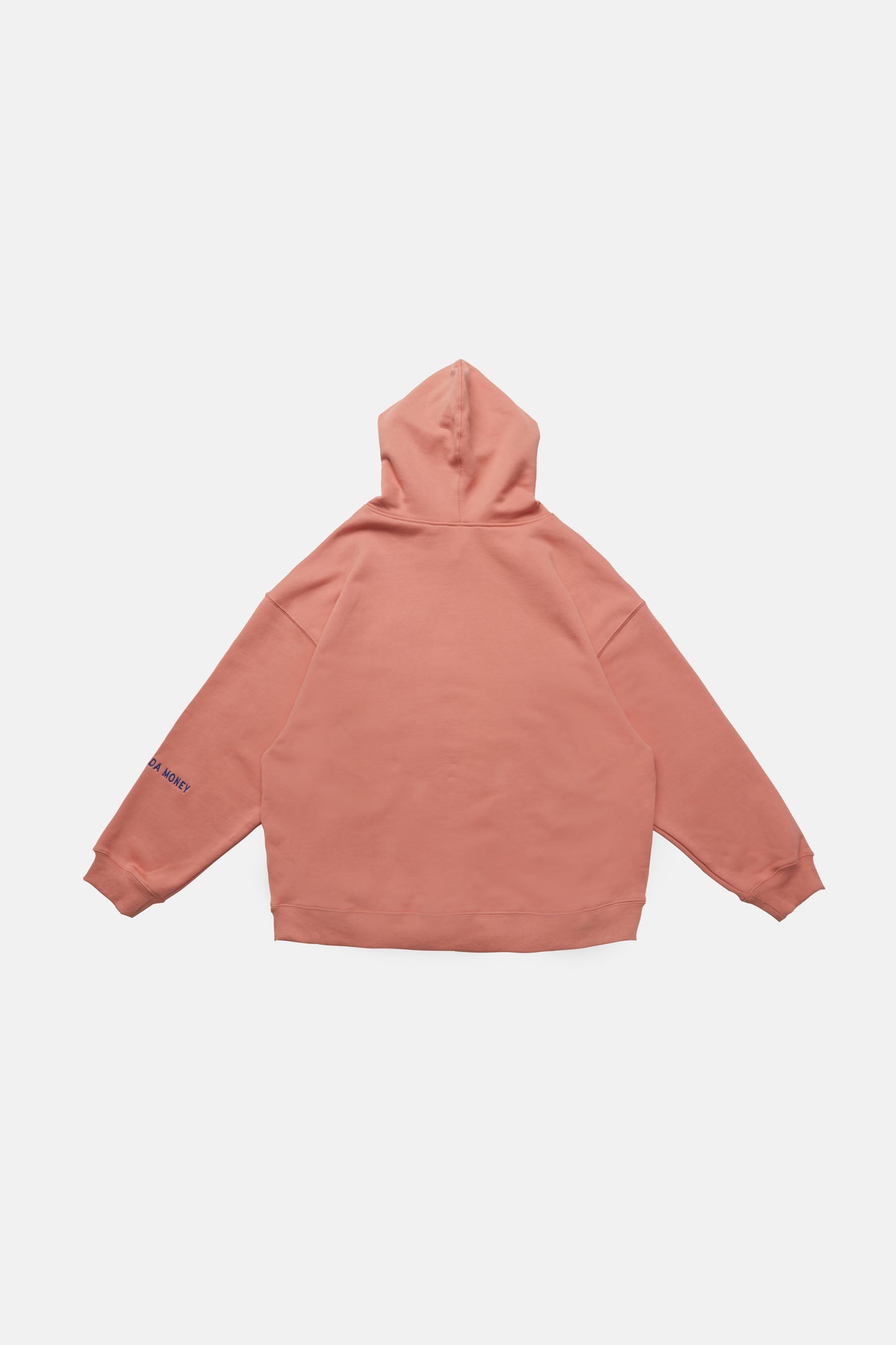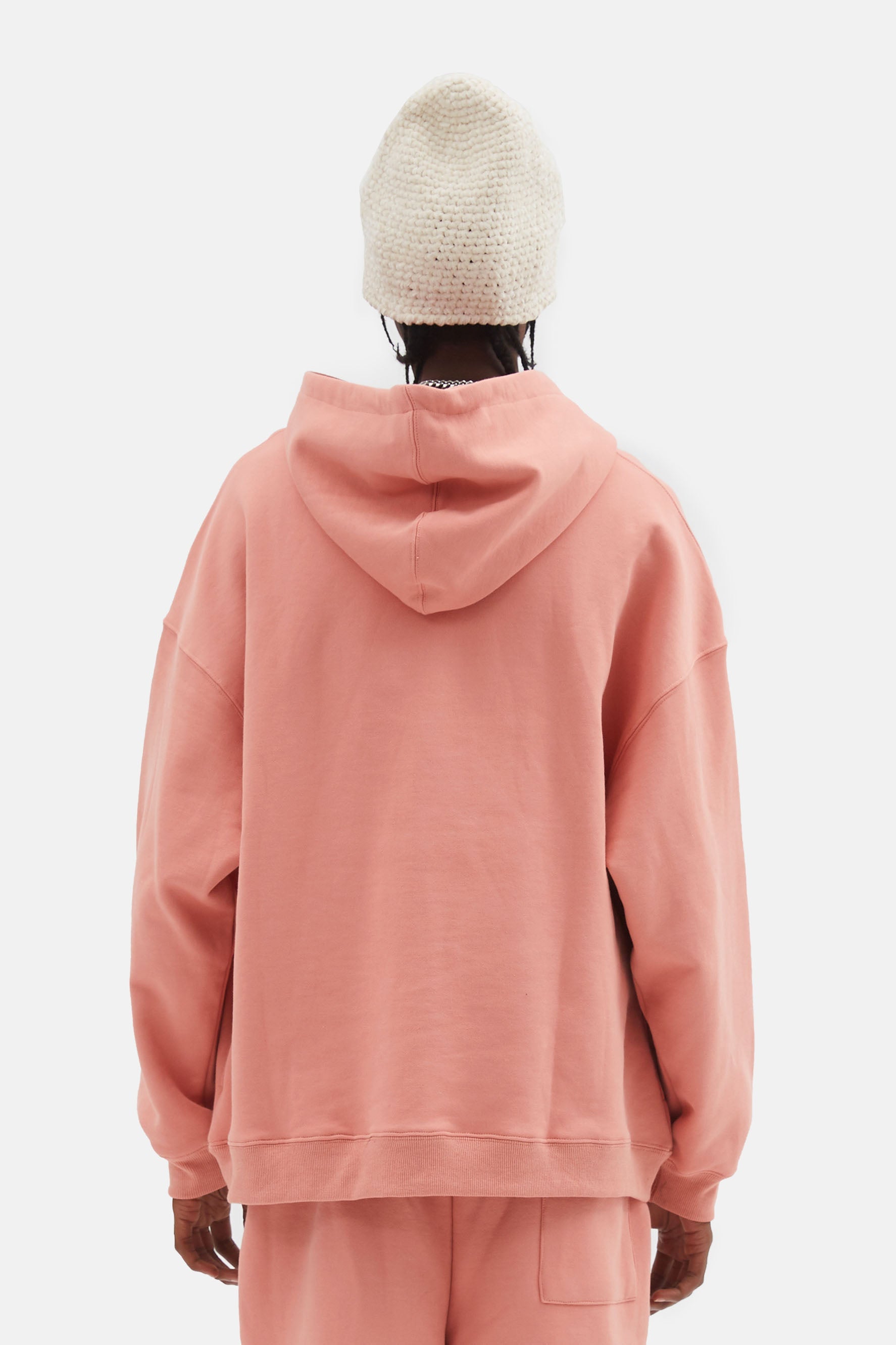 이 후디는 드롭 숄더 디자인, 손목과 허리 부분에 골지 디테일이 있어 여유로운 핏이 특징입니다.