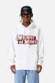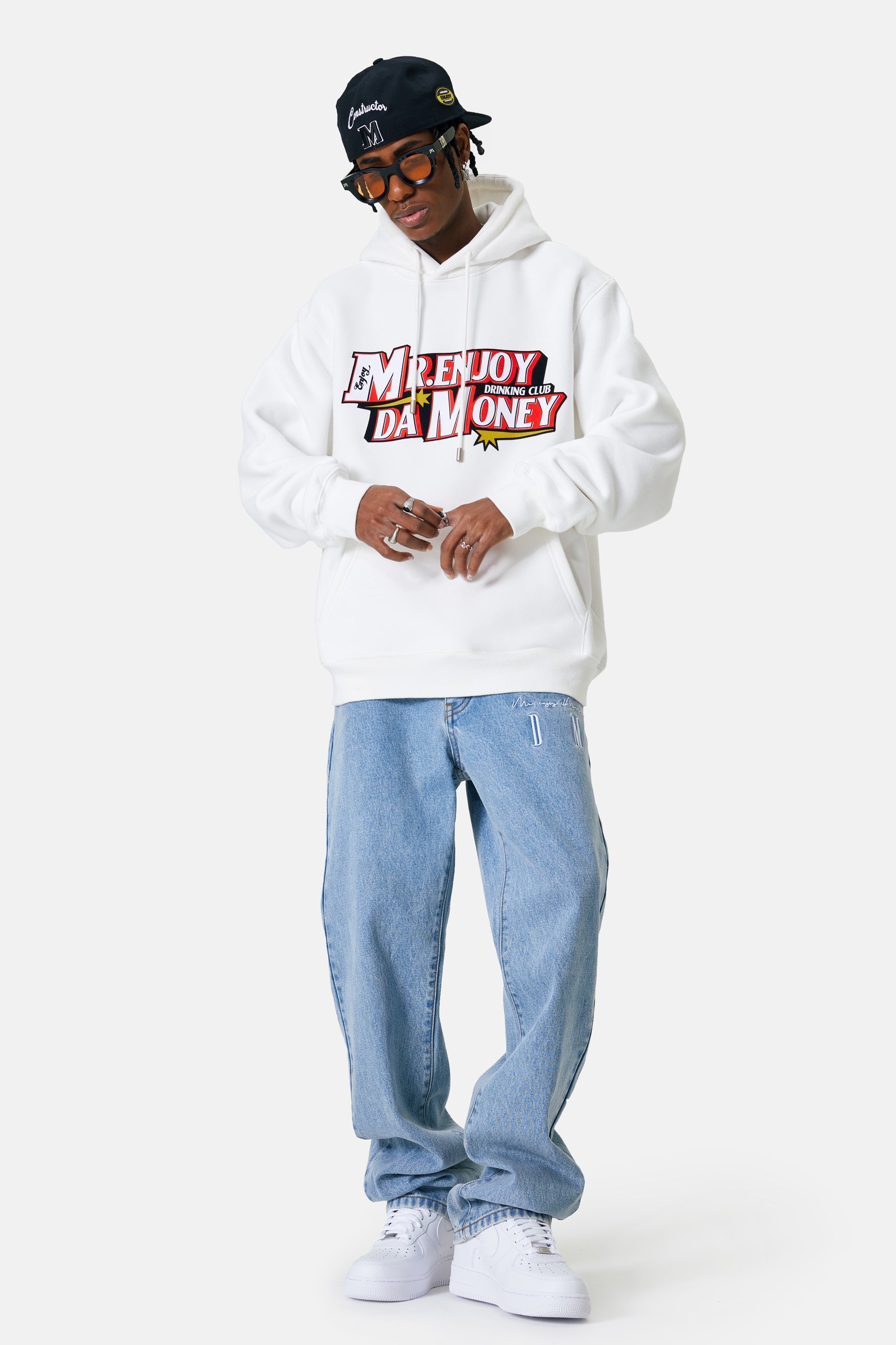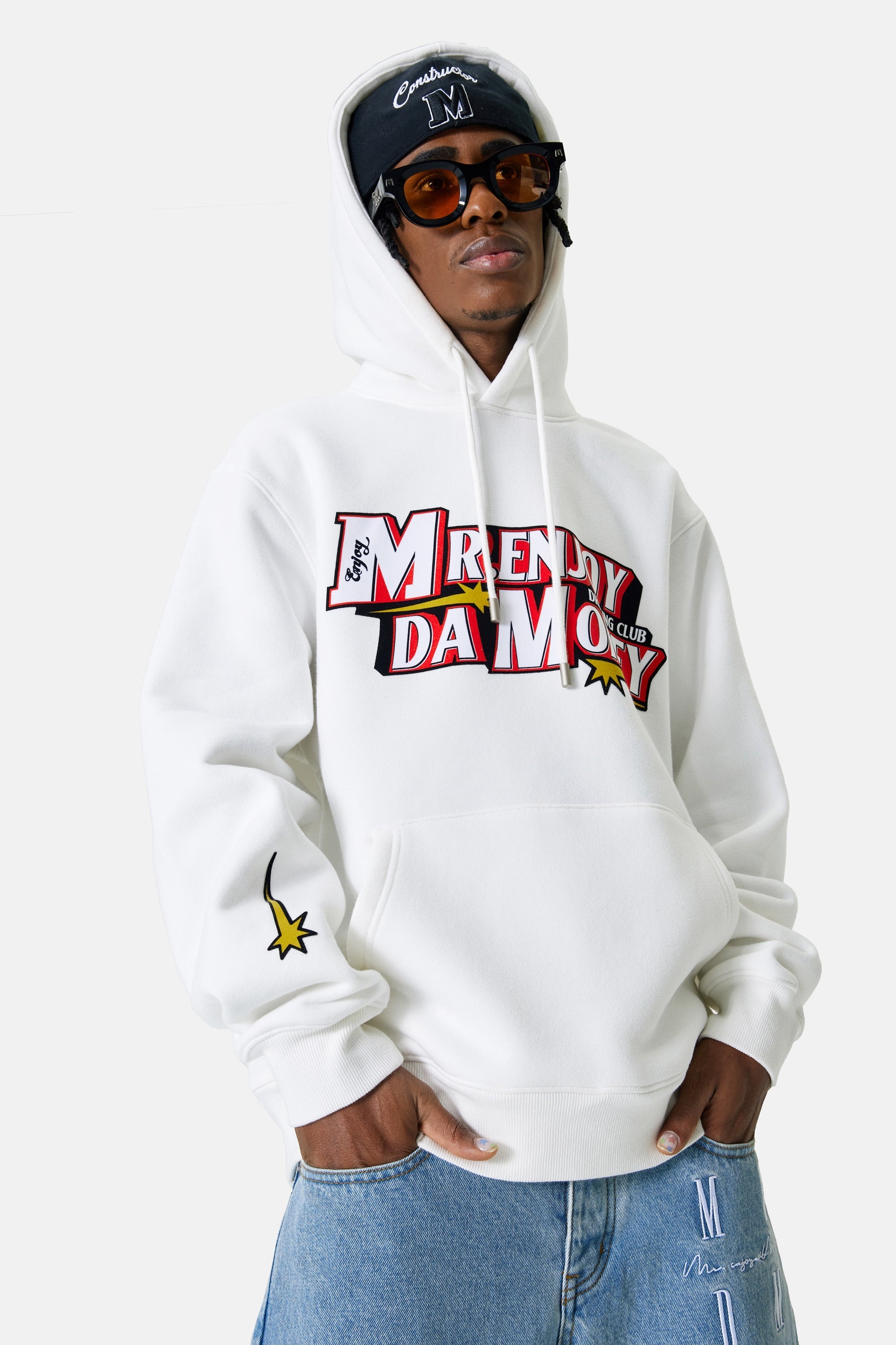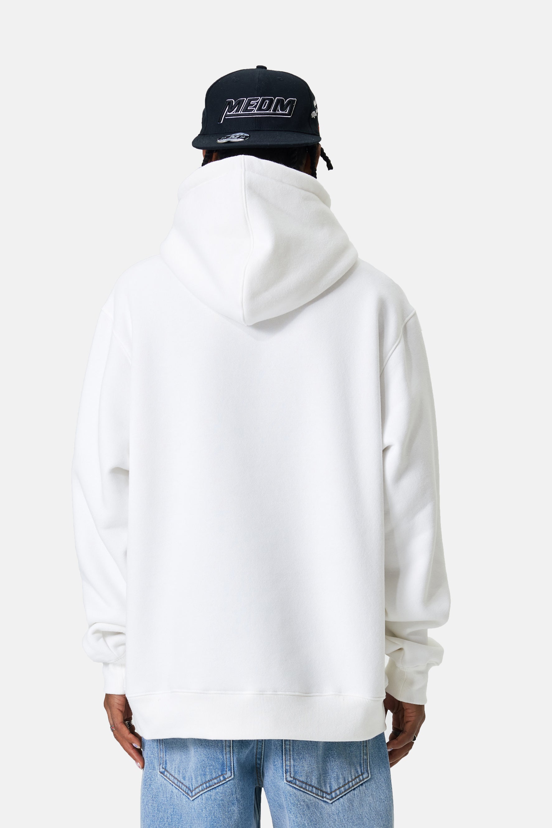 이 후디는 시대를 초월한 헤더 면 플리스 저지 소재로 편안하고 통기성이 뛰어납니다. 전면에 Medm 그래픽이 있고 드롭 숄더 디자인이 특징이며 손목과 허리 부분에 골지가 있습니다.