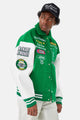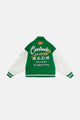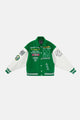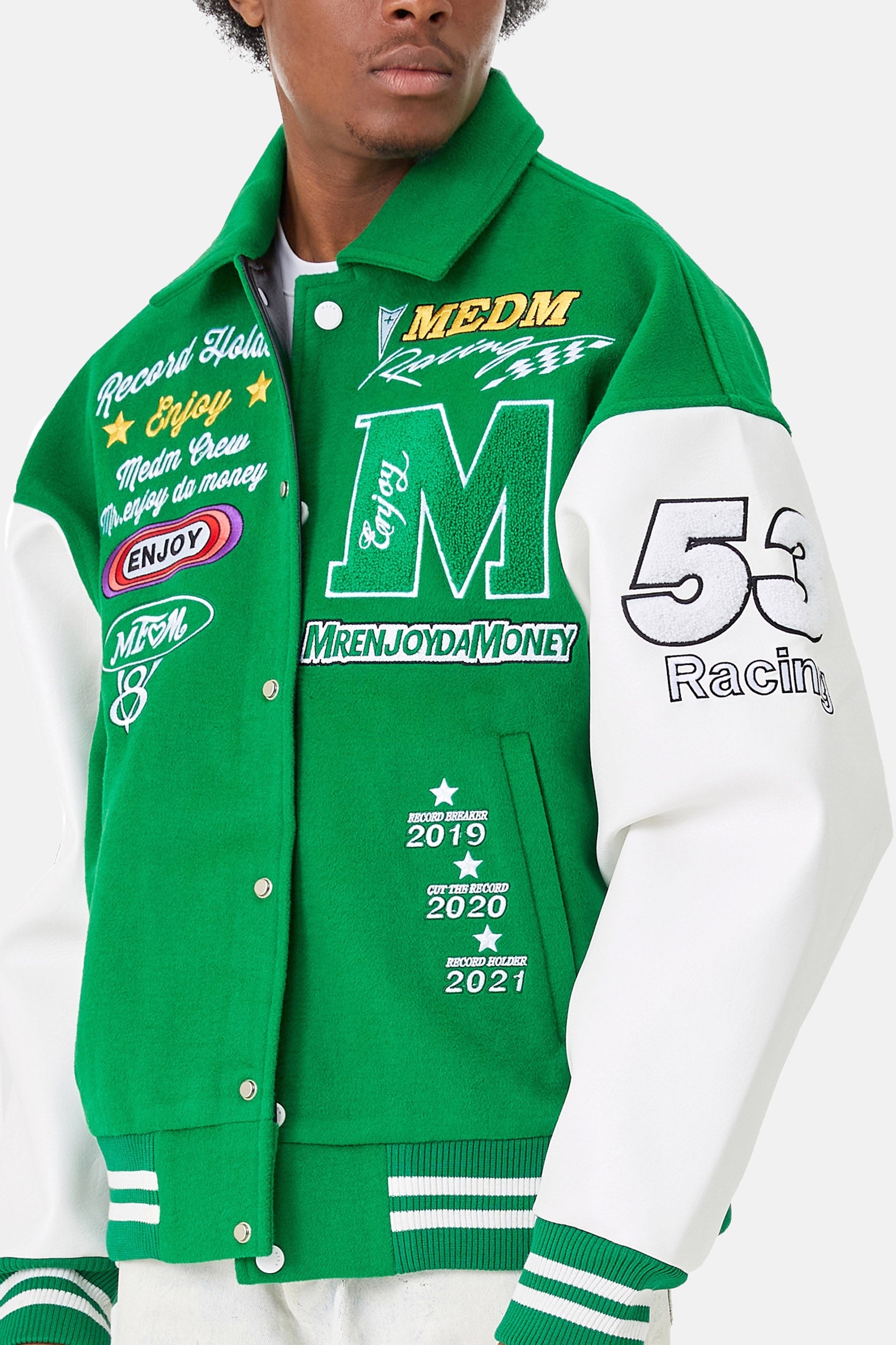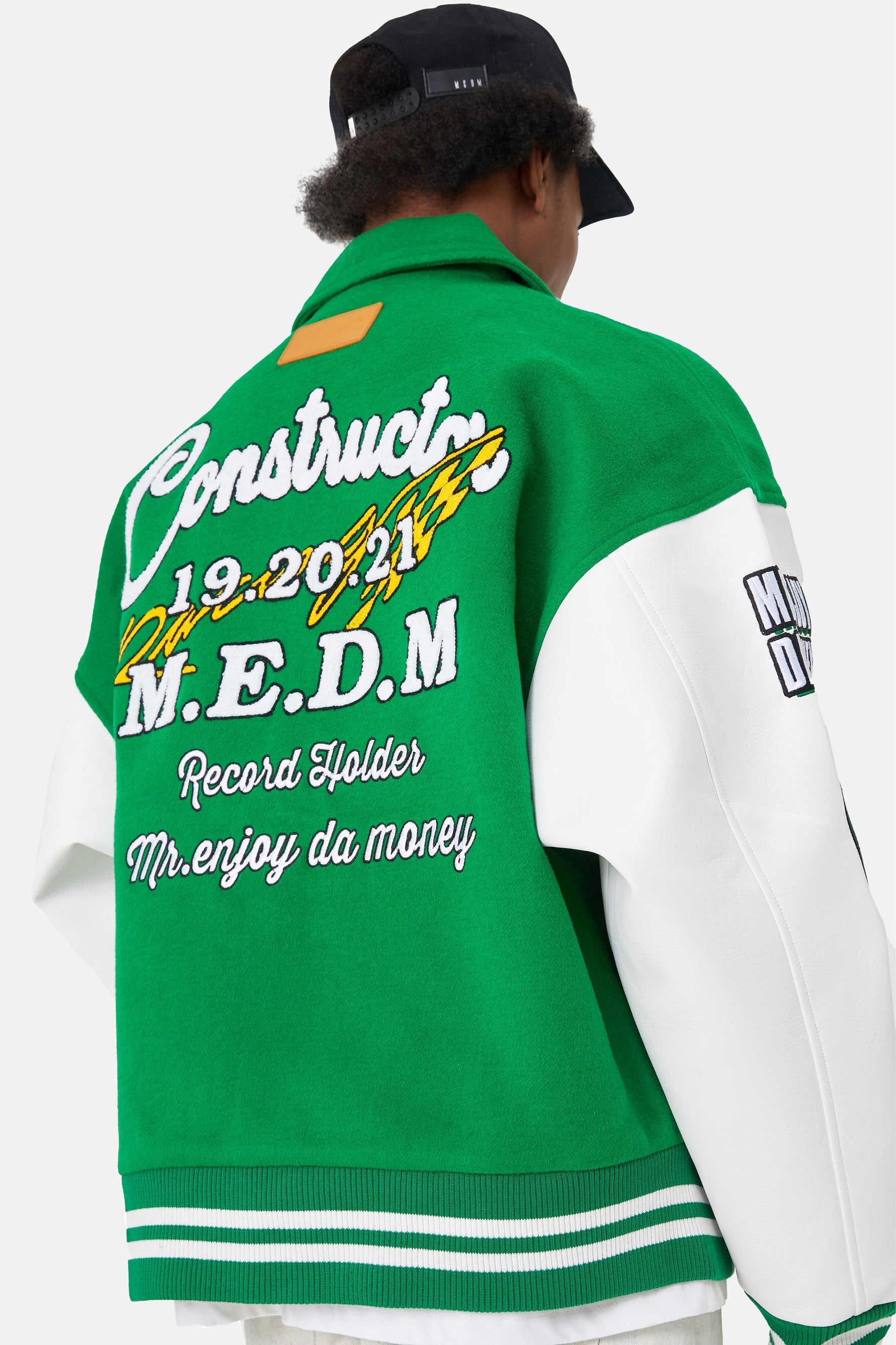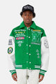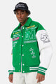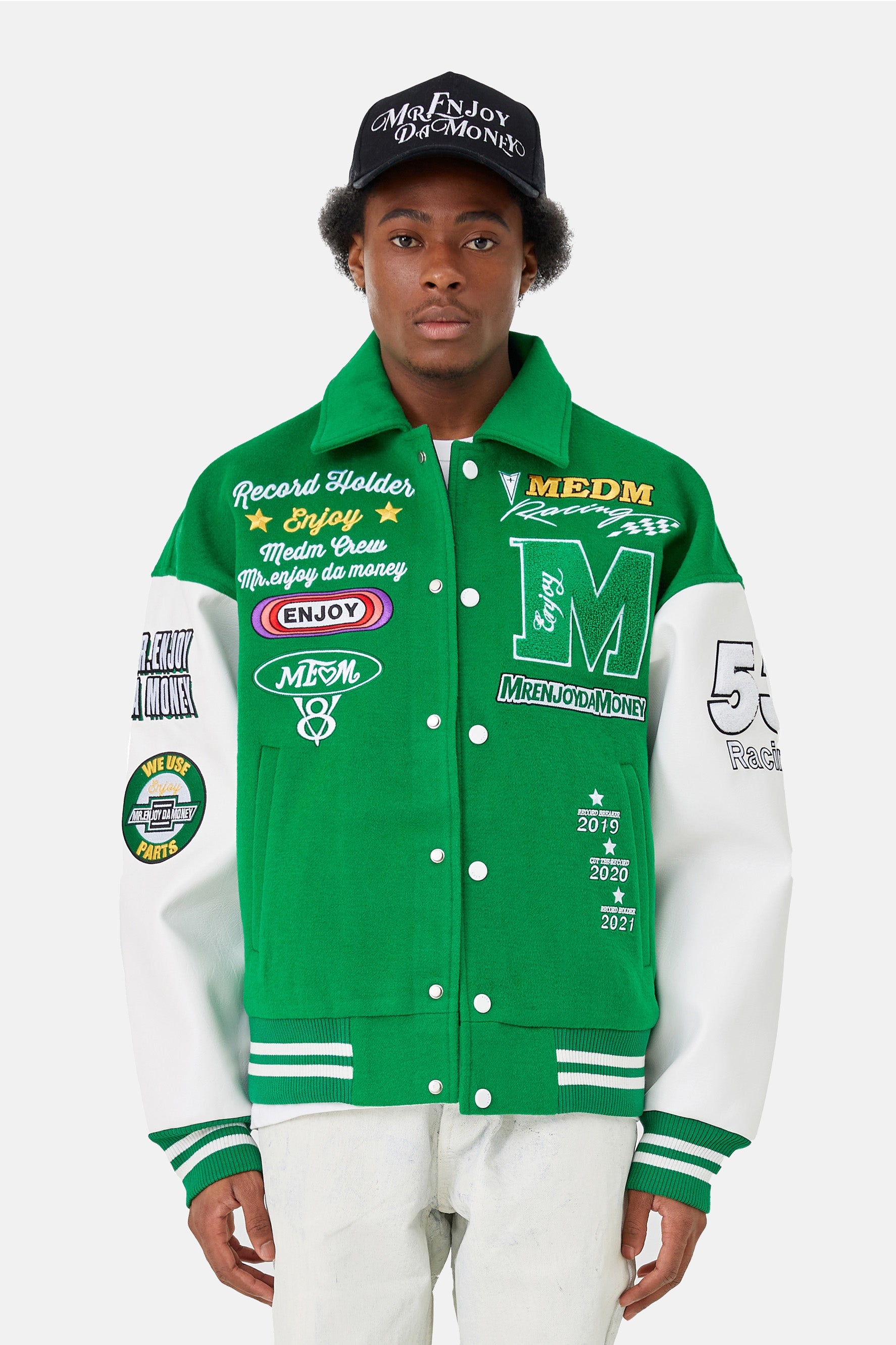 소매, 재킷 앞면과 뒷면에 자수 그래픽이 있습니다. 버튼업 클로저.