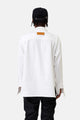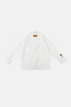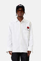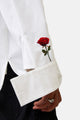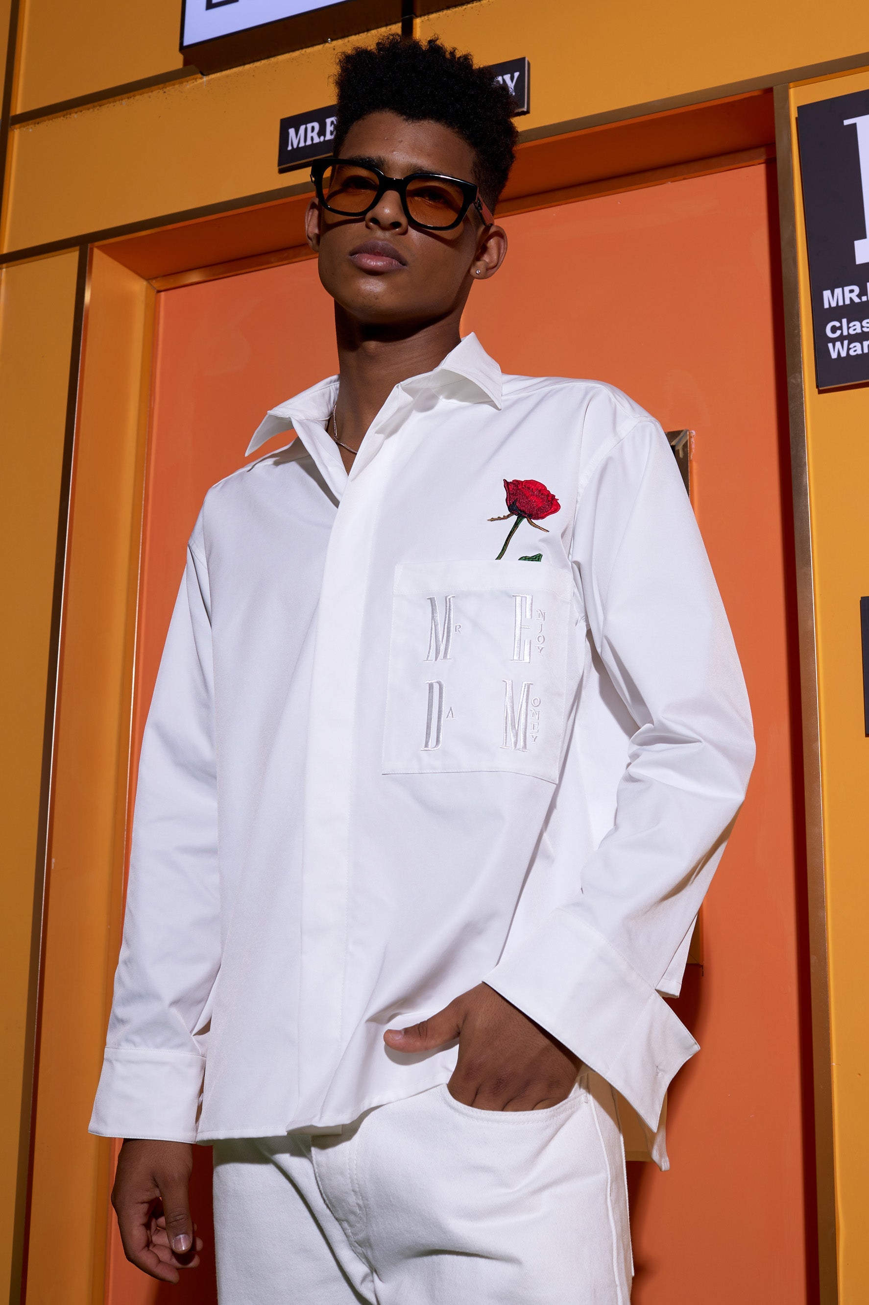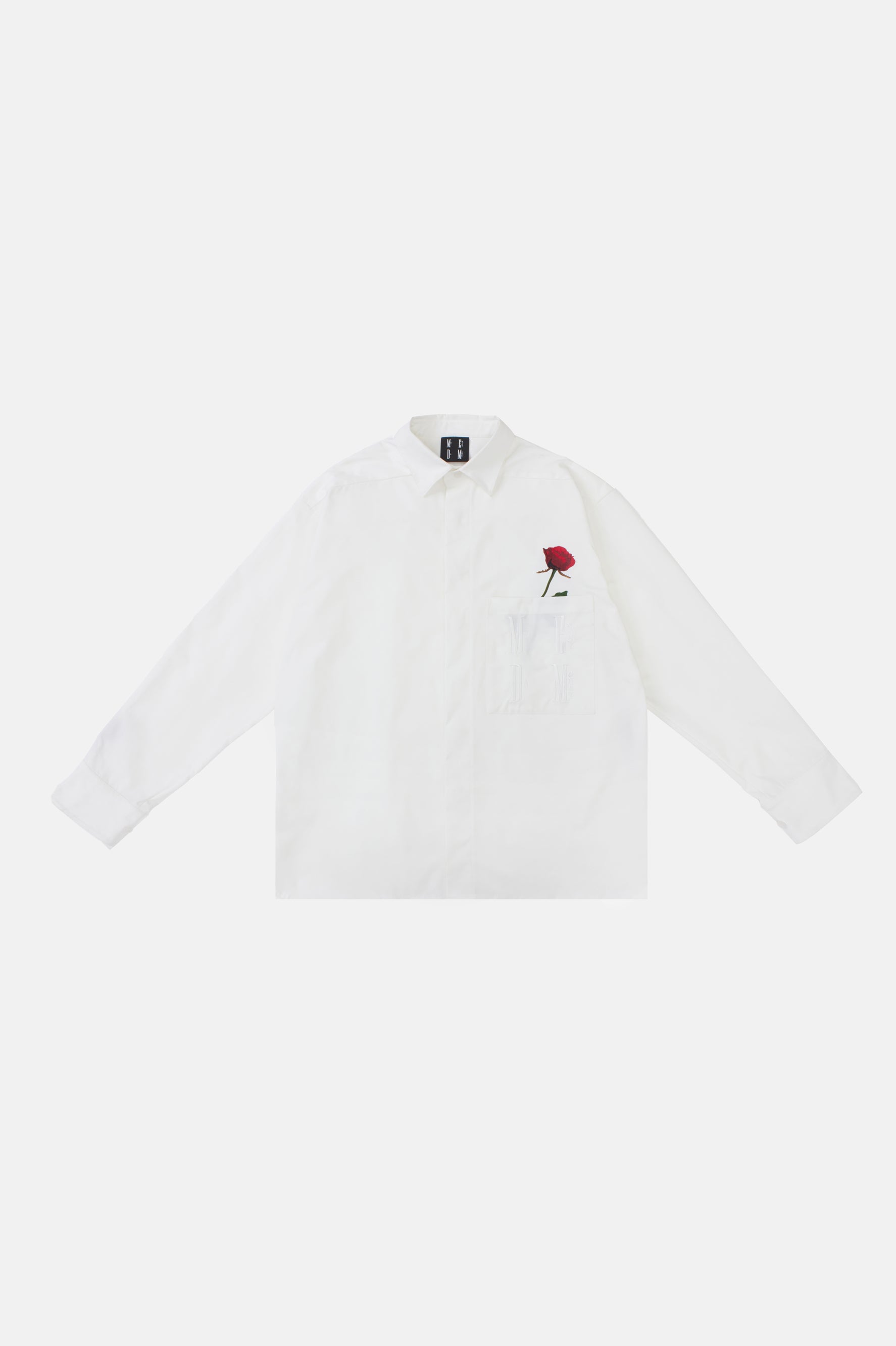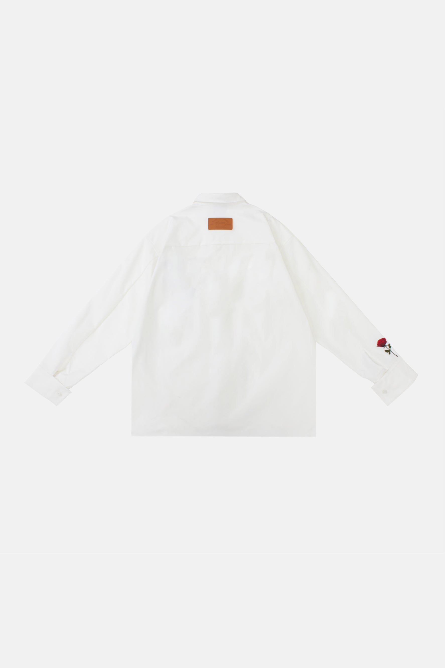 이 긴 소매 흰색 셔츠는 여유로운 핏과 왼쪽 주머니에 장미 자수가 특징입니다.