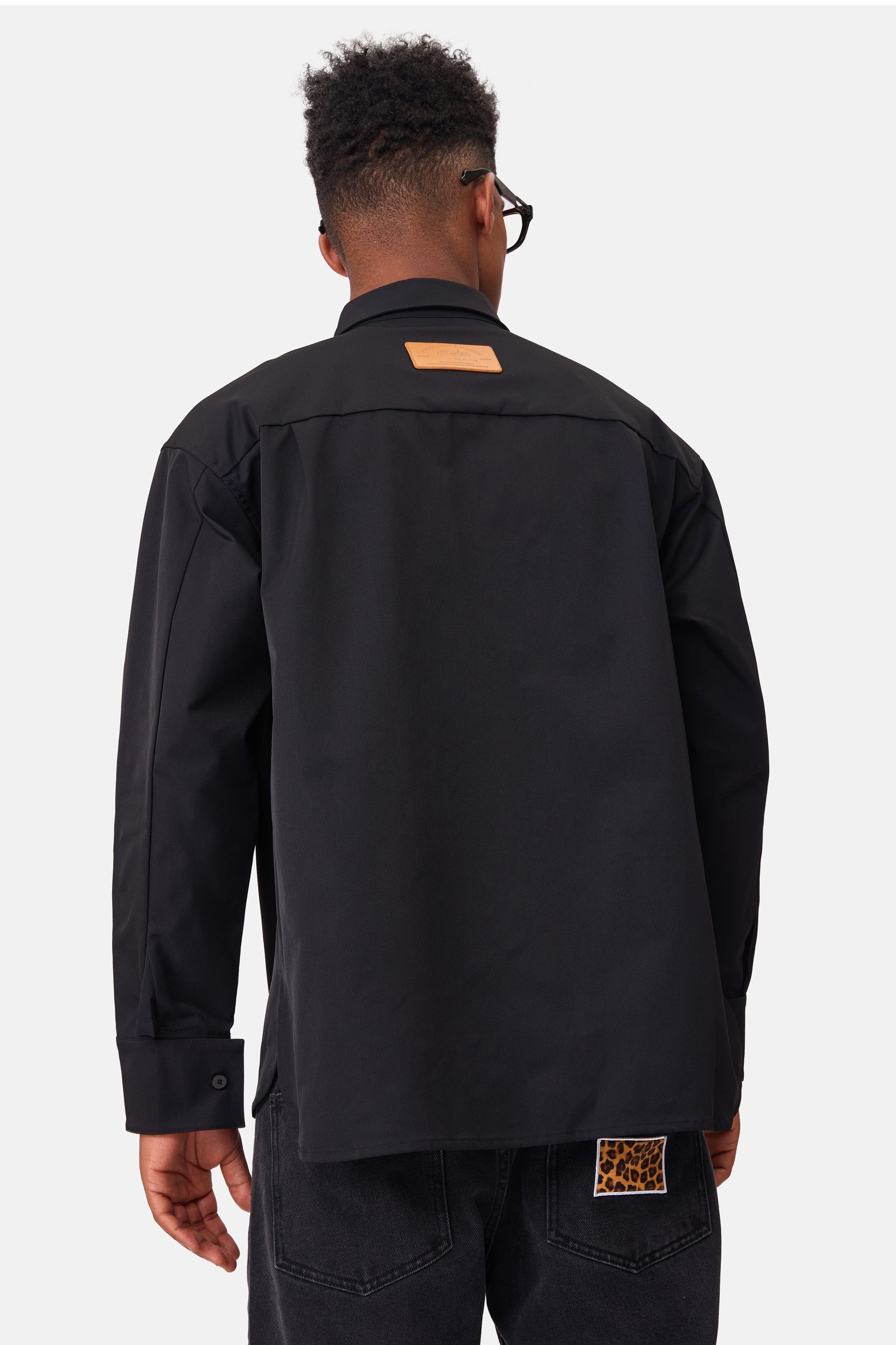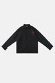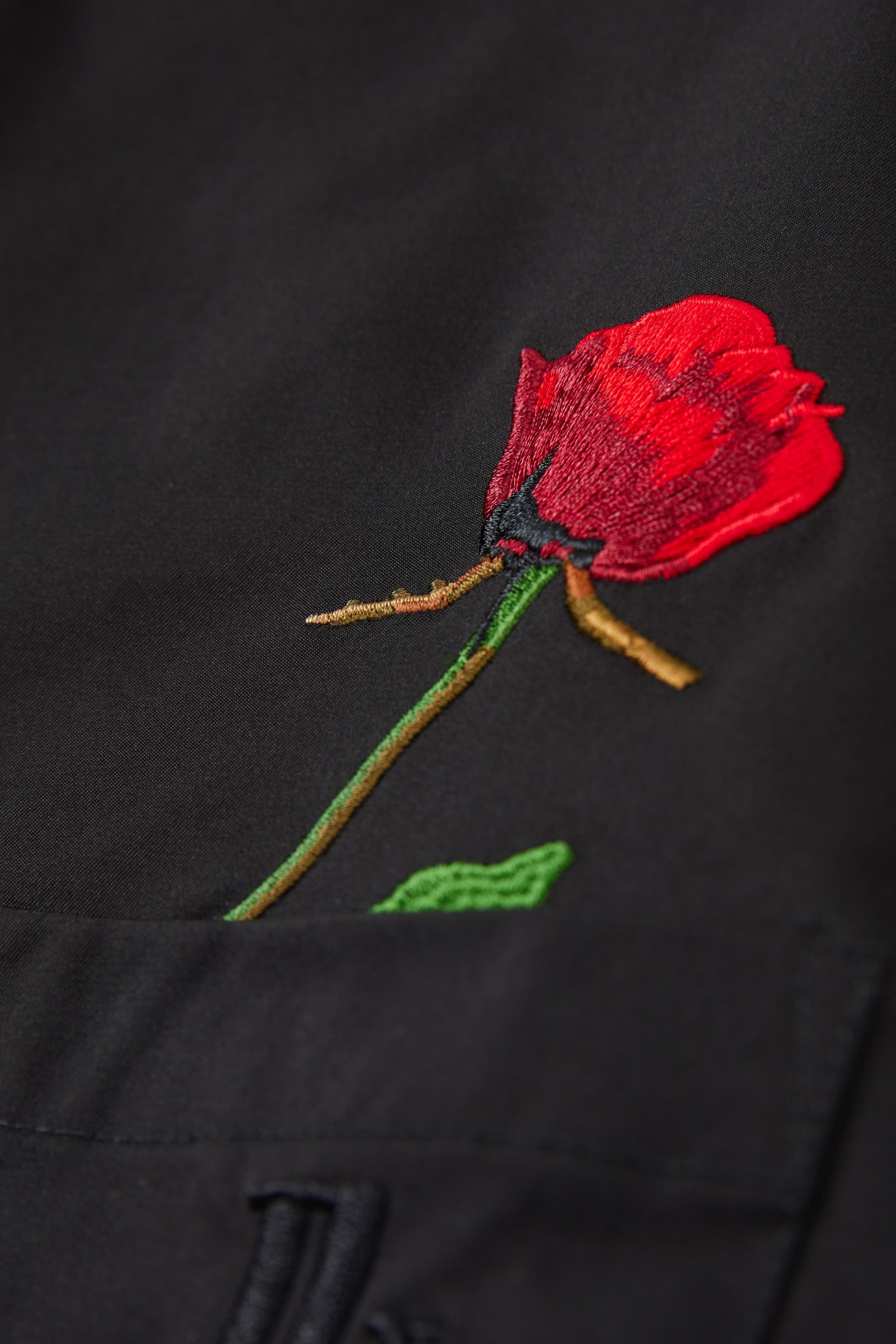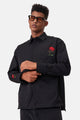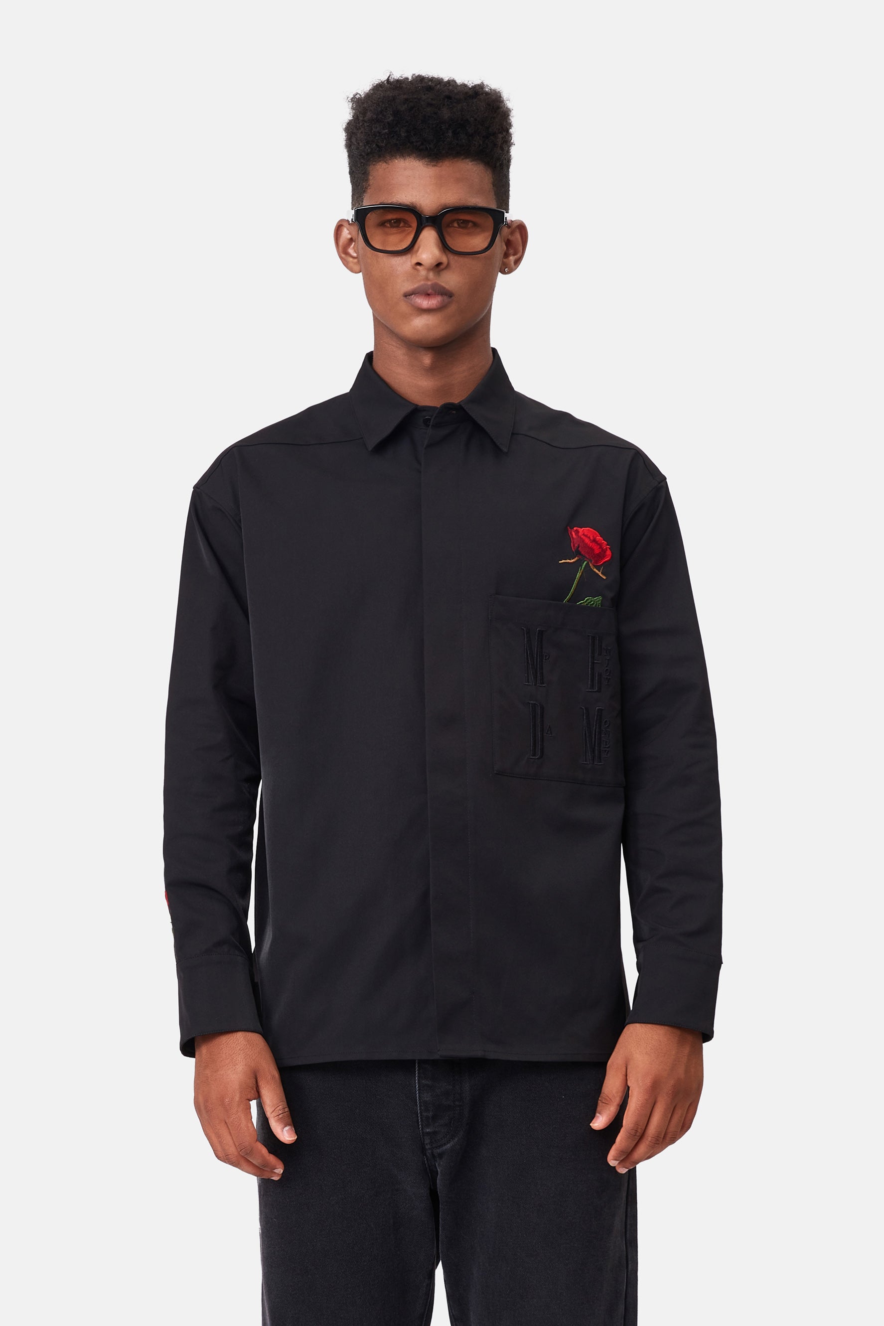 이 긴 소매 흰색 셔츠는 여유로운 핏과 왼쪽 주머니에 장미 자수가 특징입니다.