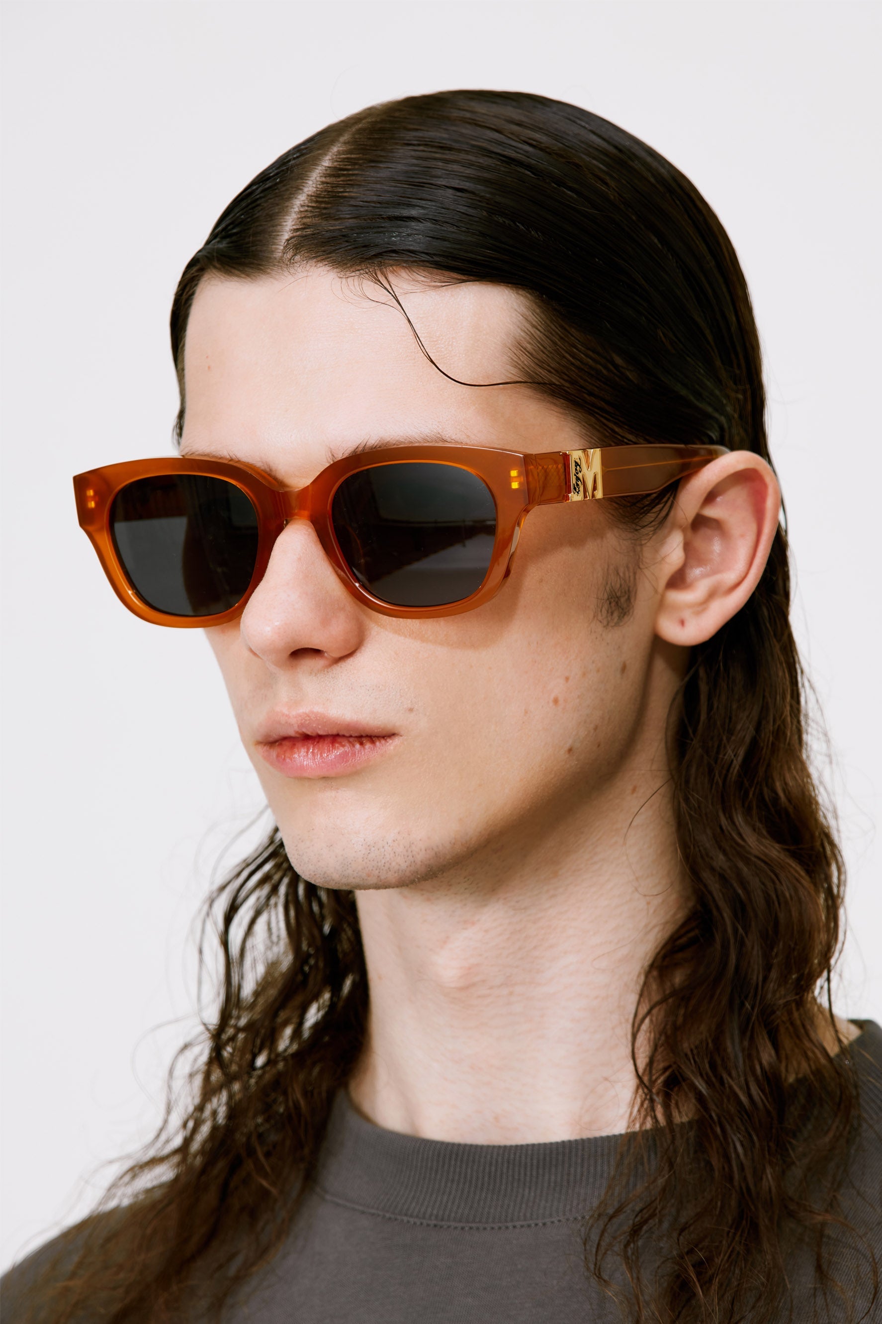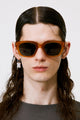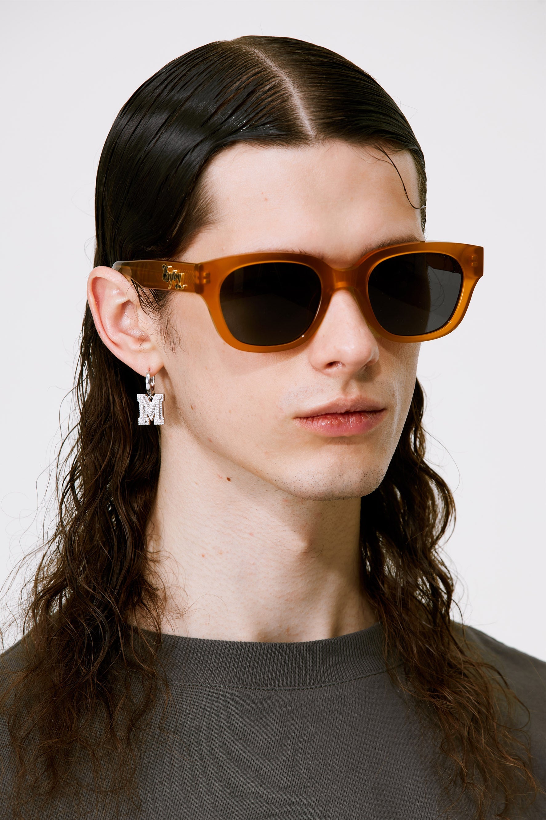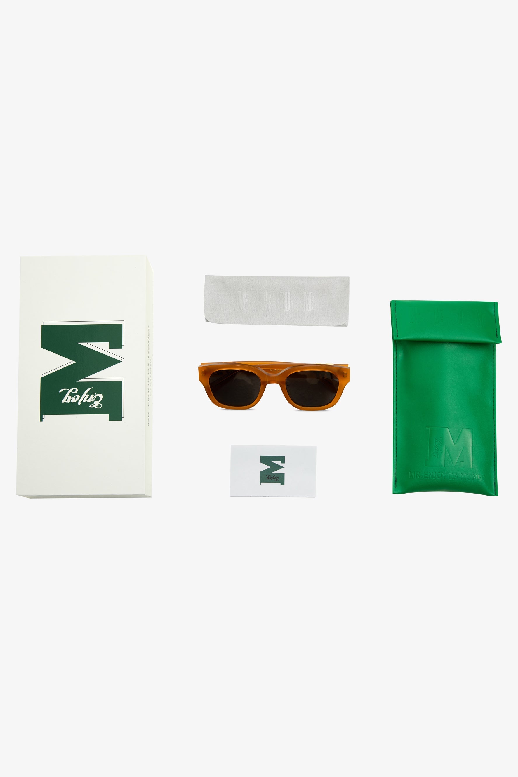 이 라운드 프레임 쌍은 착색된 렌즈를 특징으로 합니다. 미세한 디테일에는 경첩에 Medm 로고가 포함되어 있습니다. 깊은 베벨 디자인과 브라운 프레임이 모던한 느낌을 더해줍니다.