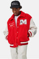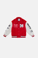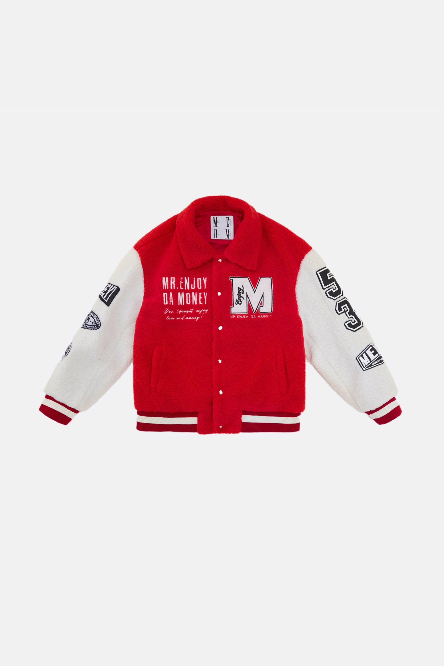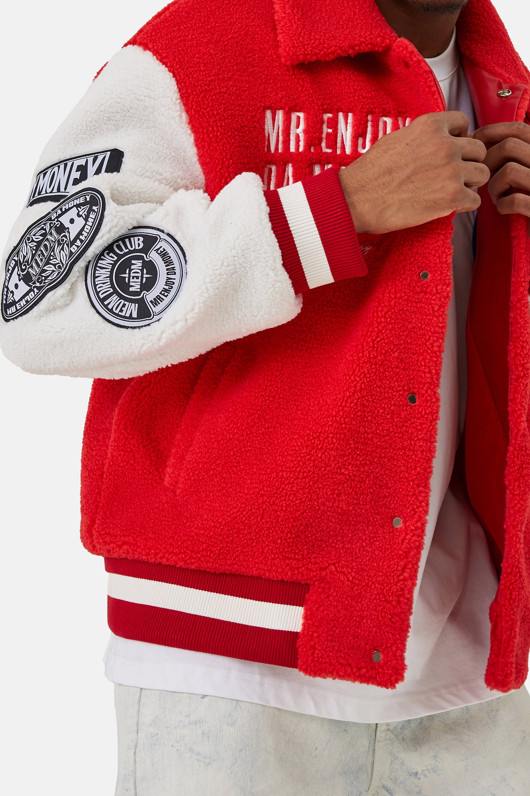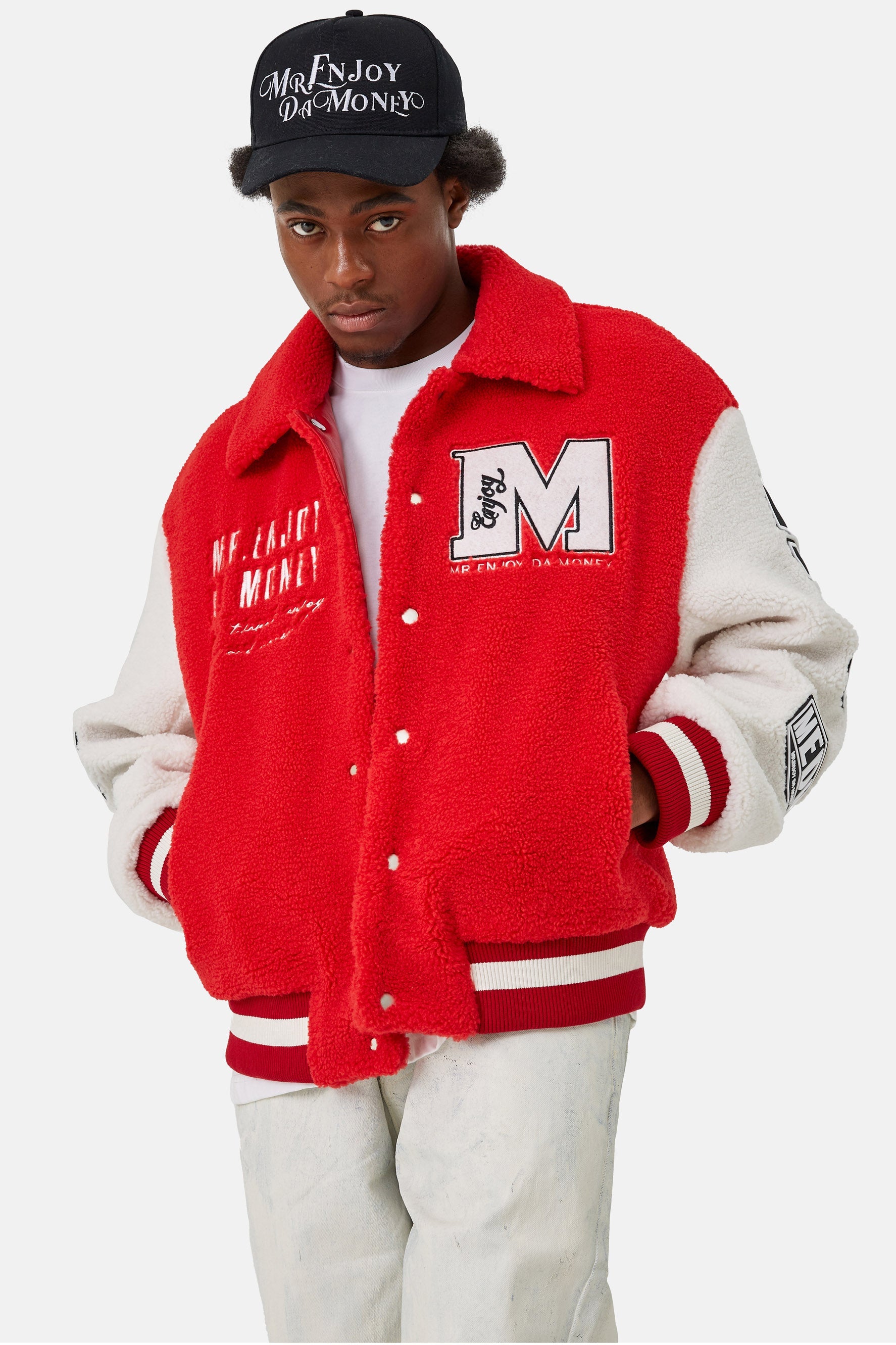 이 셰르파 야구 재킷은 양쪽 소매에 패치가 있고 재킷 앞면에 자수 그래픽이 있습니다. 버튼업 클로저.