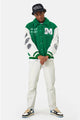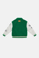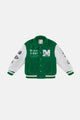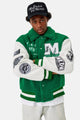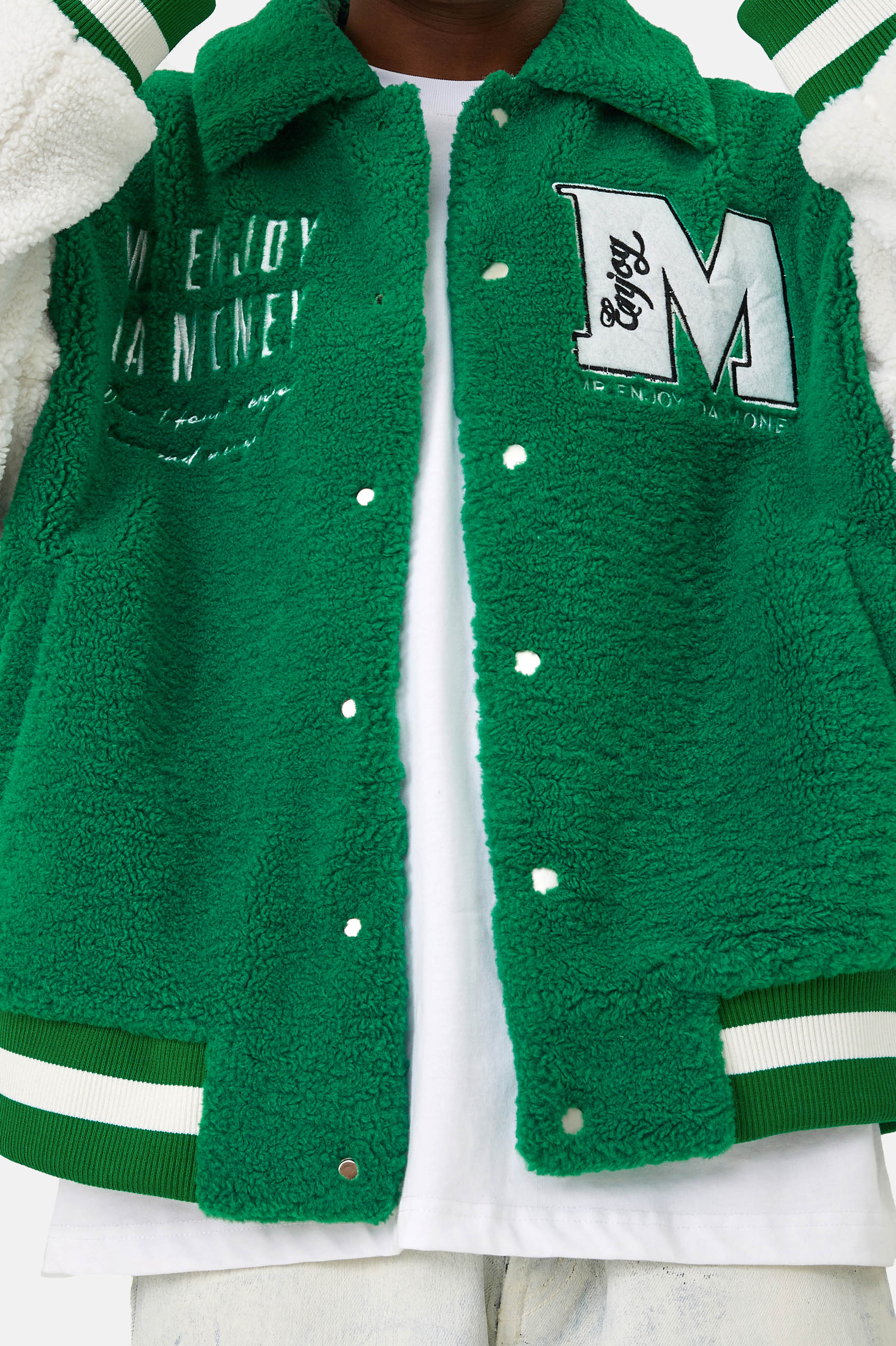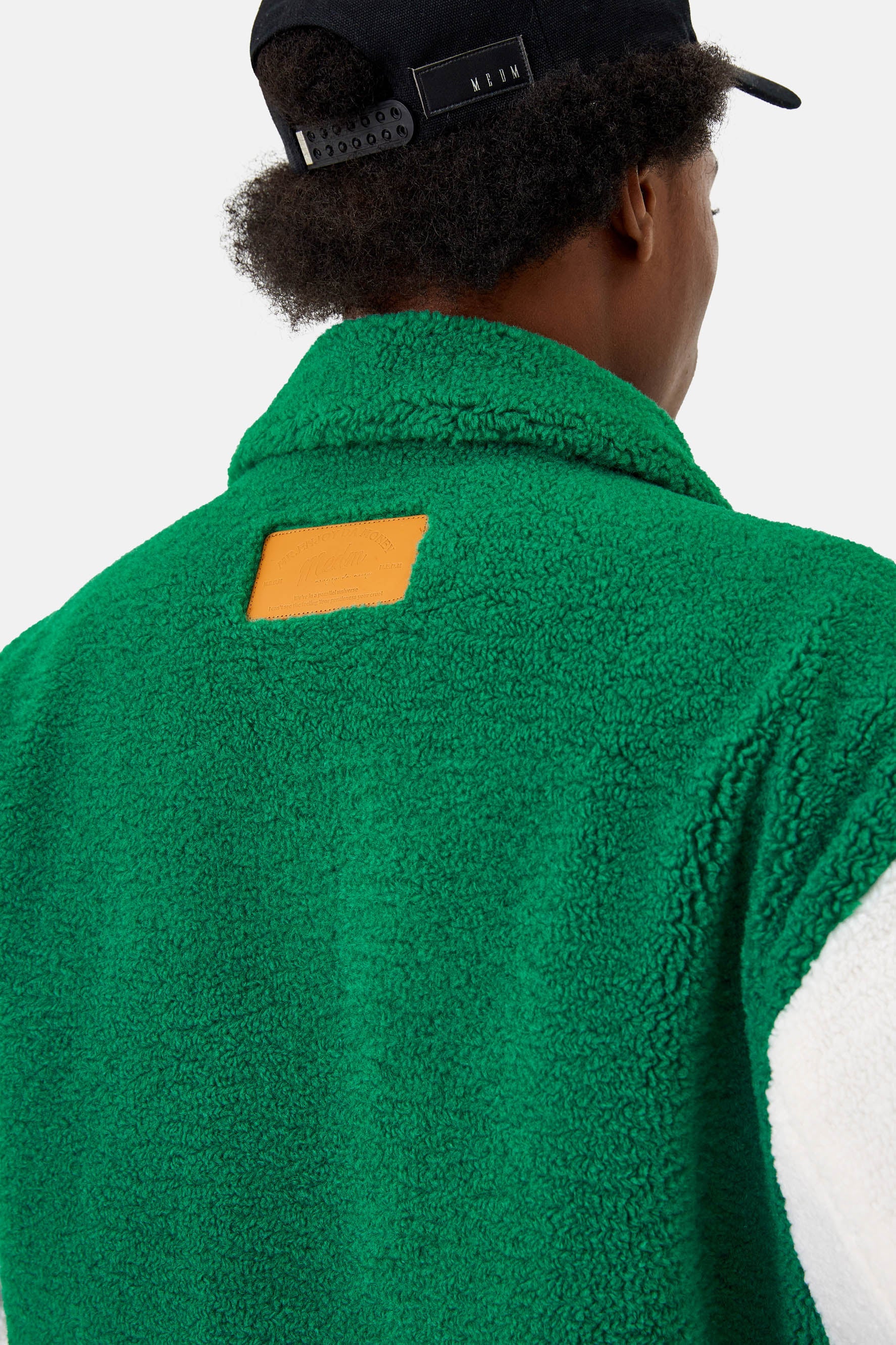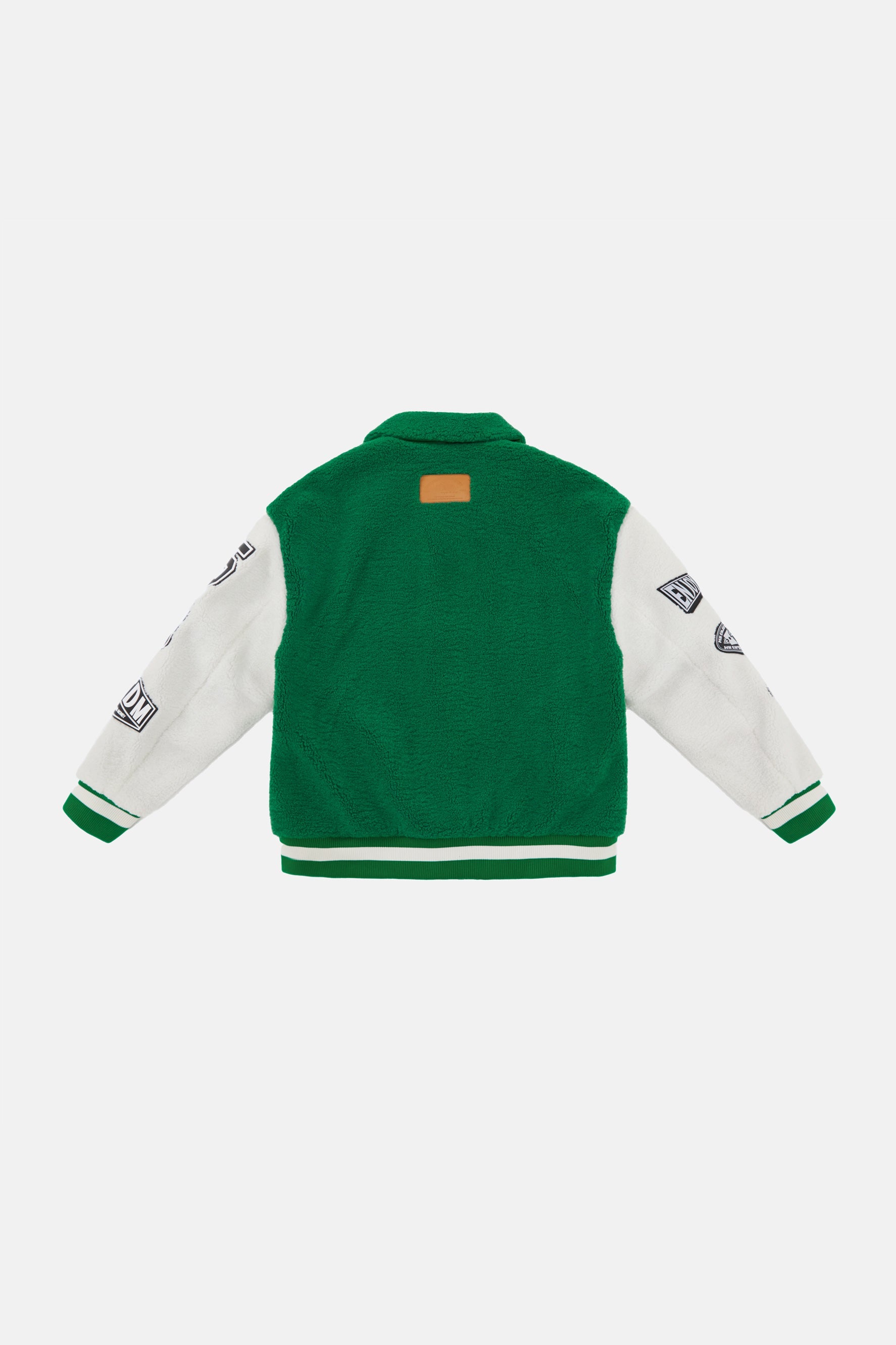 이 셰르파 야구 재킷은 양쪽 소매에 패치가 있고 재킷 앞면에 자수 그래픽이 있습니다. 버튼업 클로저.