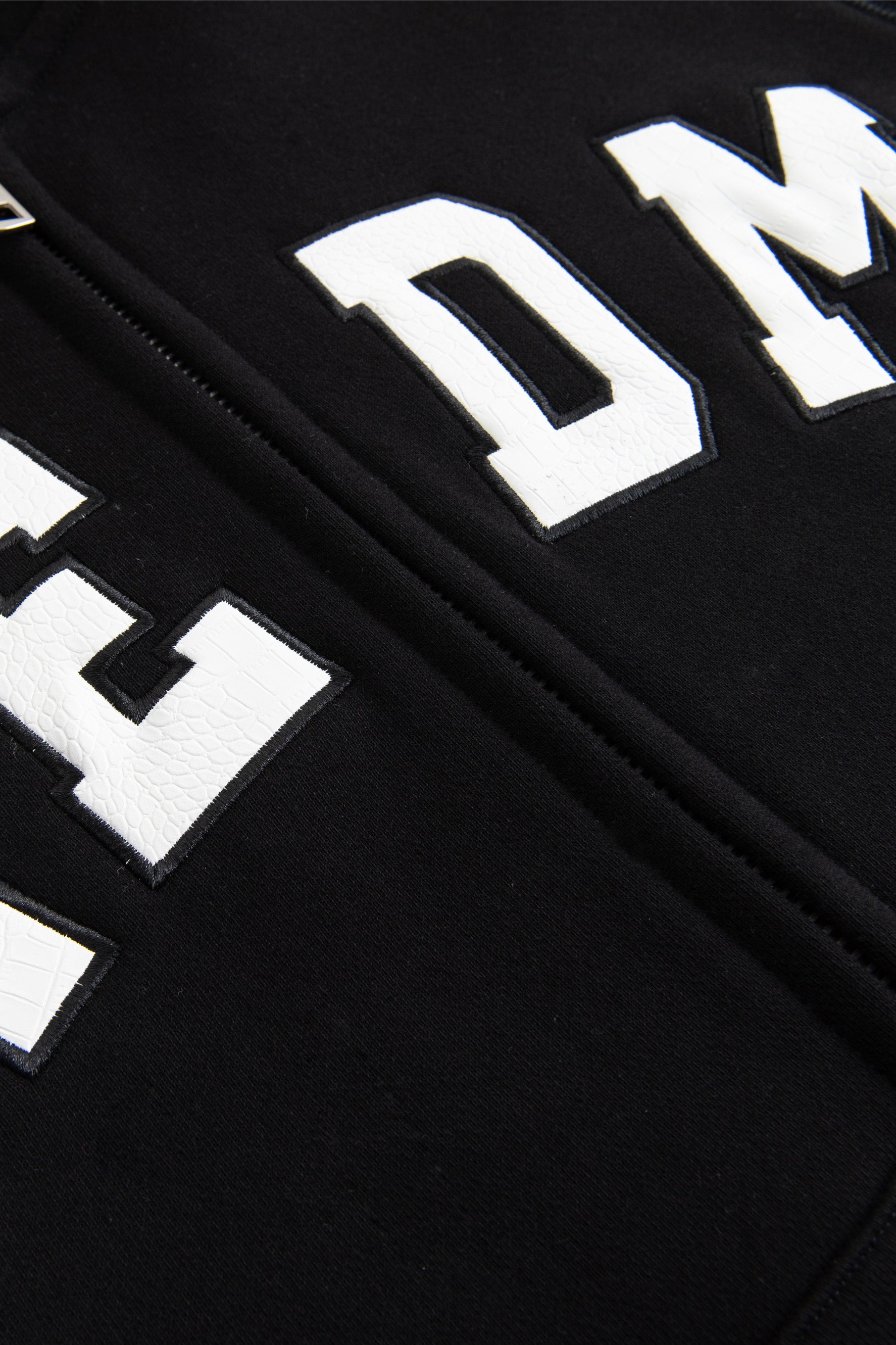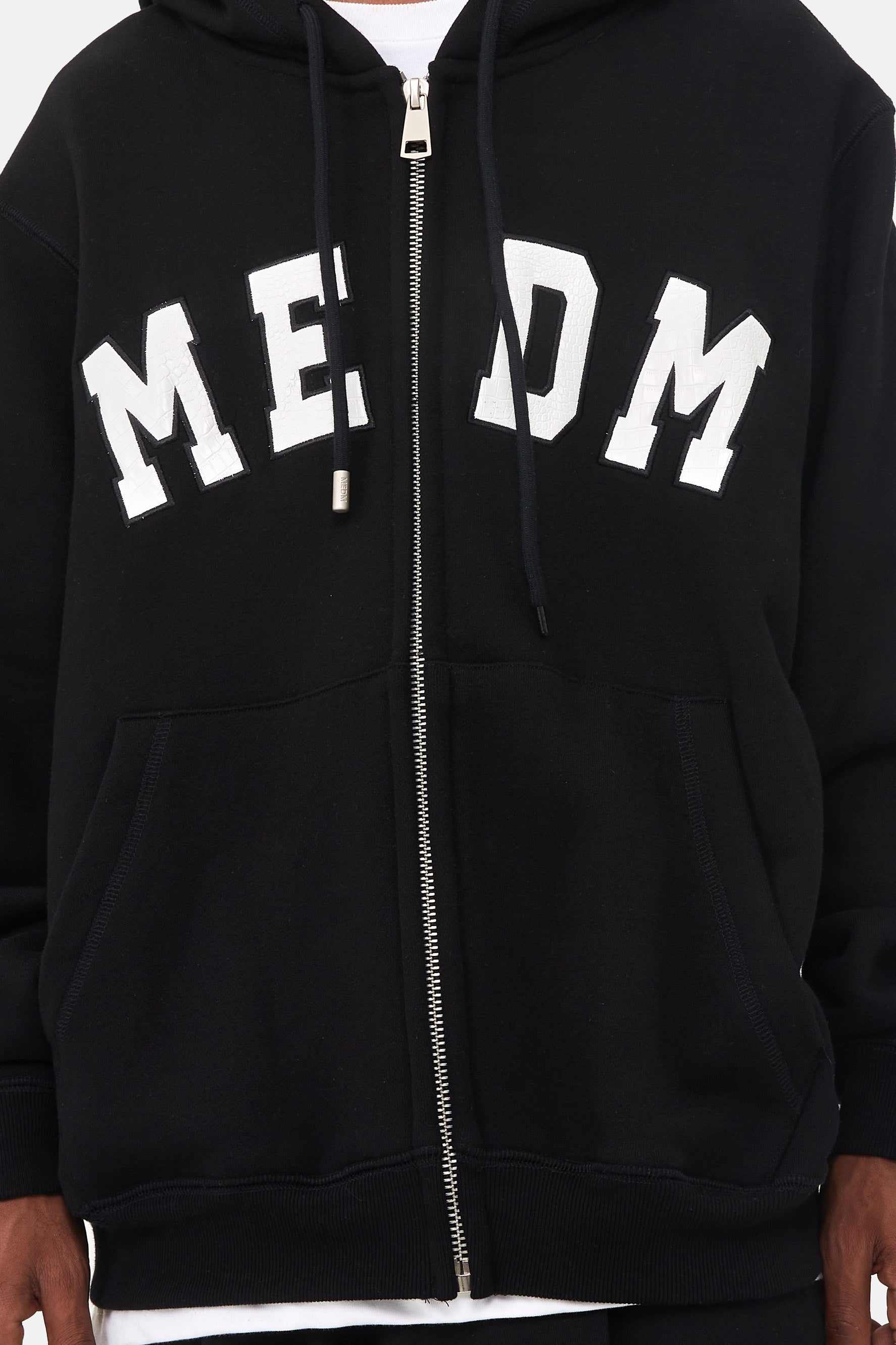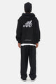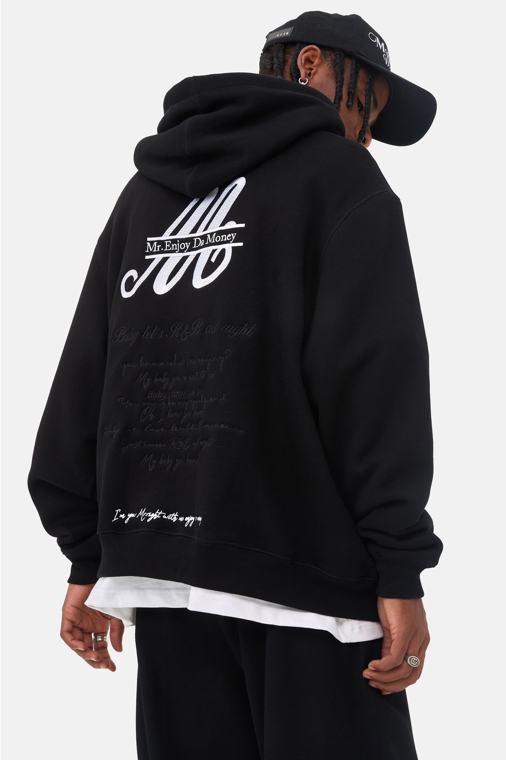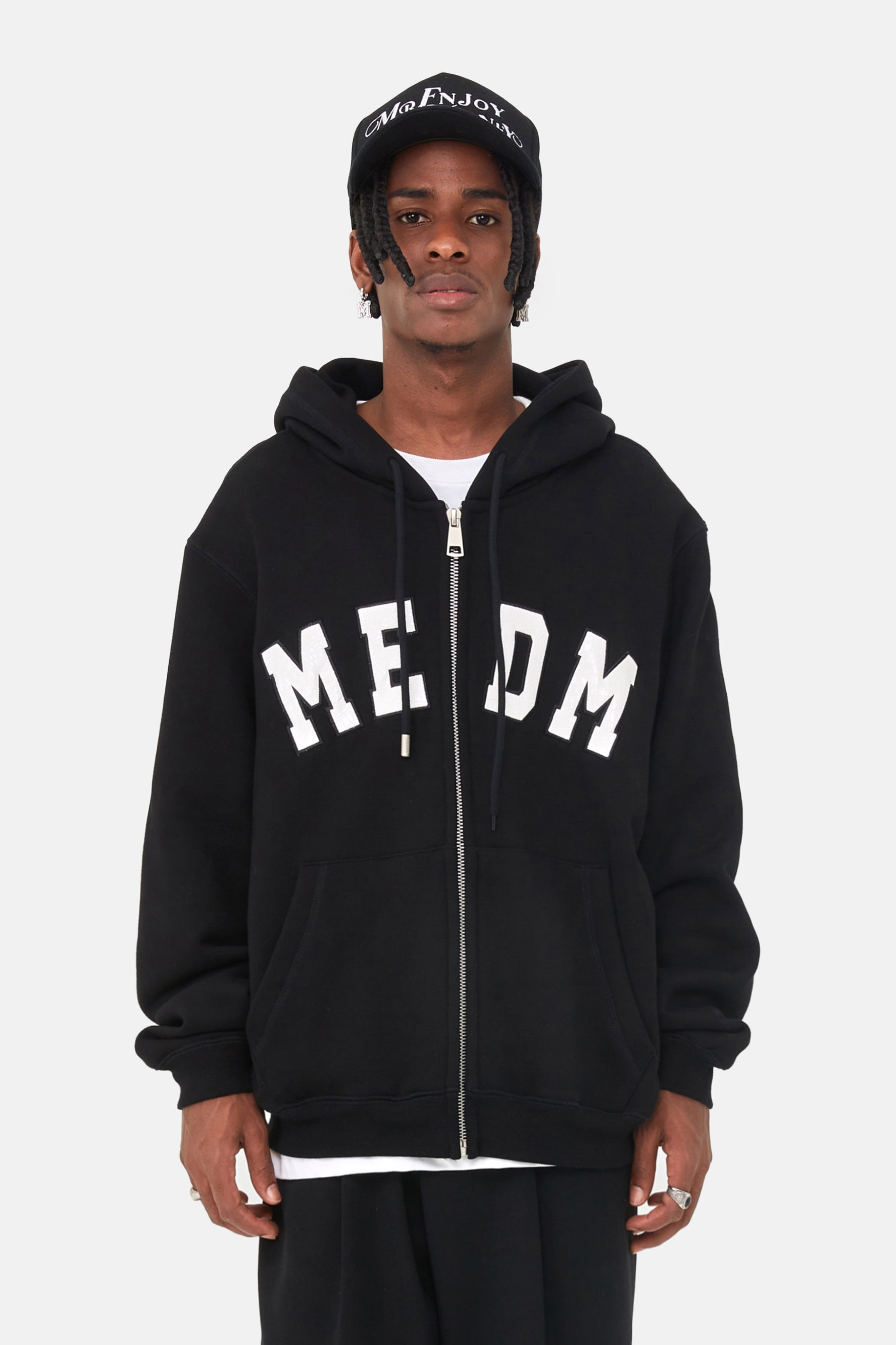 이 후디는 드롭 숄더 디자인, 손목과 허리 부분에 골지 디테일이 있어 여유로운 핏이 특징입니다. 지퍼 클로저