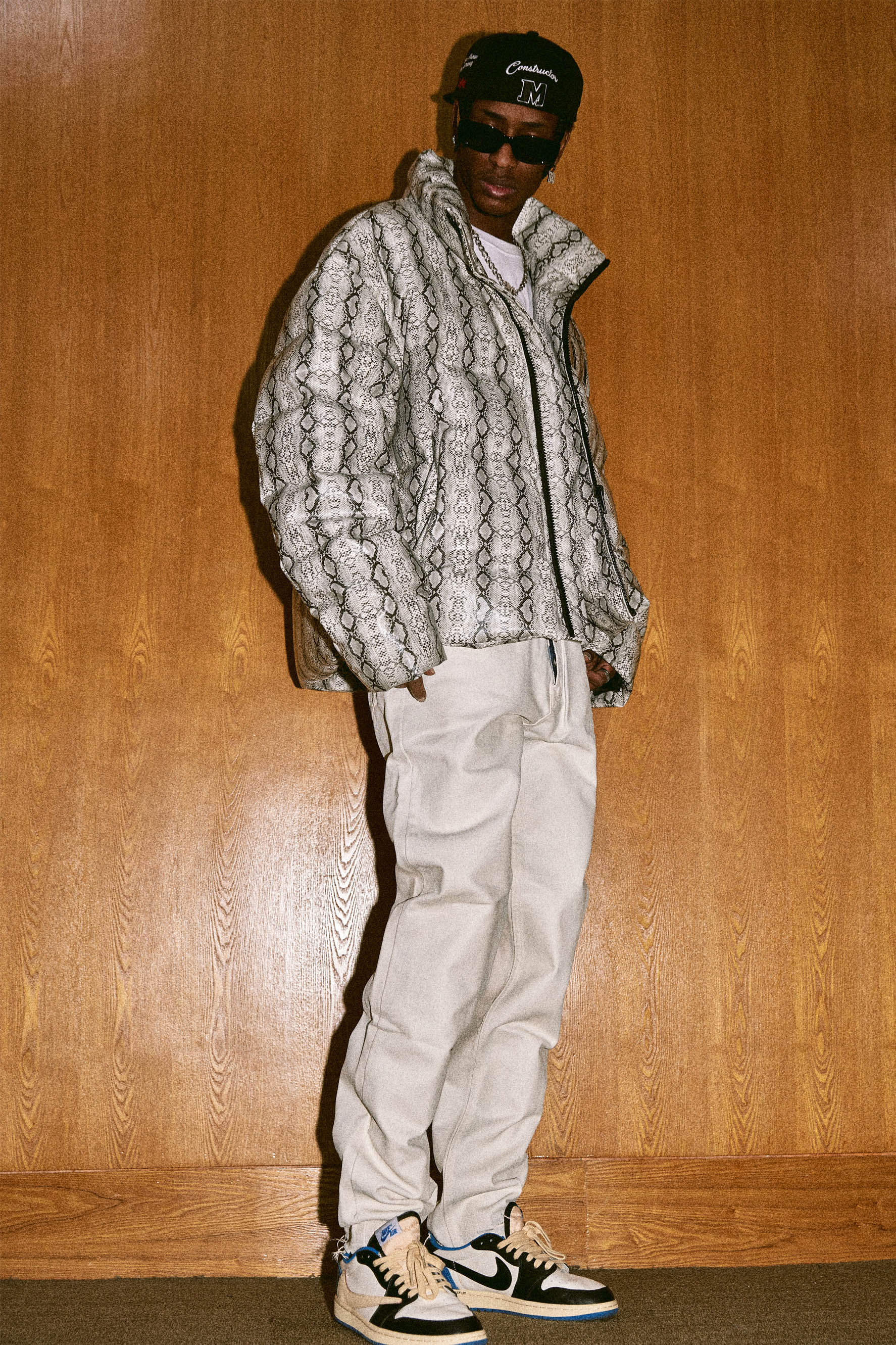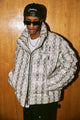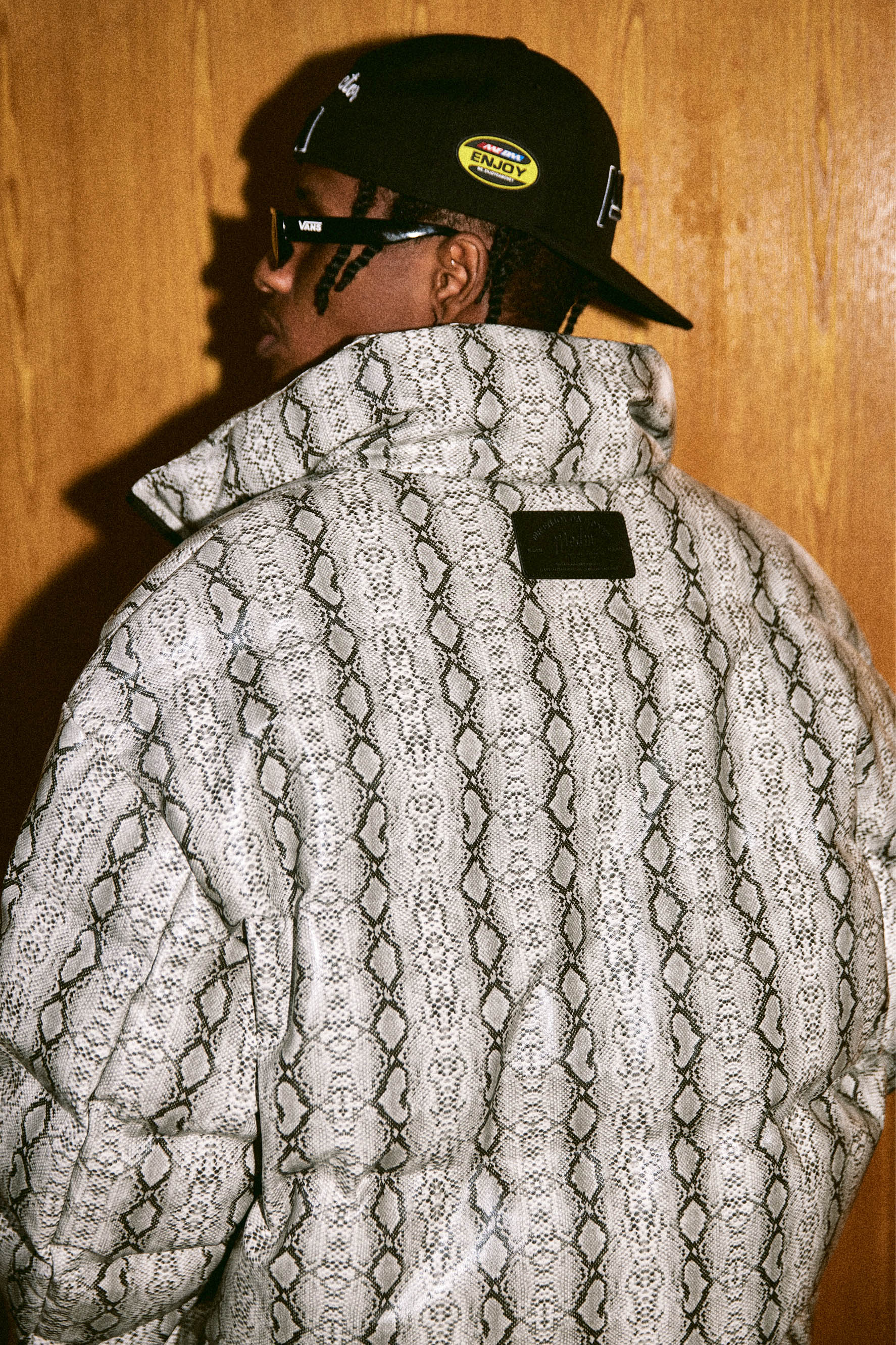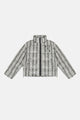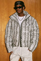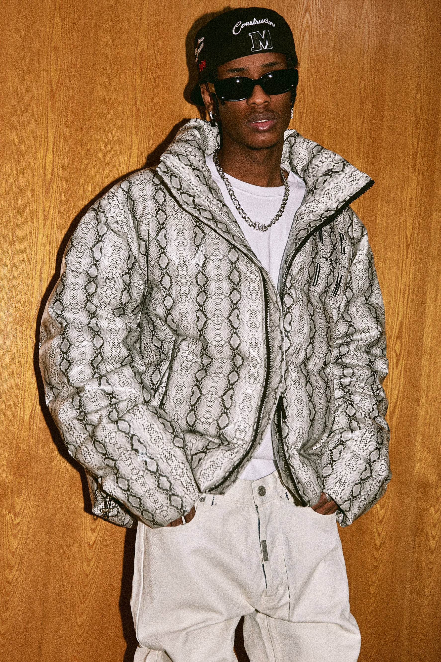 이 패딩 재킷은 앞면에 MEDM 로고, 전체적으로 뱀 패턴, 스탠드 칼라, 앞면 지퍼 잠금 장치가 있는 두 개의 핸드 사이드 포켓이 특징입니다.