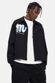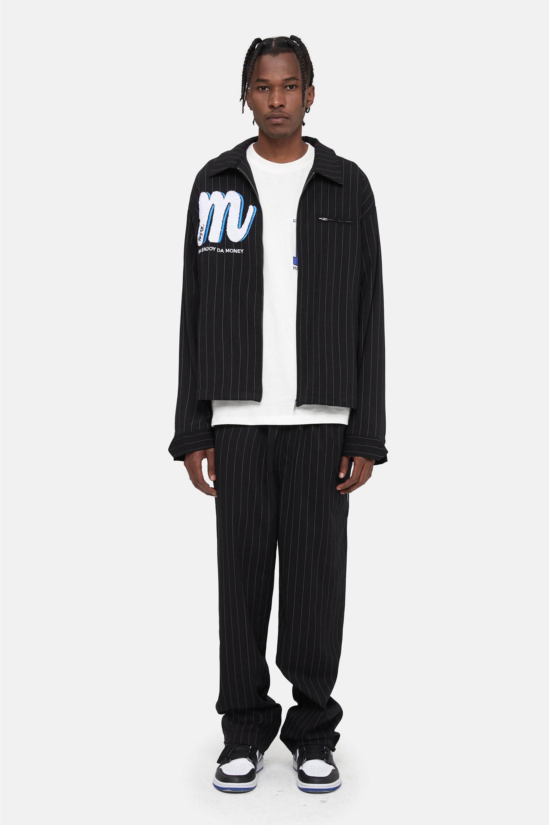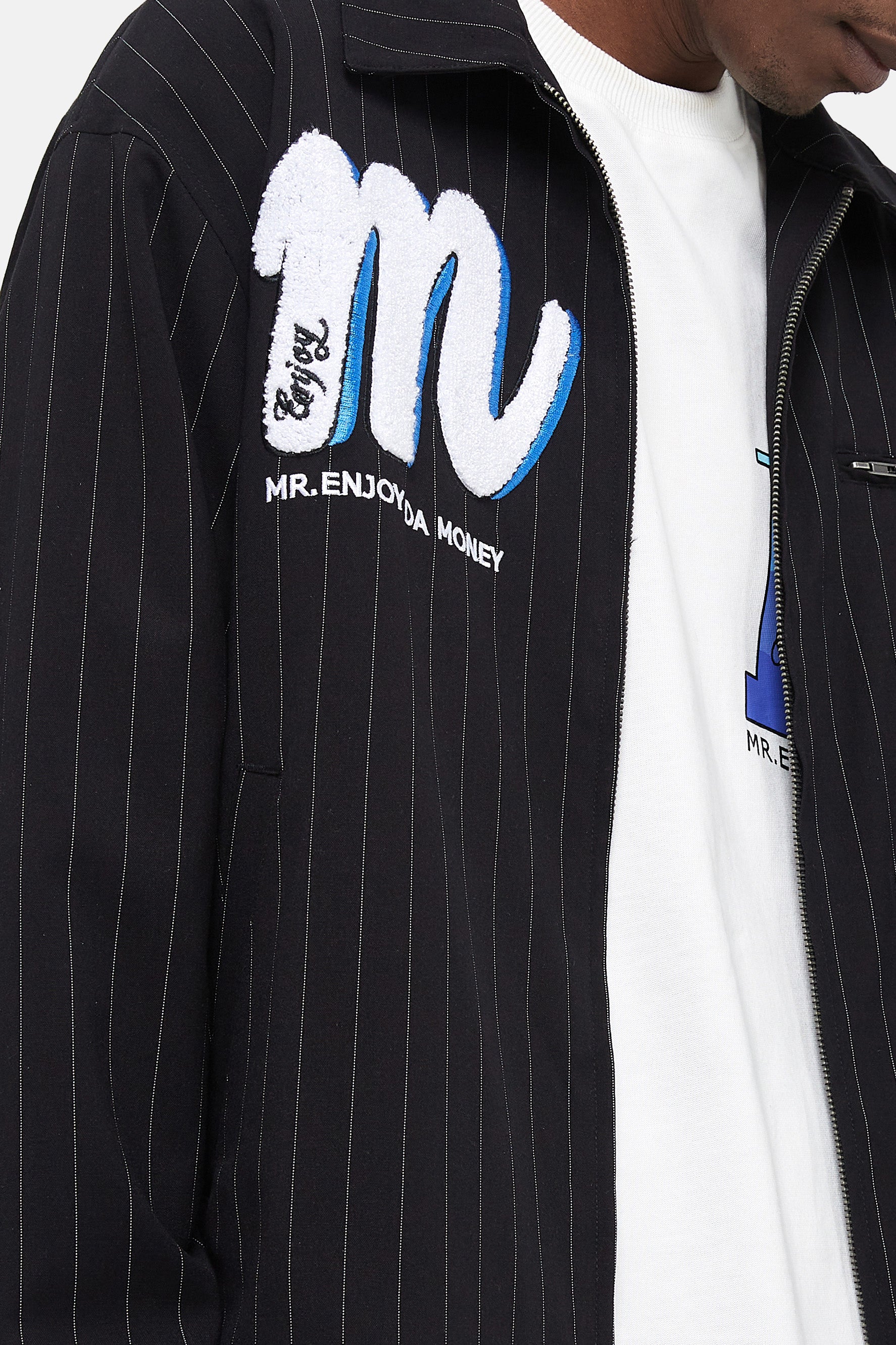 이 재킷은 전체적으로 스트라이프 패턴 프린트가 특징입니다. 지퍼 클로저. 앞면에 로고 자수