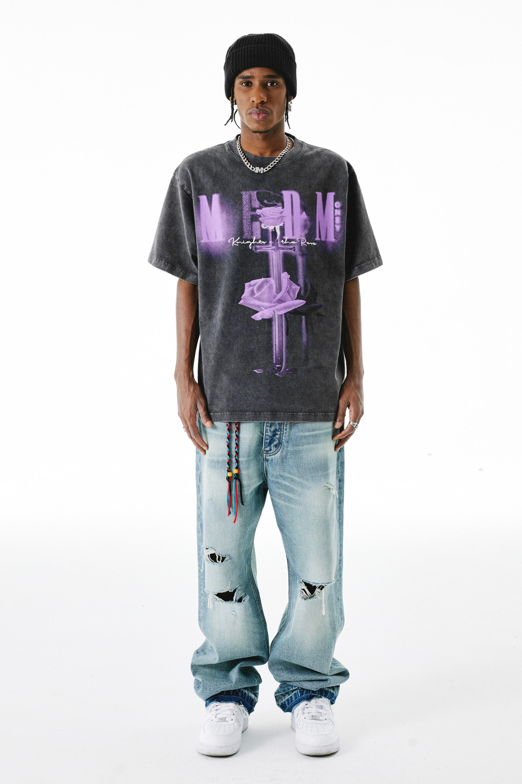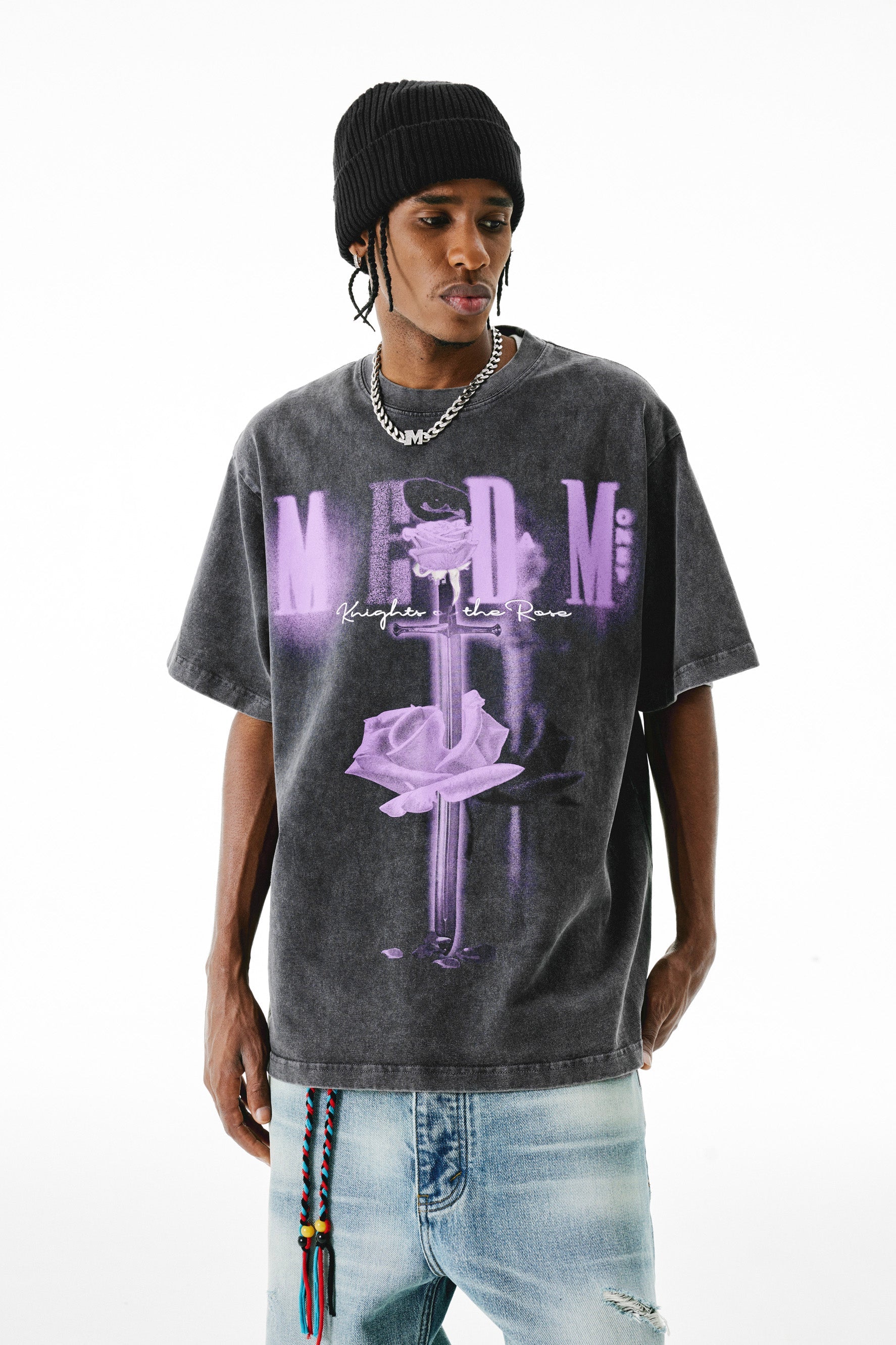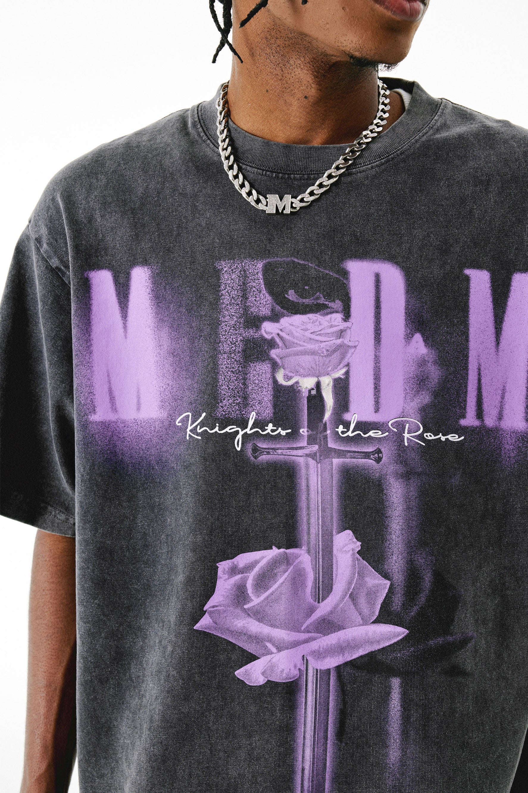 MEDM SWORD 티셔츠는 유기농 면으로 제작되어 매우 부드러운 편안함을 선사합니다. 여유로운 핏으로 편안하고 여유로운 느낌을 선사하며, 앞면의 로즈 그래픽 프린트가 스타일리시한 느낌을 더해줍니다. 캐주얼, 데일리룩에 딱 맞습니다.