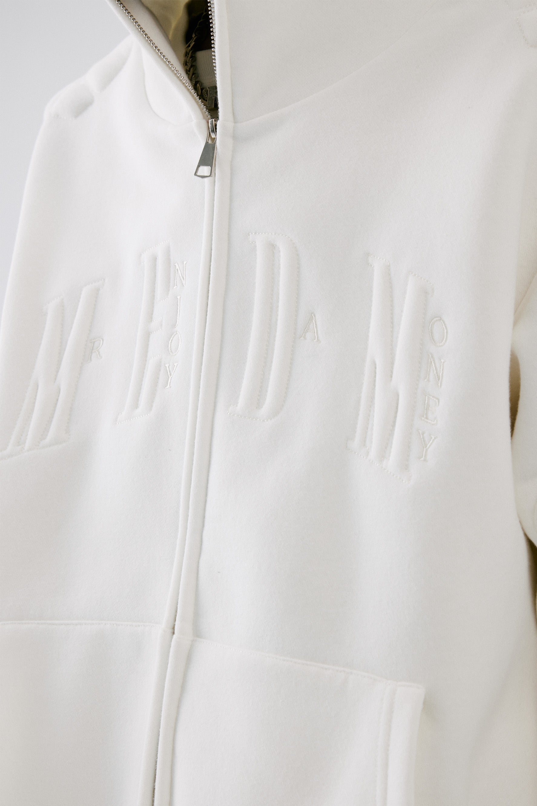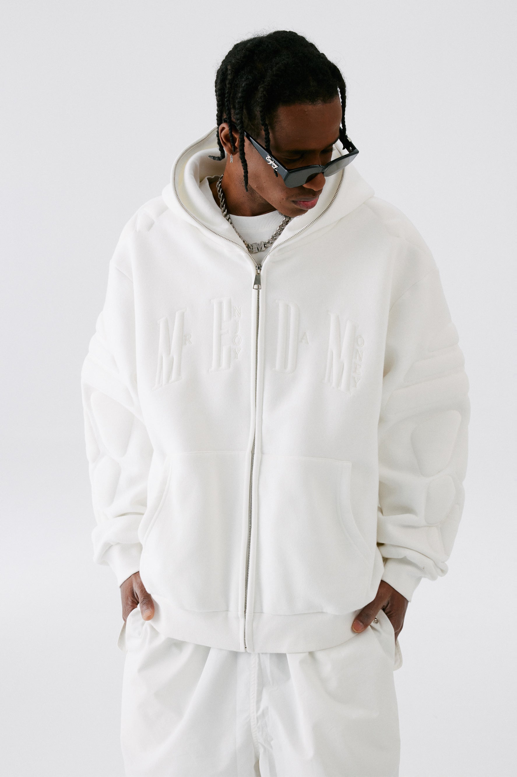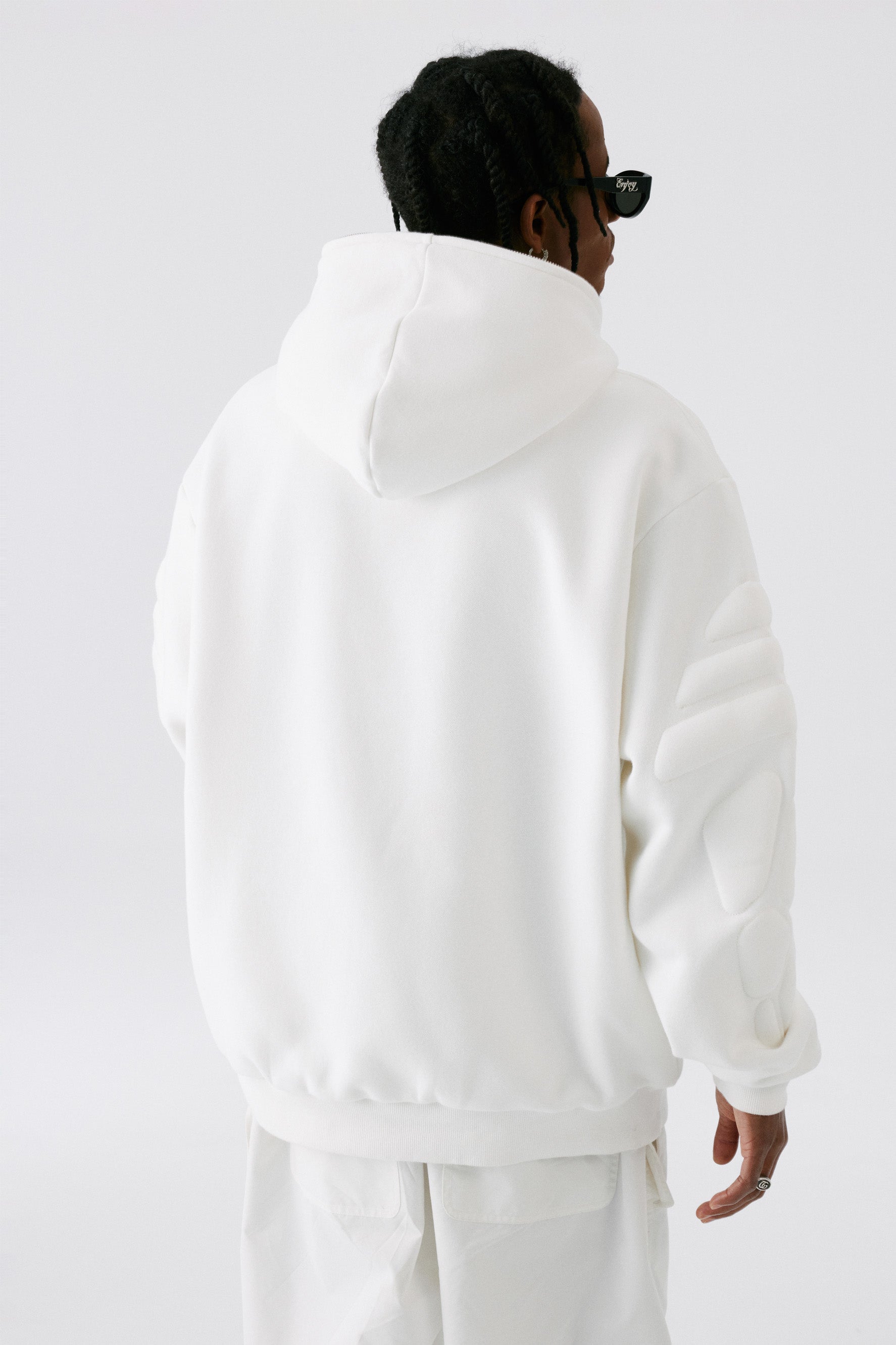 이 후디는 드롭 숄더 디자인, 손목과 허리 부분에 골지 디테일이 있어 여유로운 핏이 특징입니다. 앞면에 Medm 자수 로고가 있고 양쪽 소매에 3D 입체 그래픽이 있습니다.