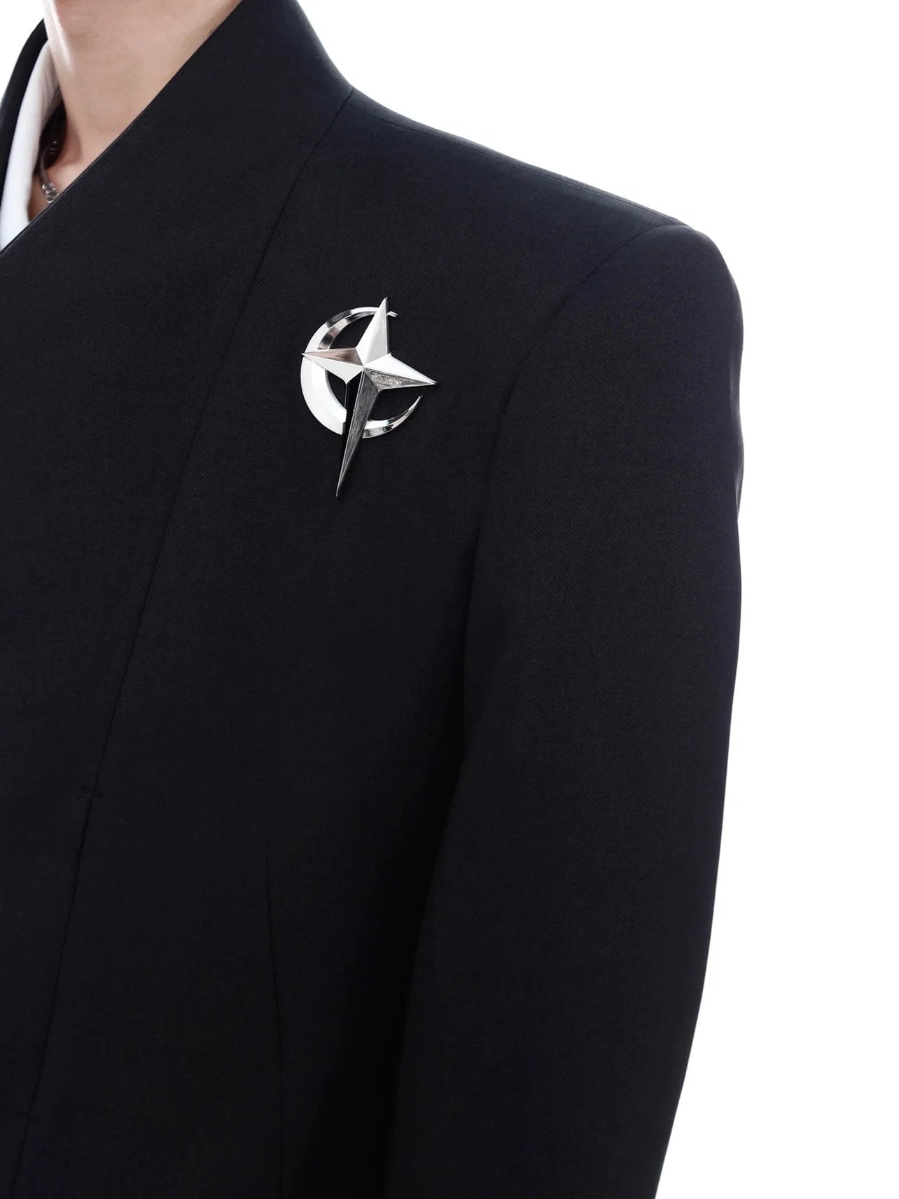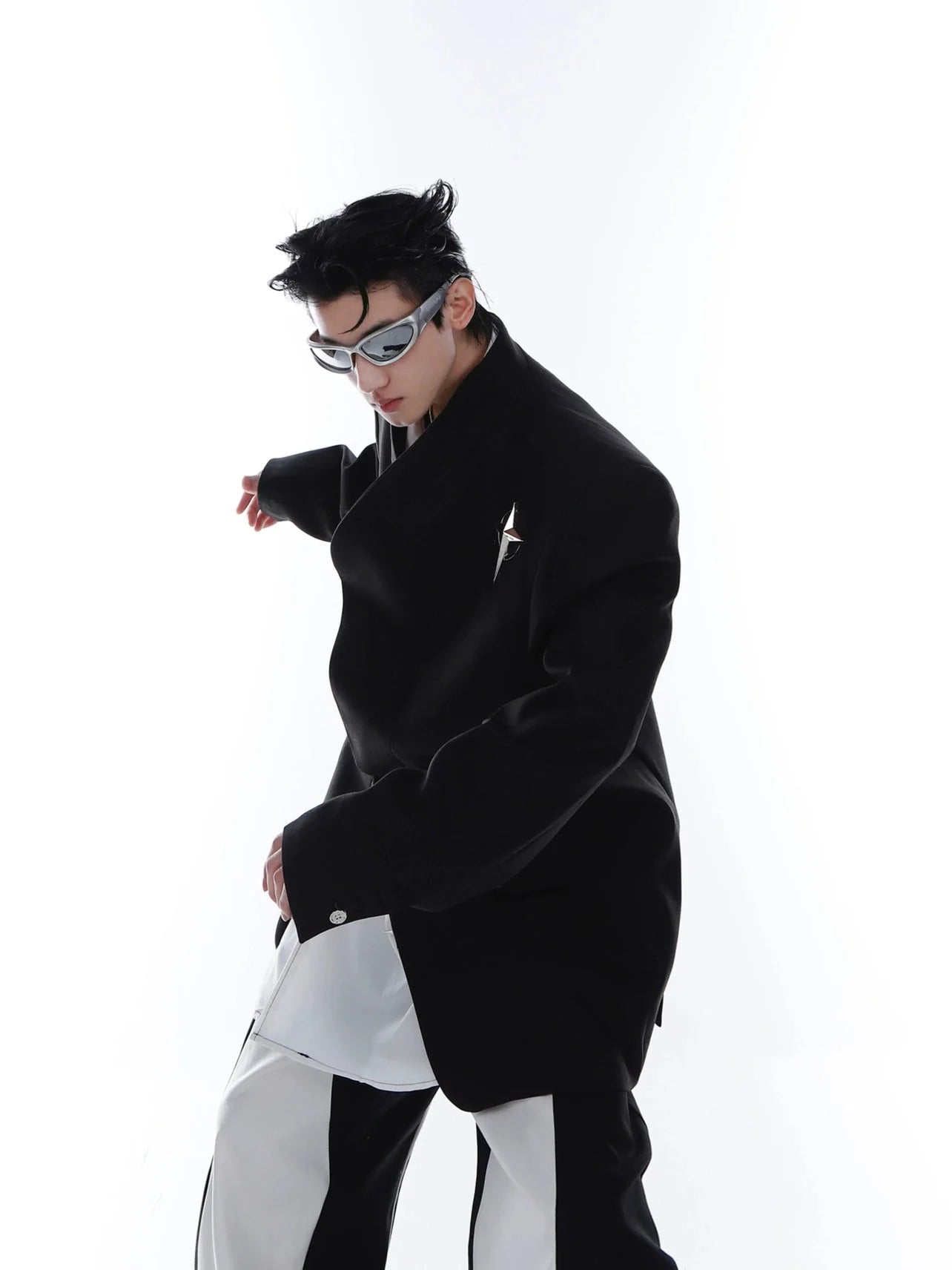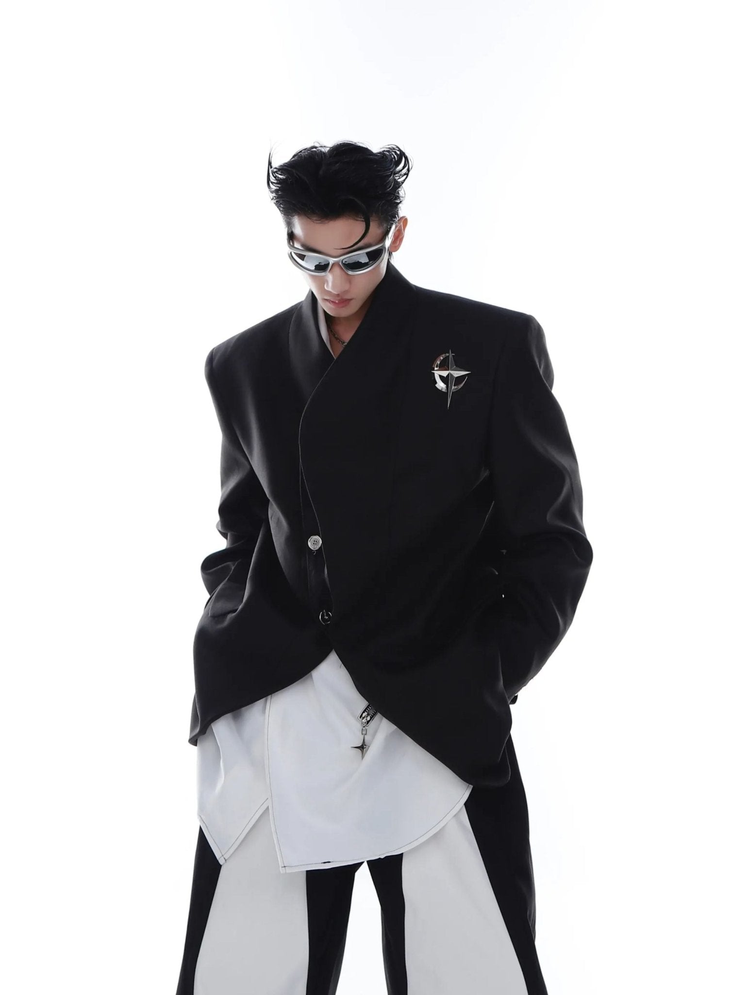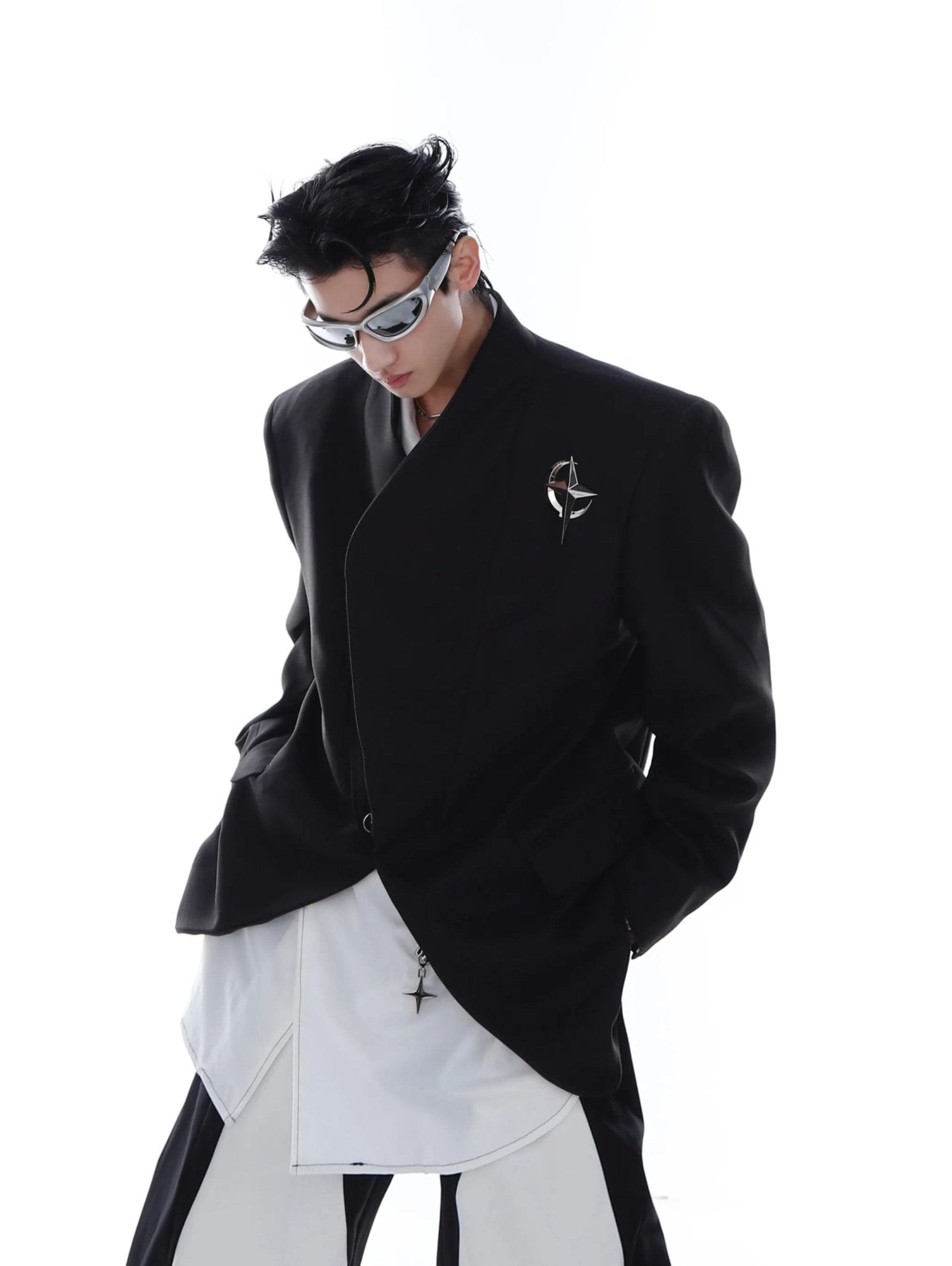 - Embrace the essence of avant-garde fashion with our Metallic Detail Collarless Blazer. This unique piece redefines contemporary style with its collarless, irregular design and unisex appeal, making a bold statement in modern minimalism.