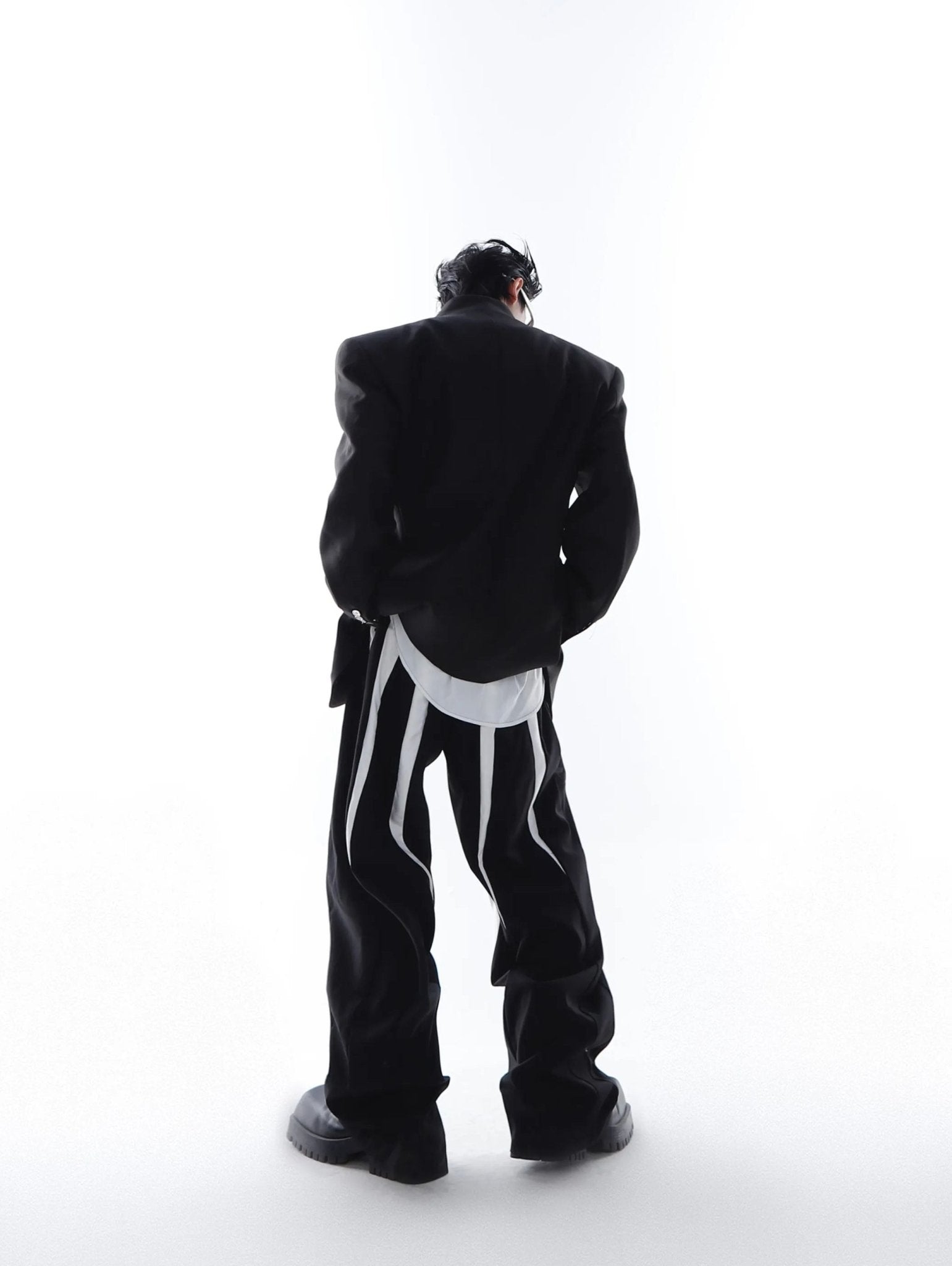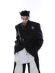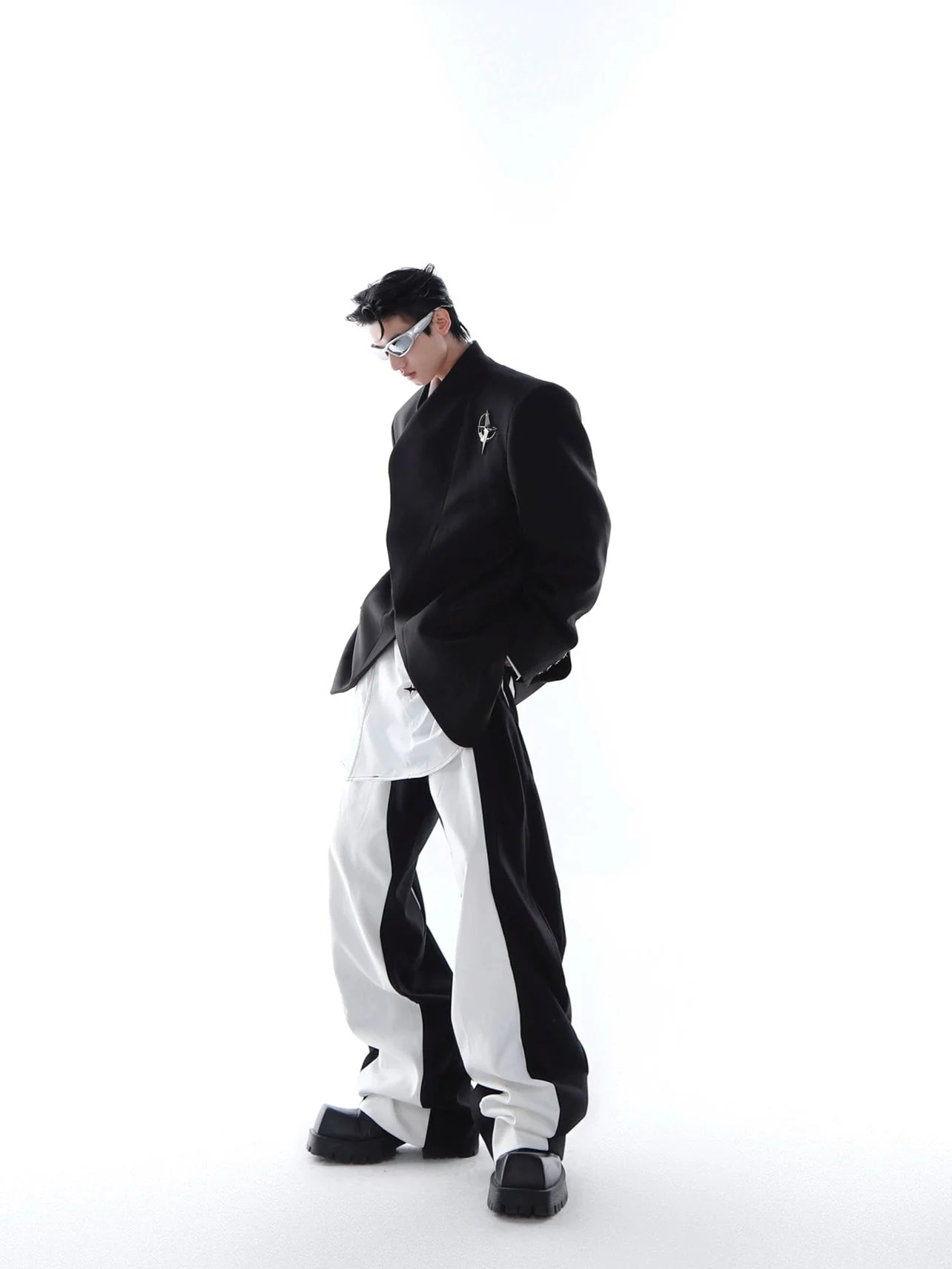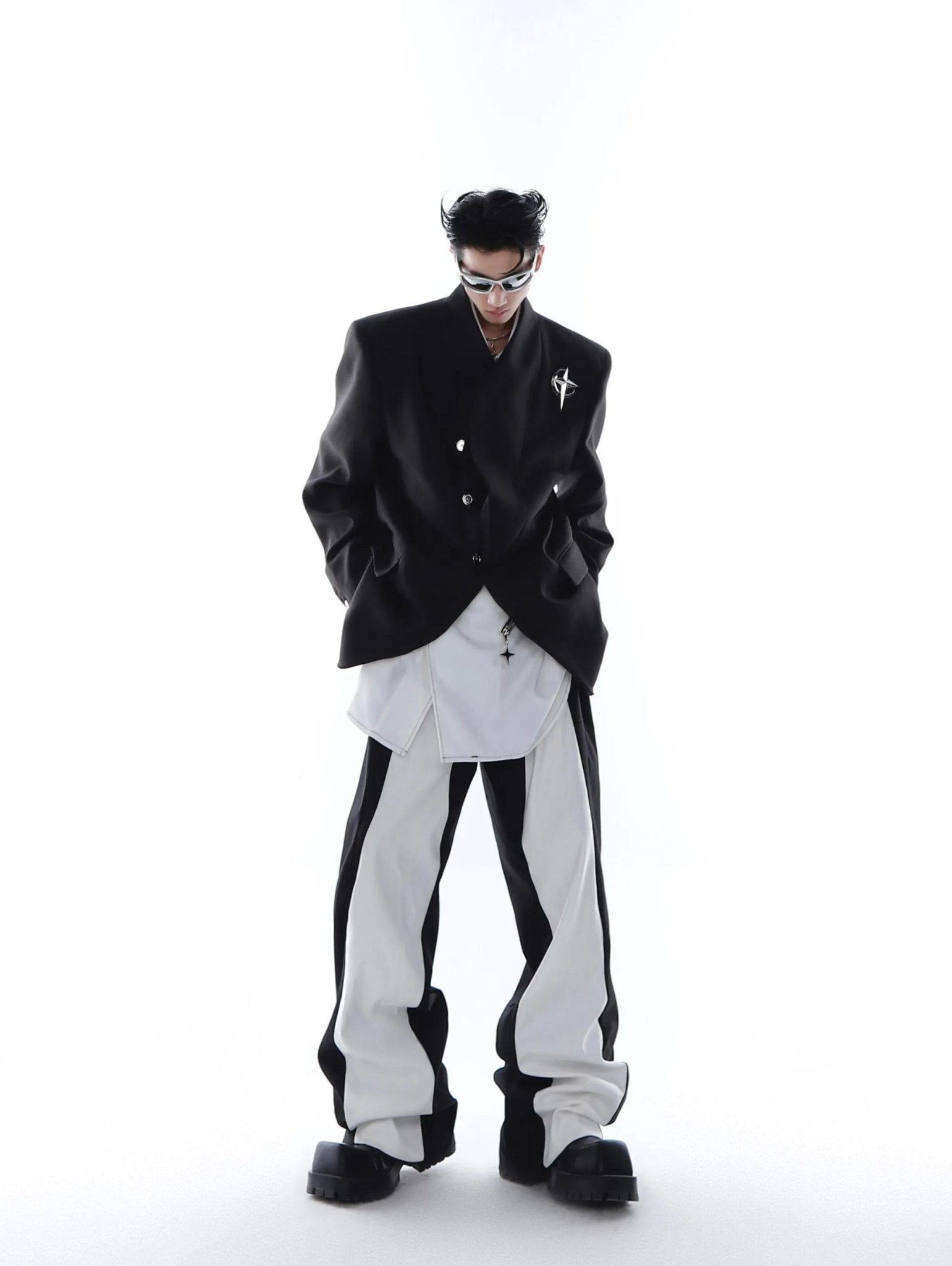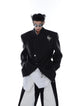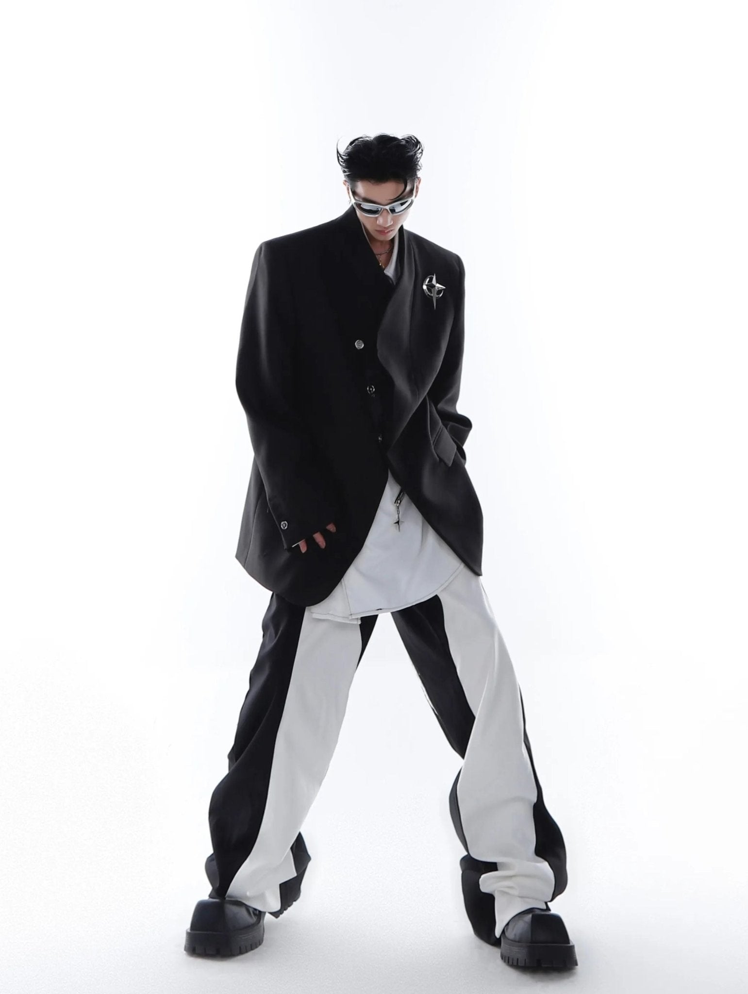 - Embrace the essence of avant-garde fashion with our Metallic Detail Collarless Blazer. This unique piece redefines contemporary style with its collarless, irregular design and unisex appeal, making a bold statement in modern minimalism.