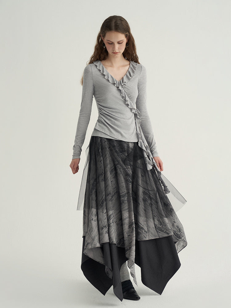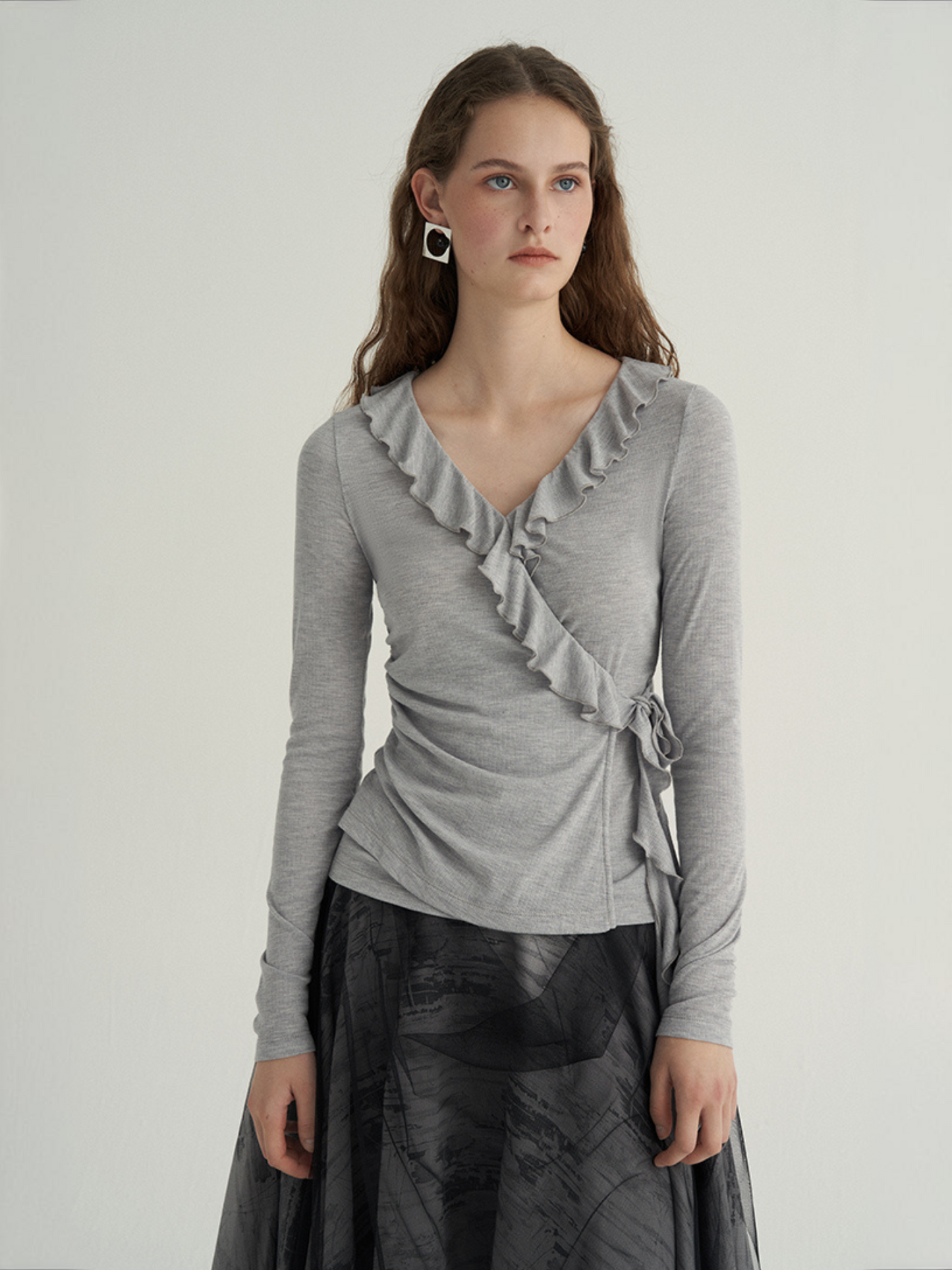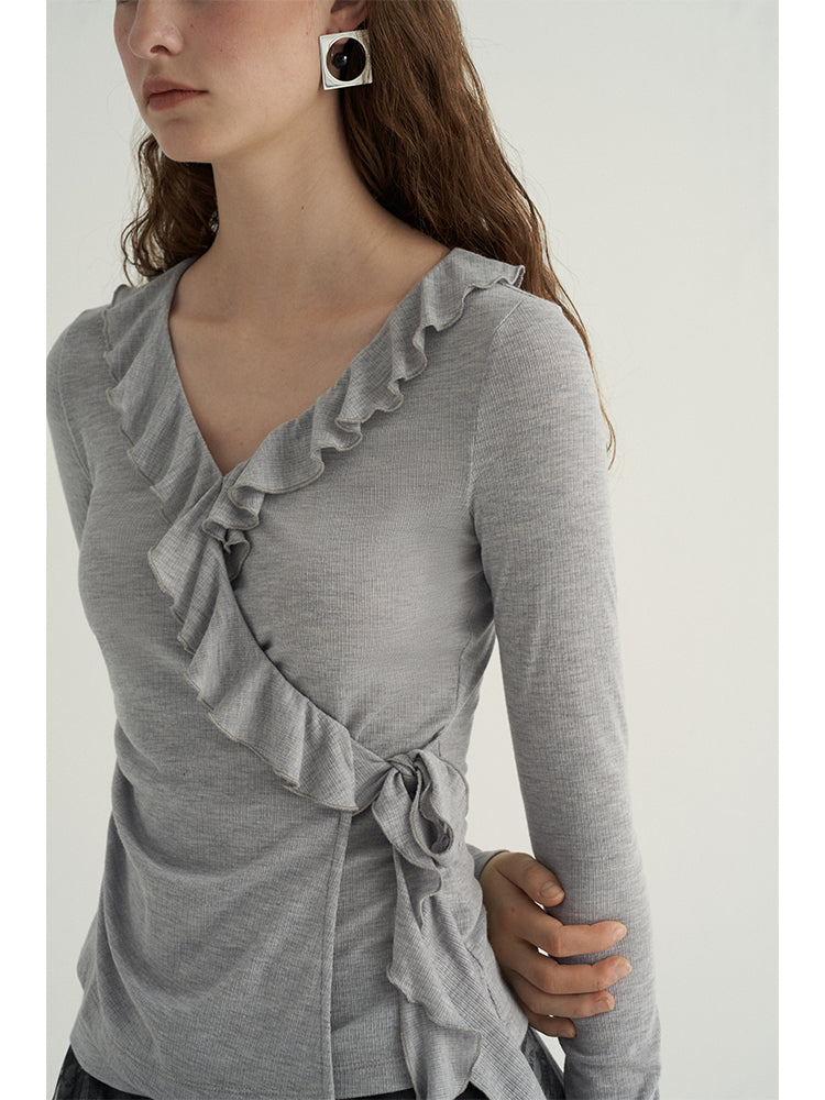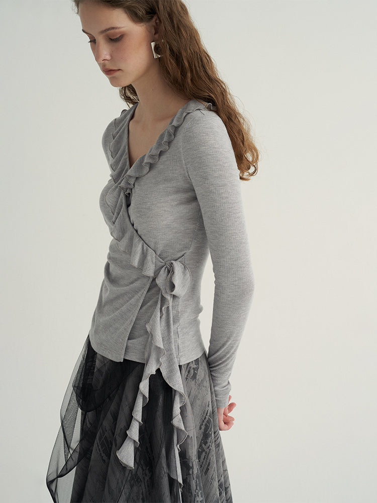 V-Neck Ruffled Wrap Sweater with Side Tie