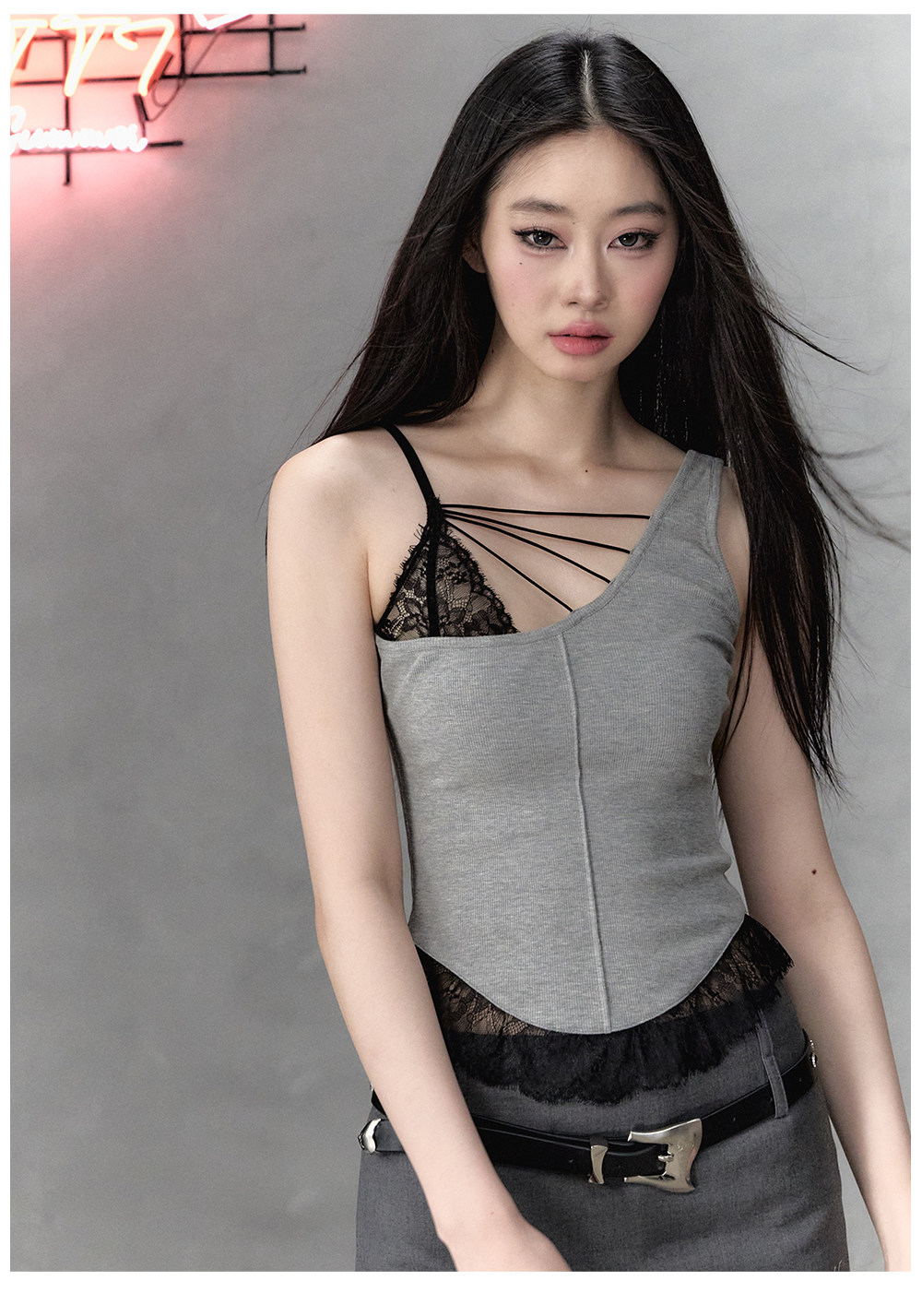 Oak Ash Asymmetrical Shoulder Lace Trim Camisole