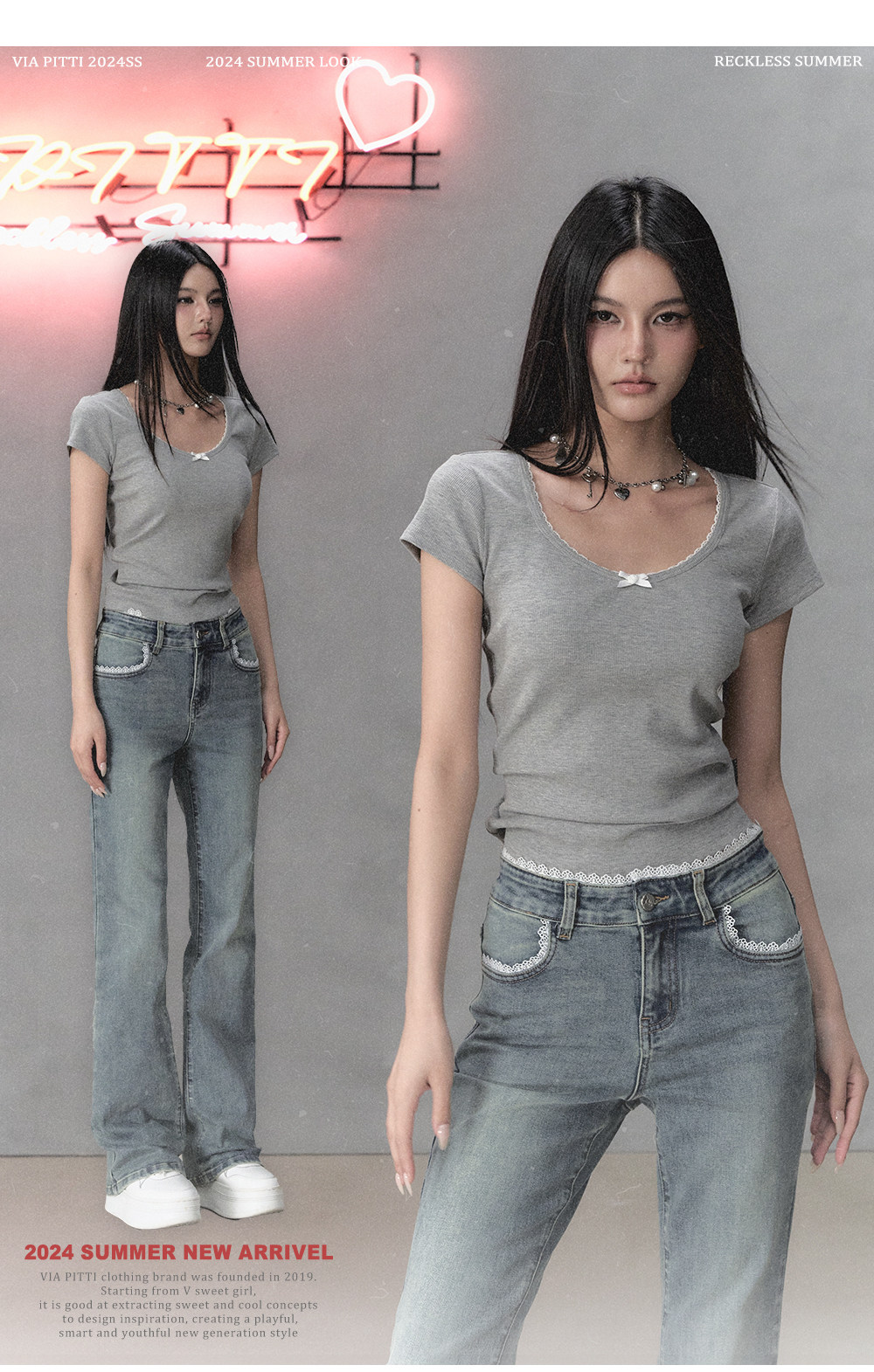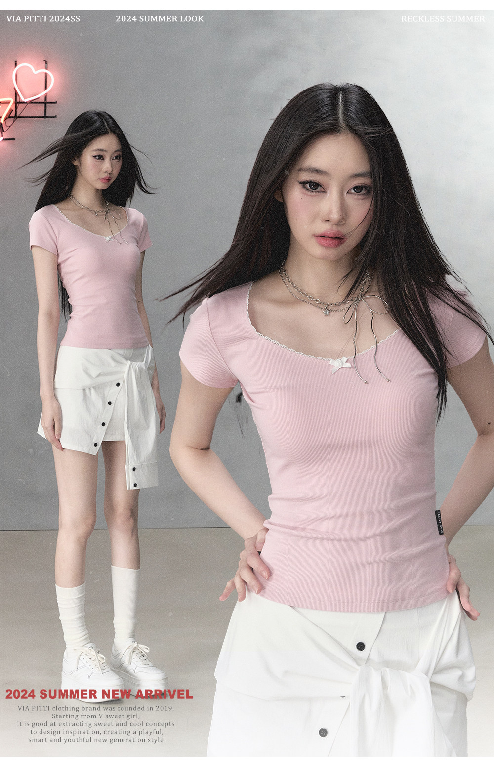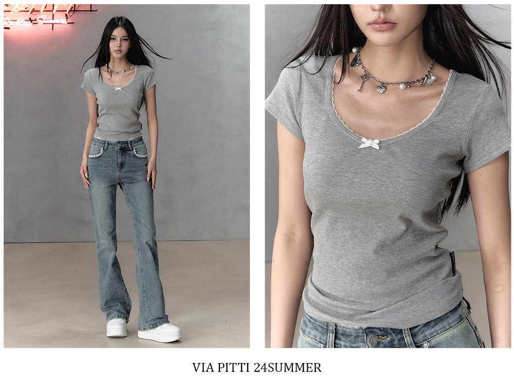 Oak Gray & Pink Lace Butterfly Bow Slim-fit Short Sleeves