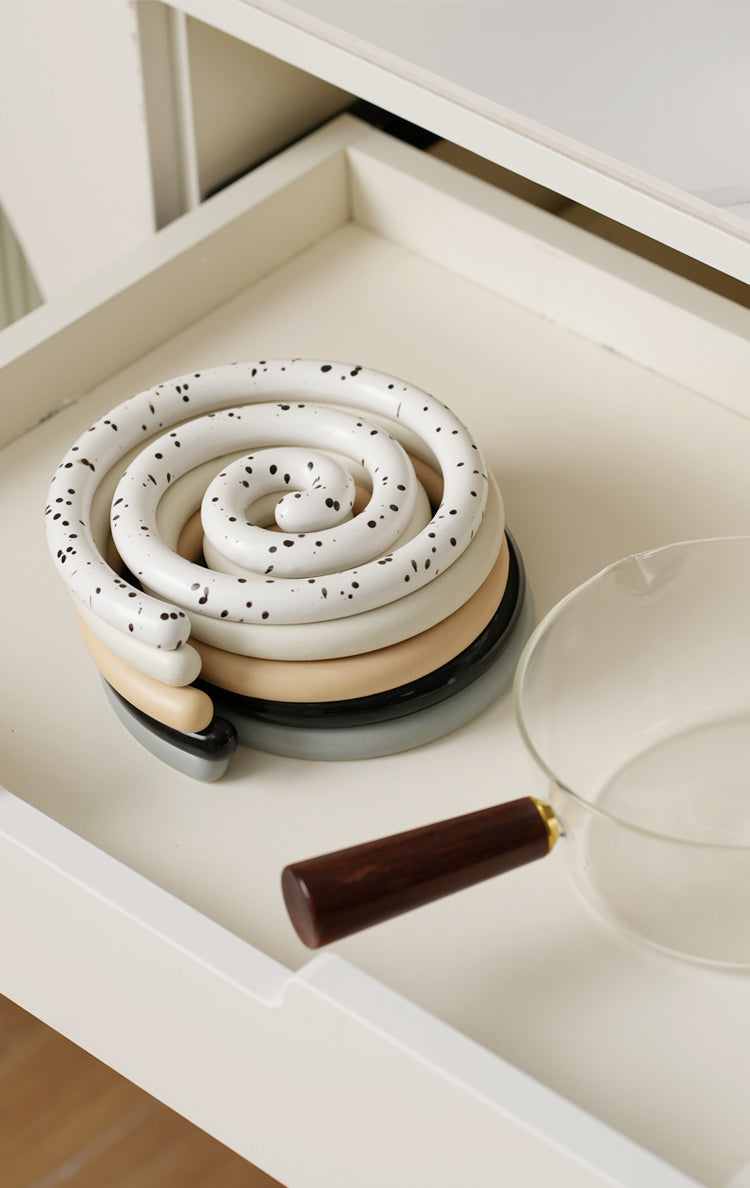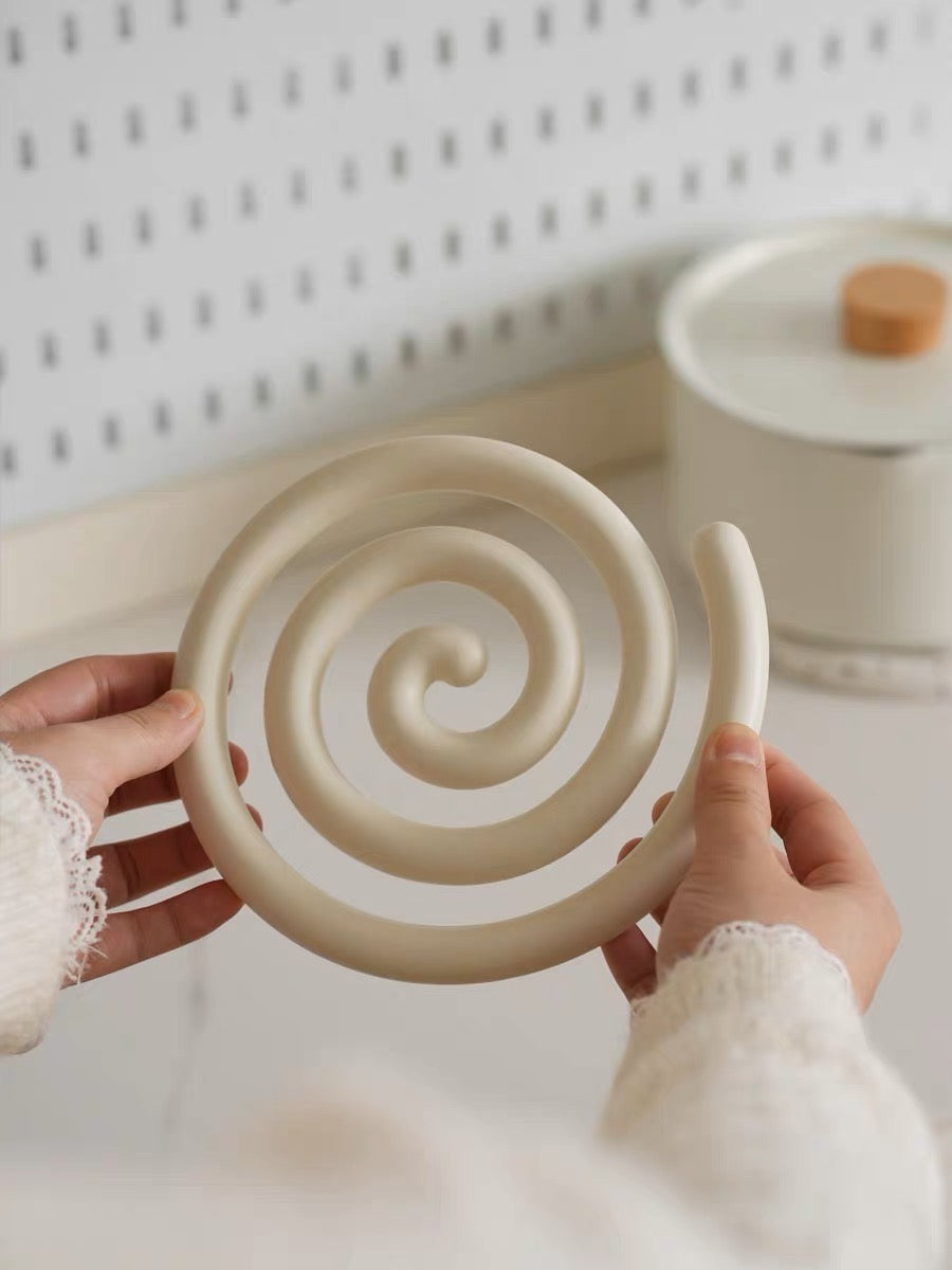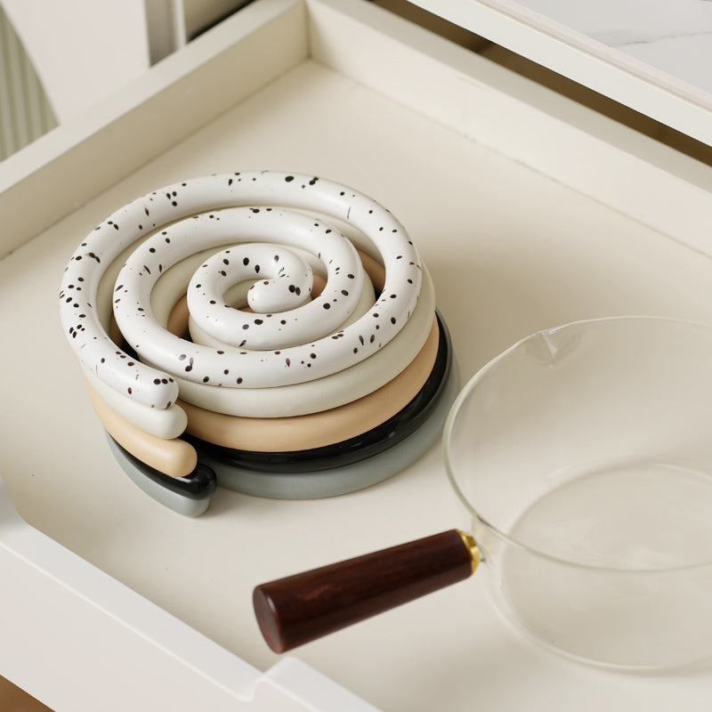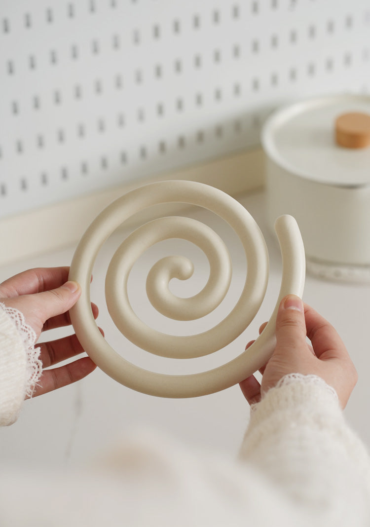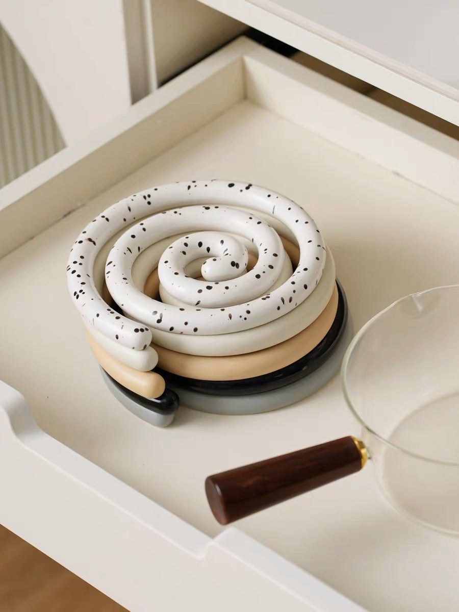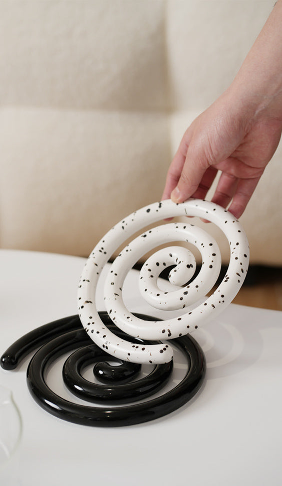 Vortex Ceramic Trivet 은 소용돌이의 자유로운 추상화에서 영감을 받은 독창적인 디자인입니다. 코일 기법으로 꼼꼼하게 수작업으로 제작된 이 세라믹 삼발이는 기능적인 주방 도구이자 예술적인 가정 장식 역할을 합니다. 미니멀한 우아함은 조리대를 보호할 뿐만 아니라 예술적인 표현이기도 합니다. 곰팡이에 강하고 청소가 쉬우며 스타일과 실용성이 결합되어 주방에서 기능성과 미학의 융합을 높이 평가하는 사람들에게 완벽한 선물이 됩니다.