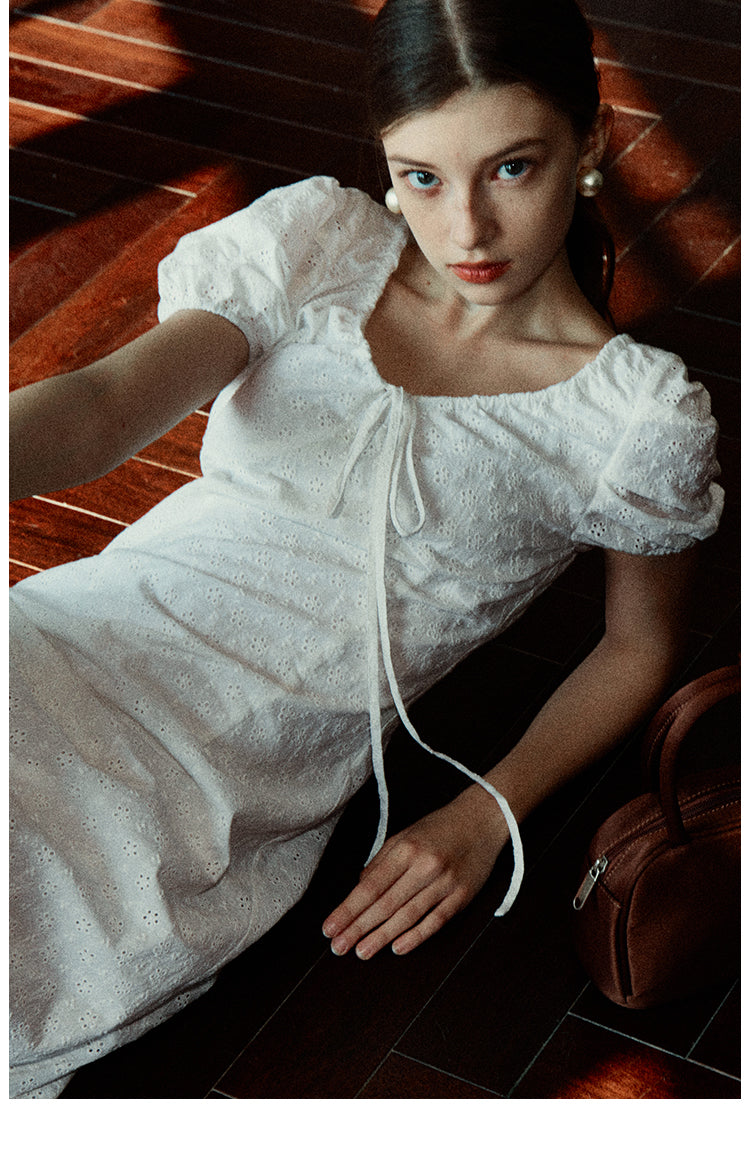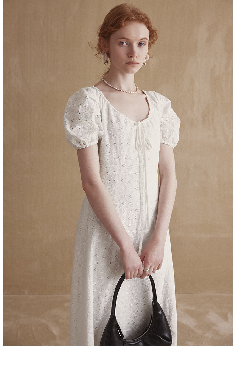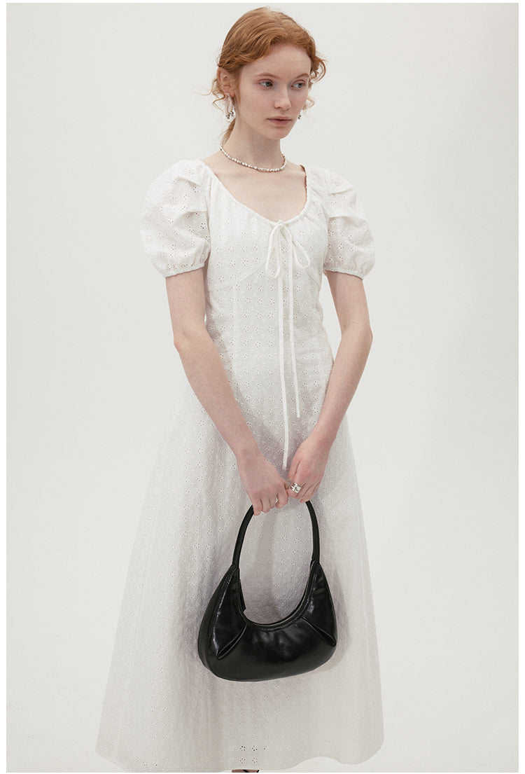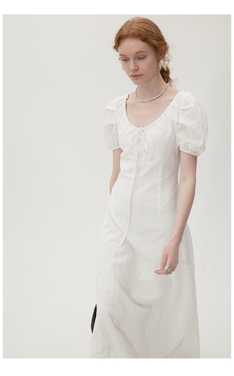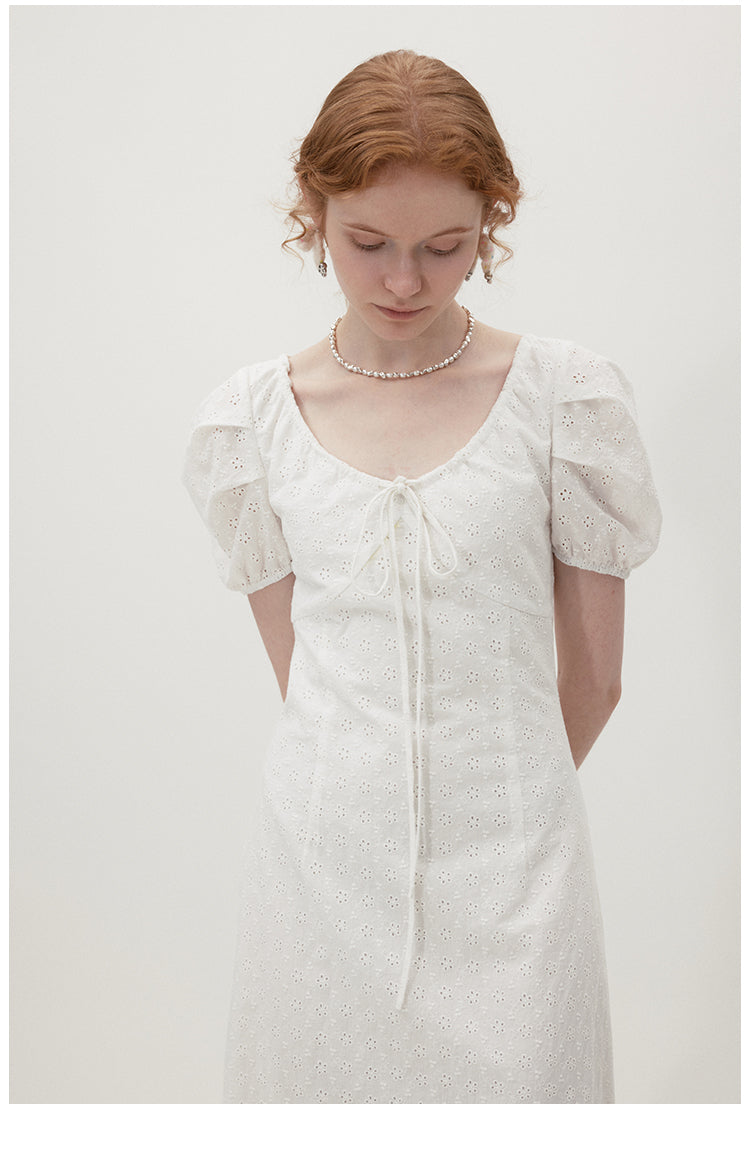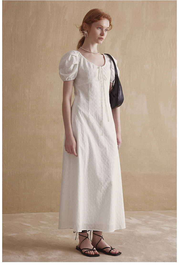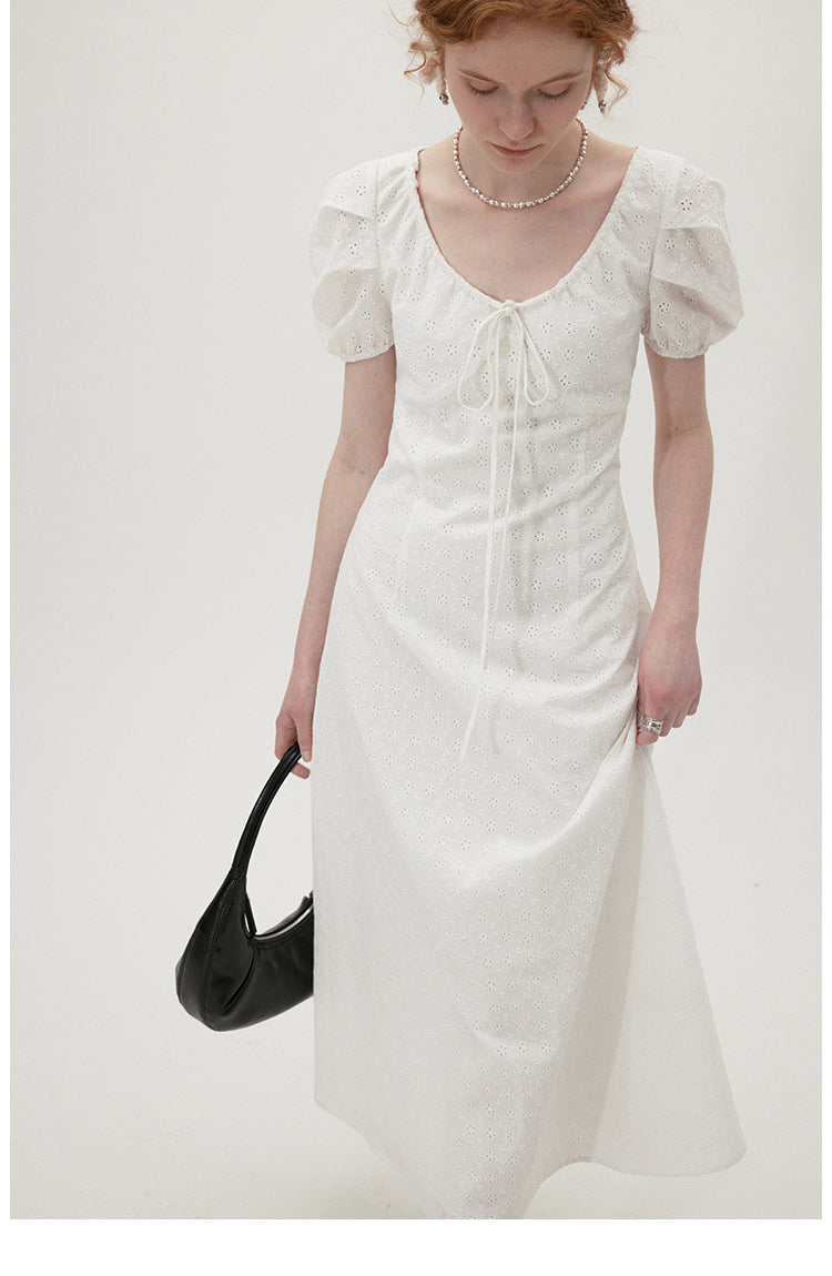 화이트 퍼프 슬리브 U-넥 자수 신치 웨이스트 드레스