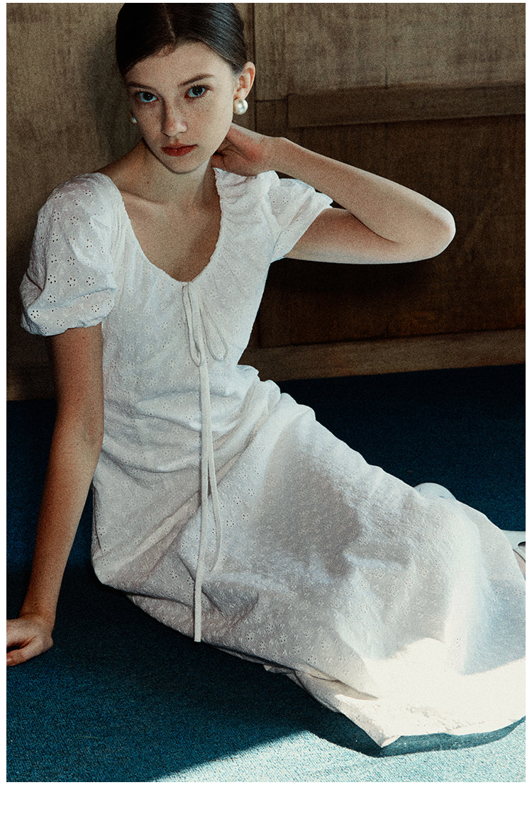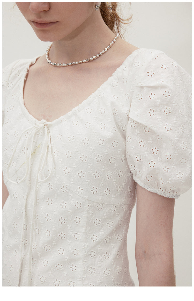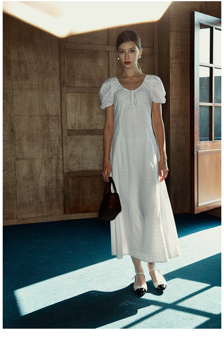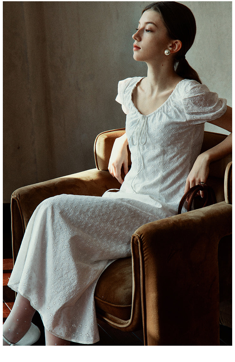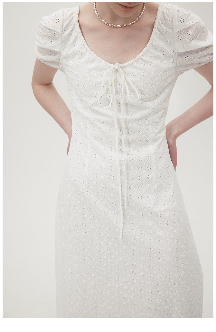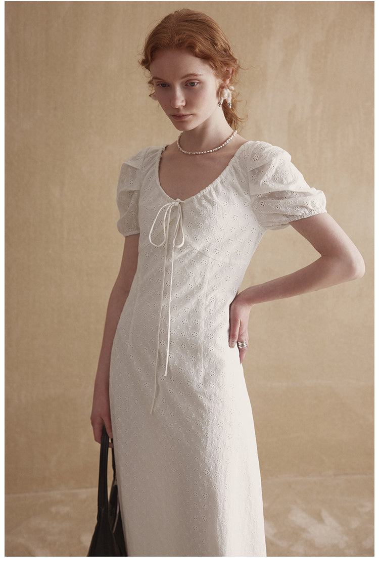 화이트 퍼프 슬리브 U-넥 자수 신치 웨이스트 드레스