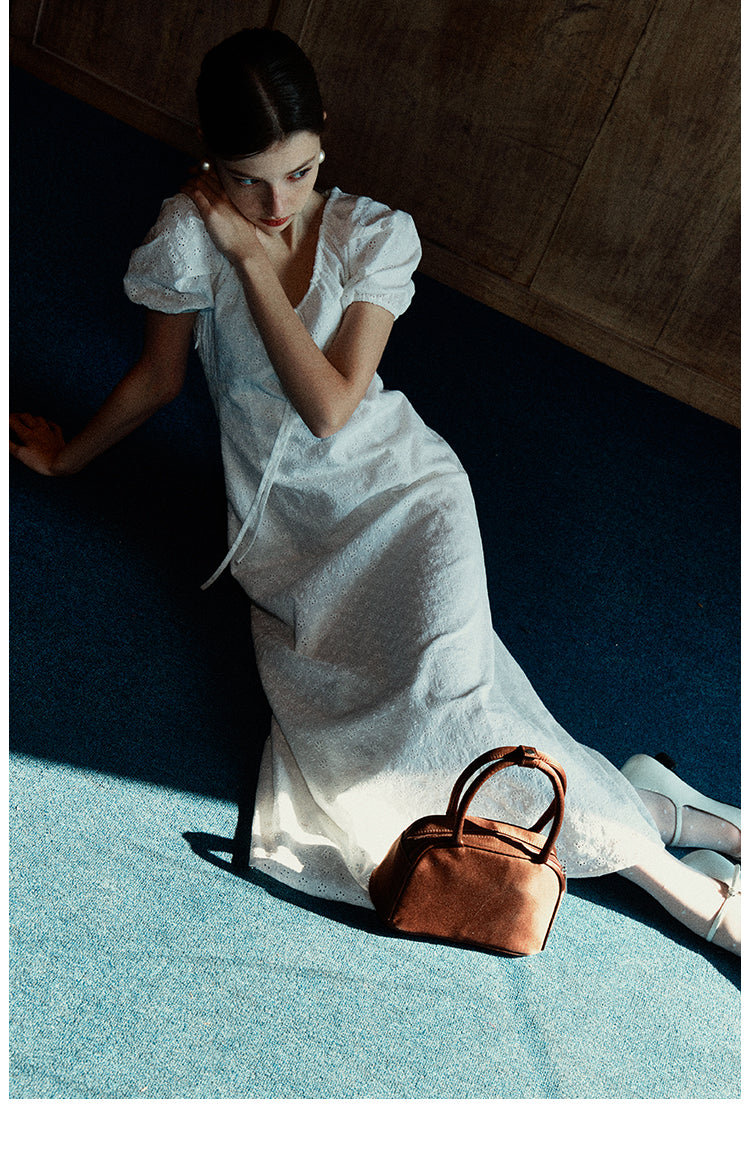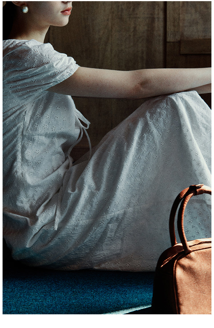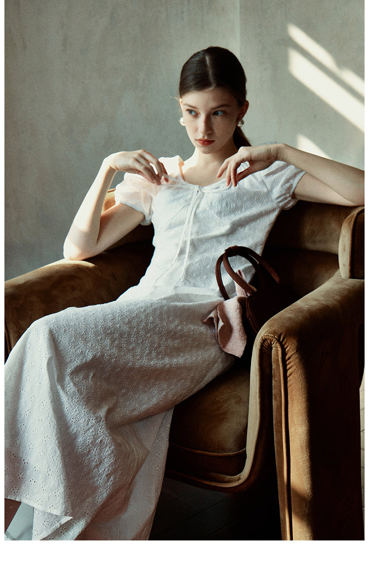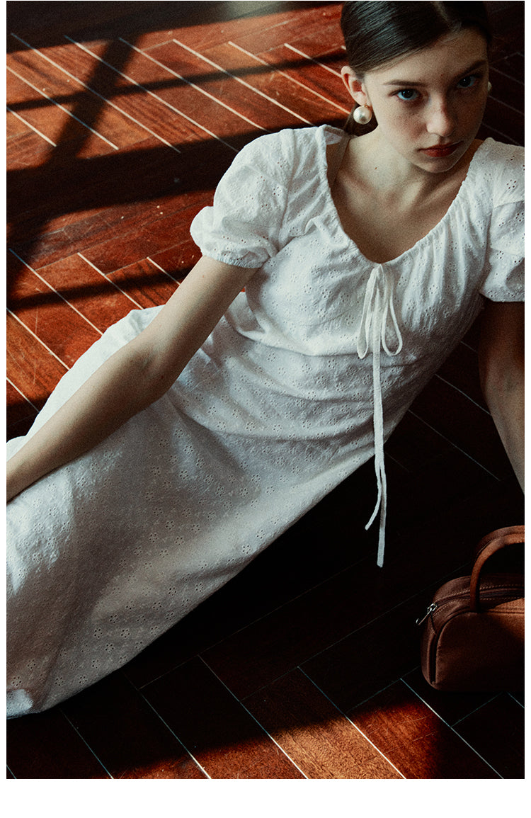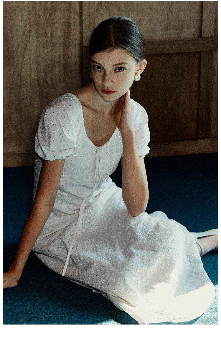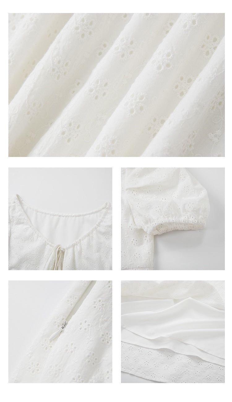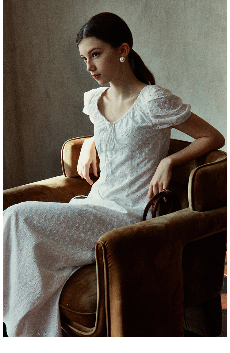 화이트 퍼프 슬리브 U-넥 자수 신치 웨이스트 드레스