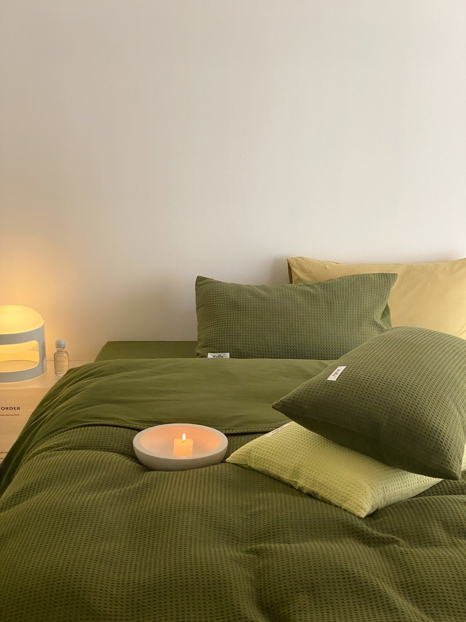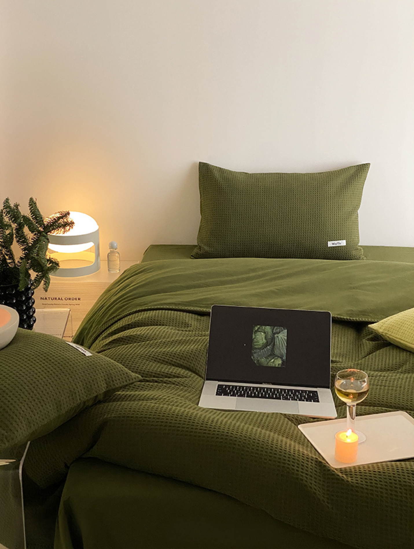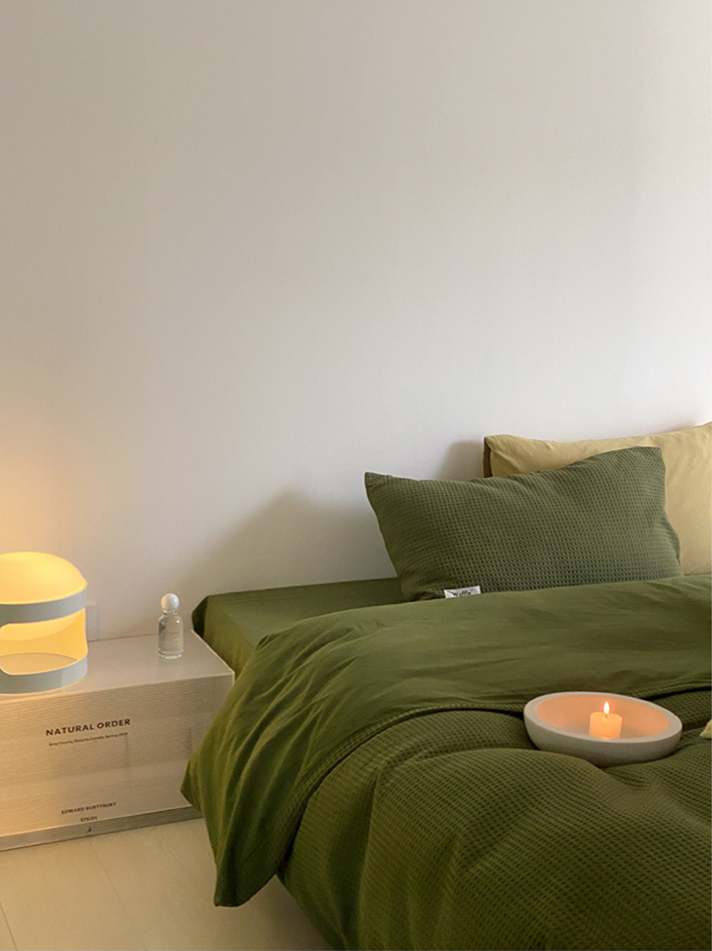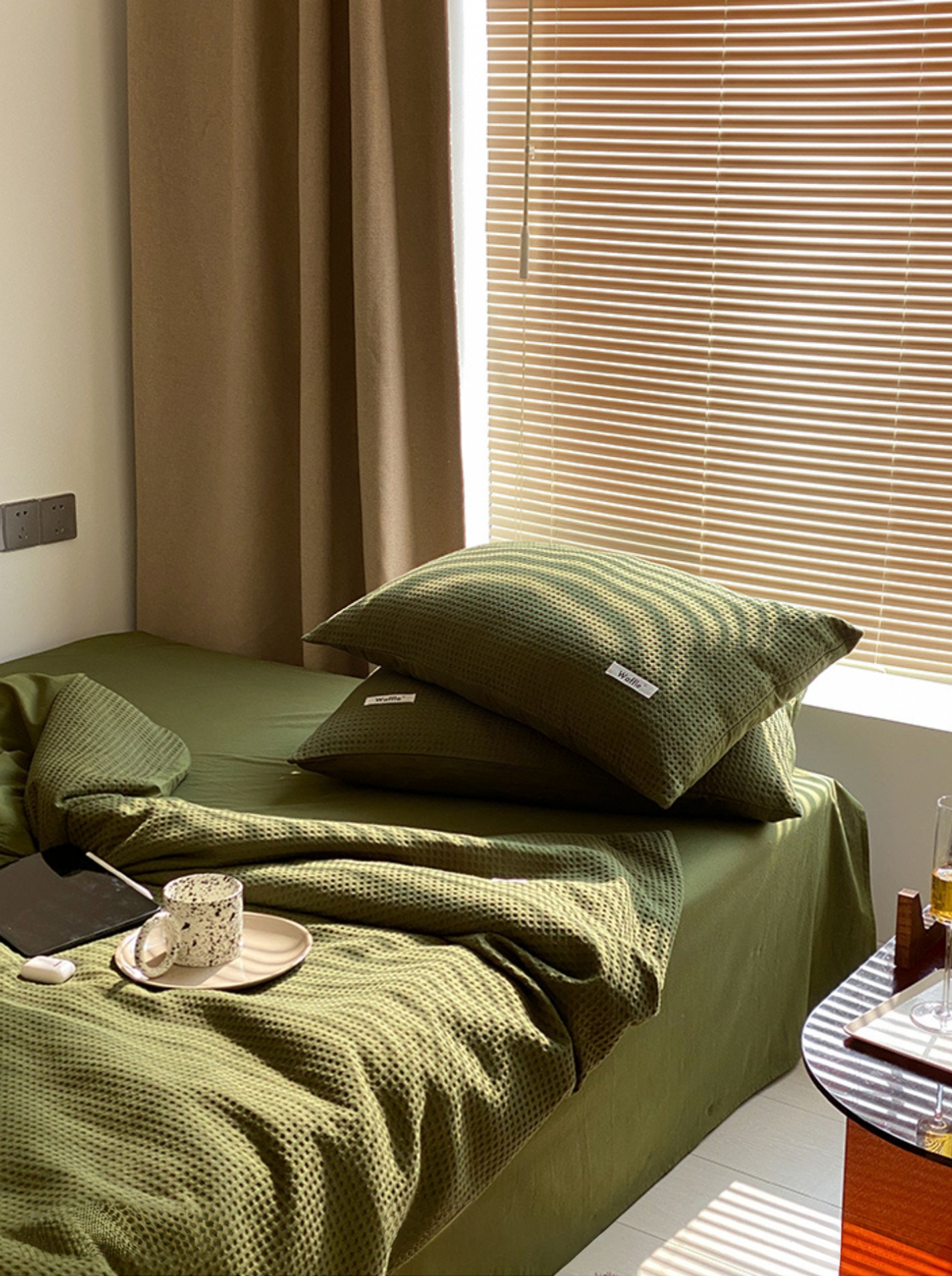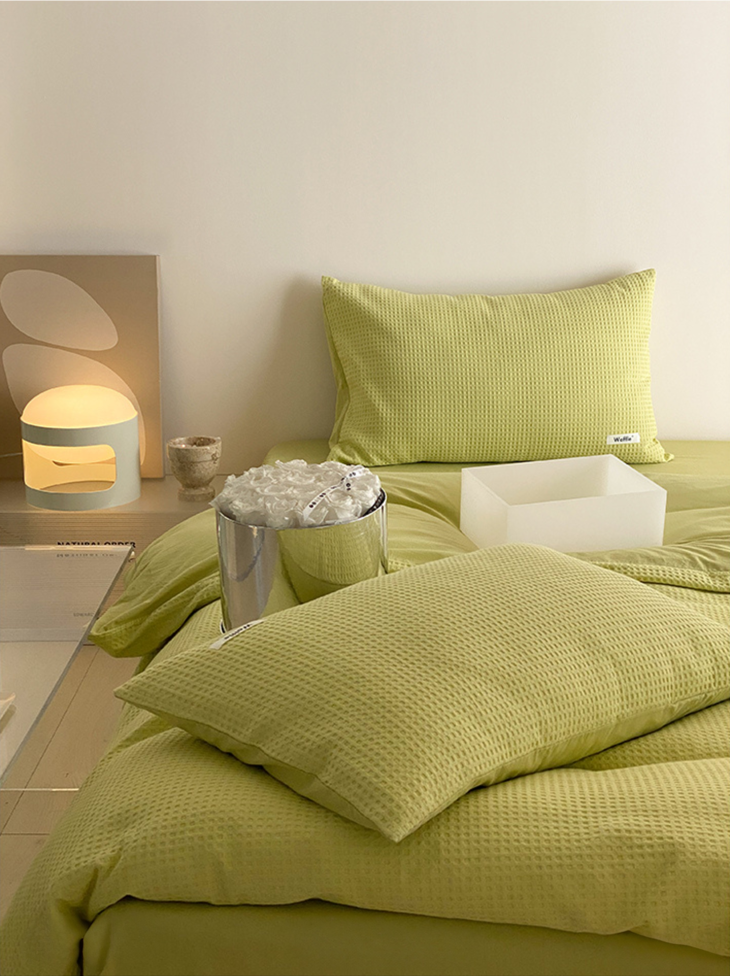 Experience the BEDDING Life Aesthetics with our Brooklyn Verdant set. Designed to cherish life's simplest moments, this set meets the "Mother & Baby" grade standard. High-density, water-washed cotton offers unparalleled softness, while the waffle design promotes enhanced breathability. Perfect for bare-sleeping, it's the essence of everyday comfort and luxury for both mother and baby.