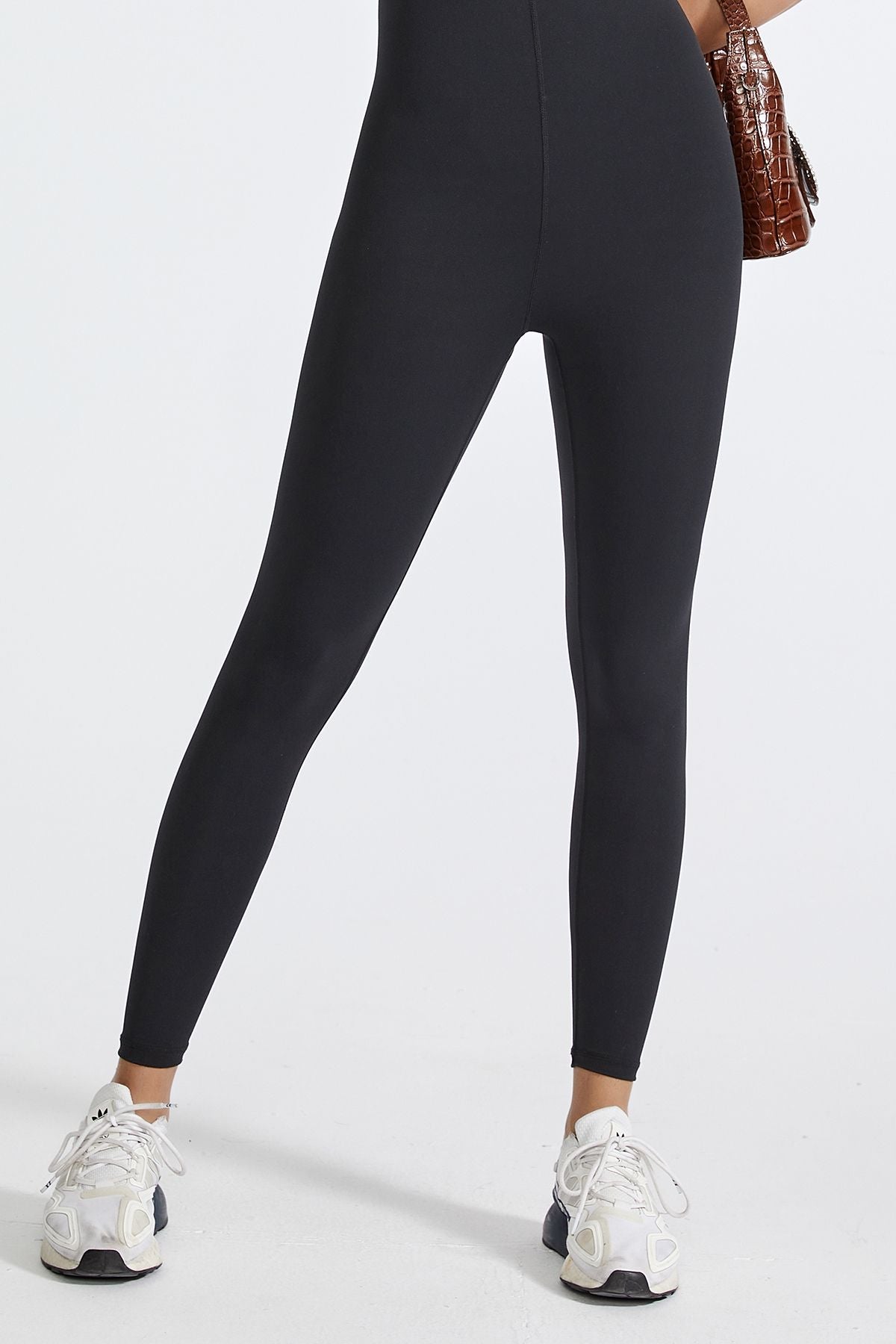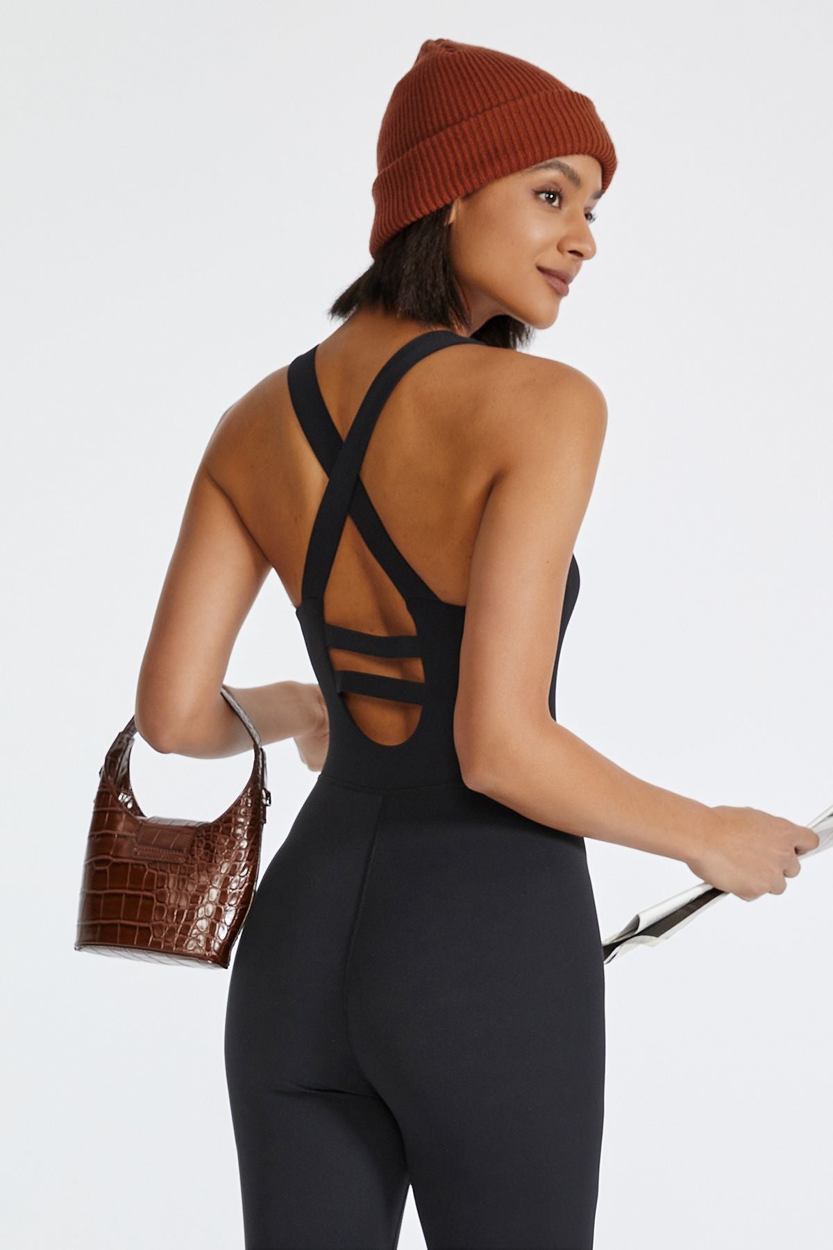 Meditate or make a move in this so sleek onesie featured in a performance nylon and spandex fabric with a scoop neckline and bold strappy back that keeps you looking and feeling cool as you work out.