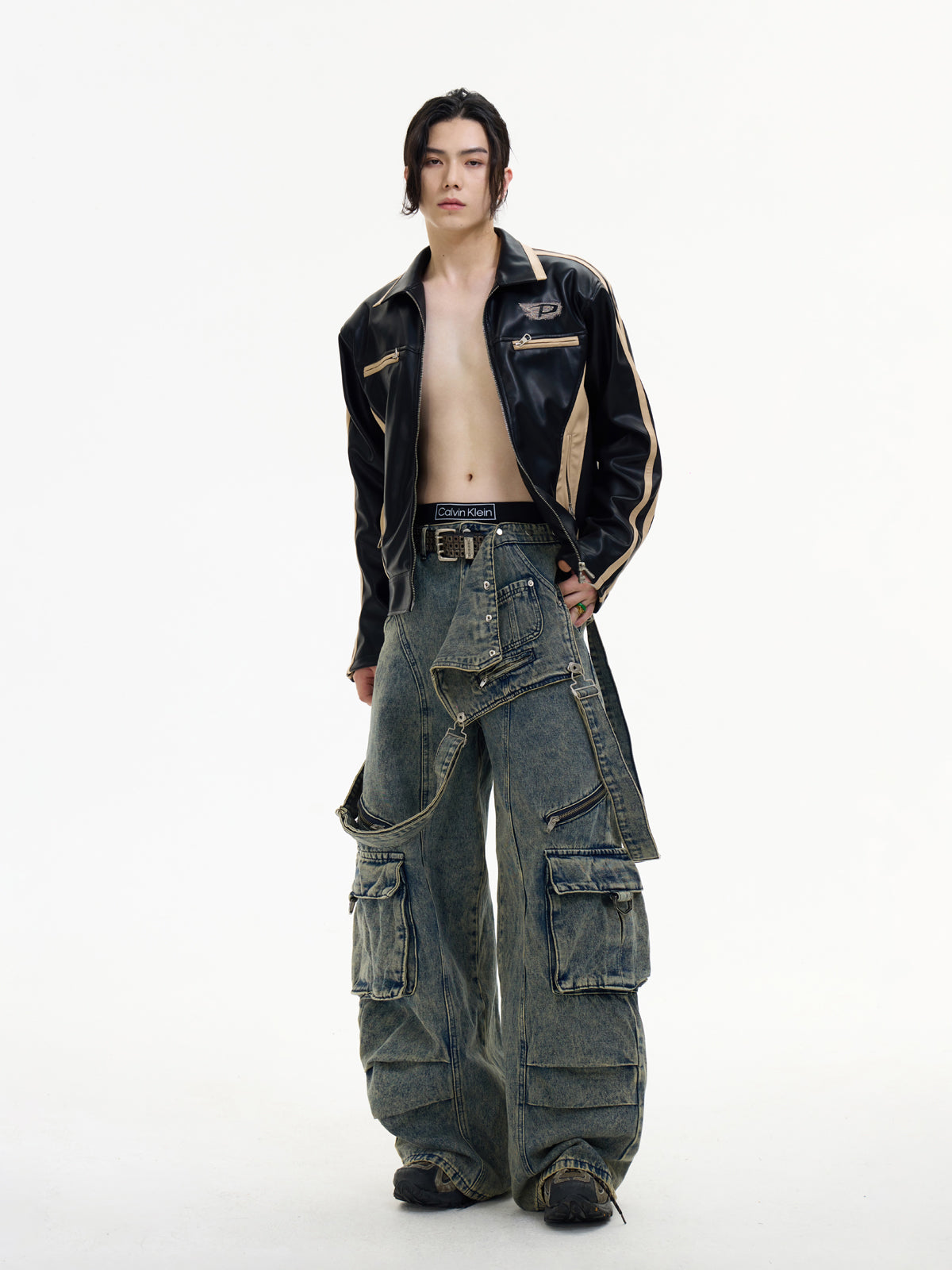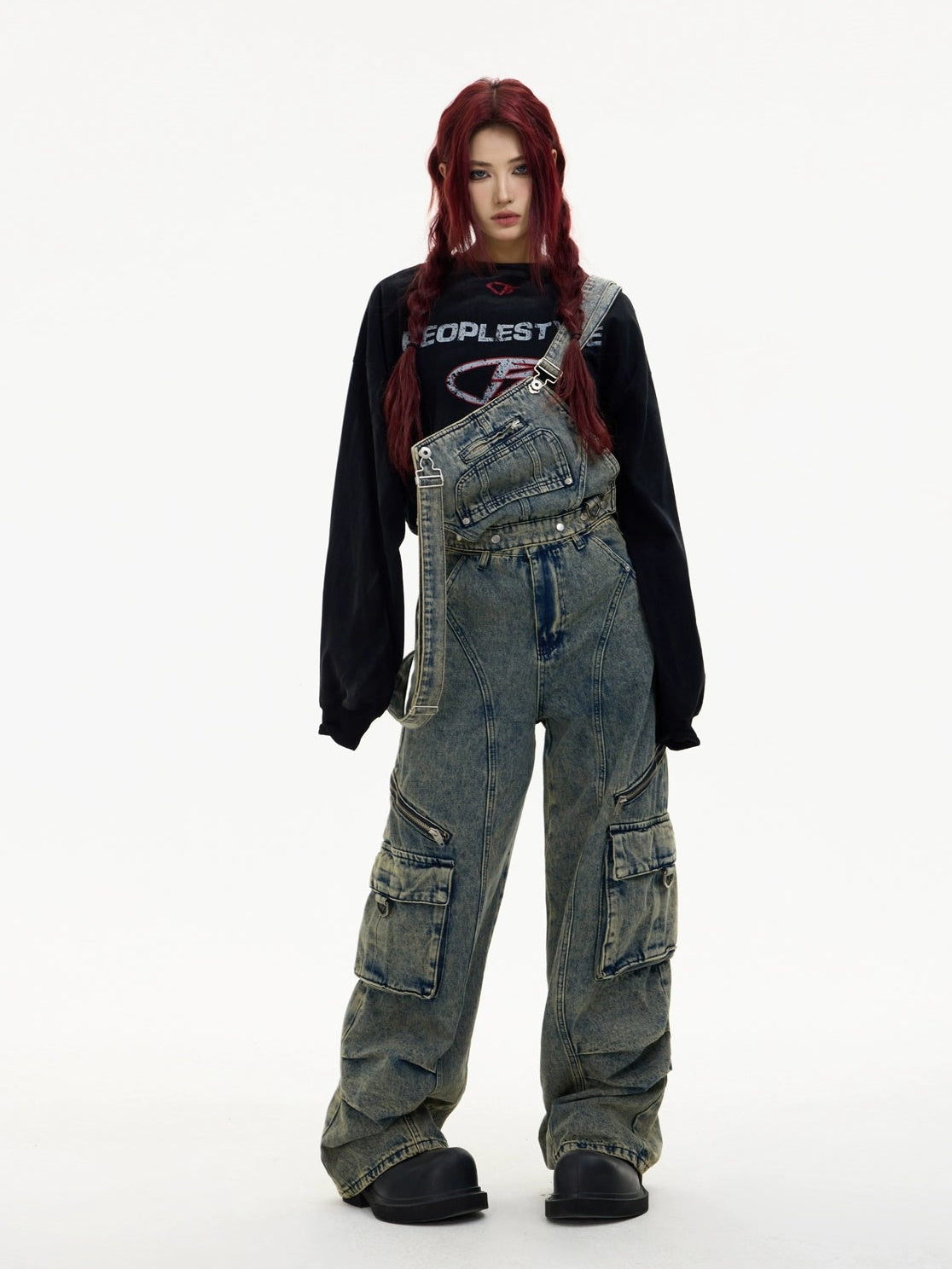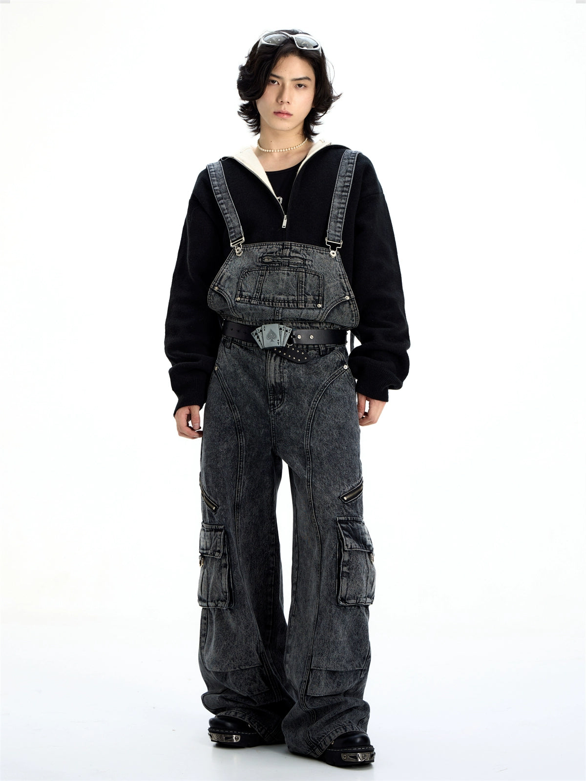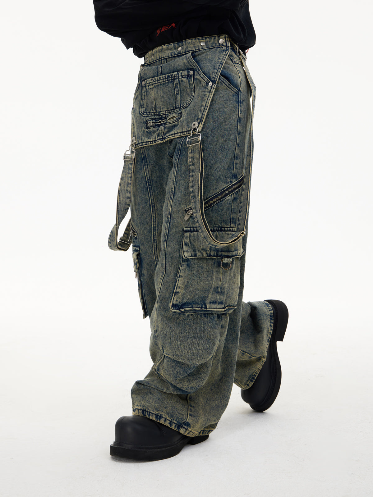 Detachable Suspender Washed Multi-pocket Cargo Jeans