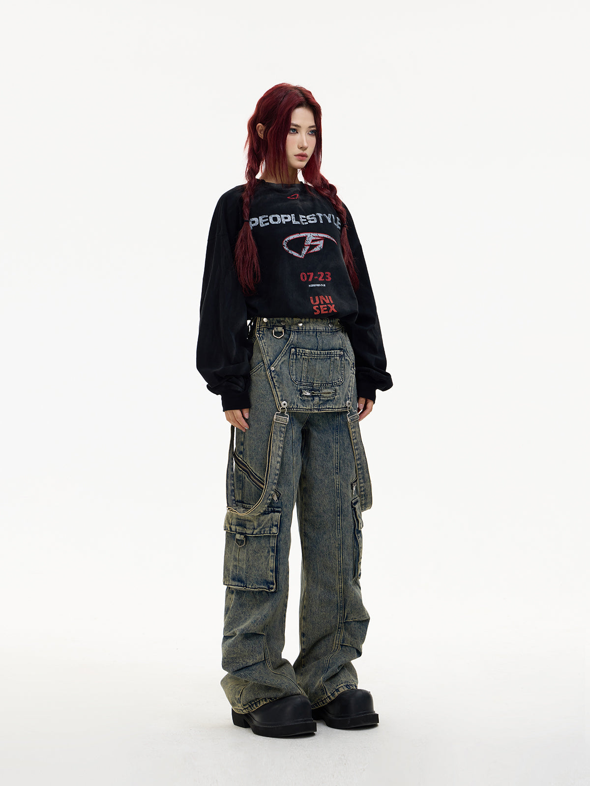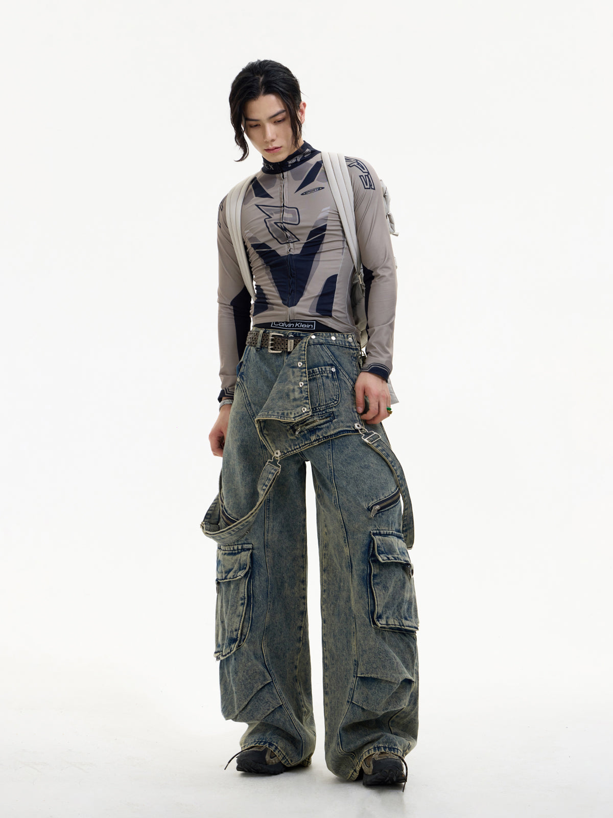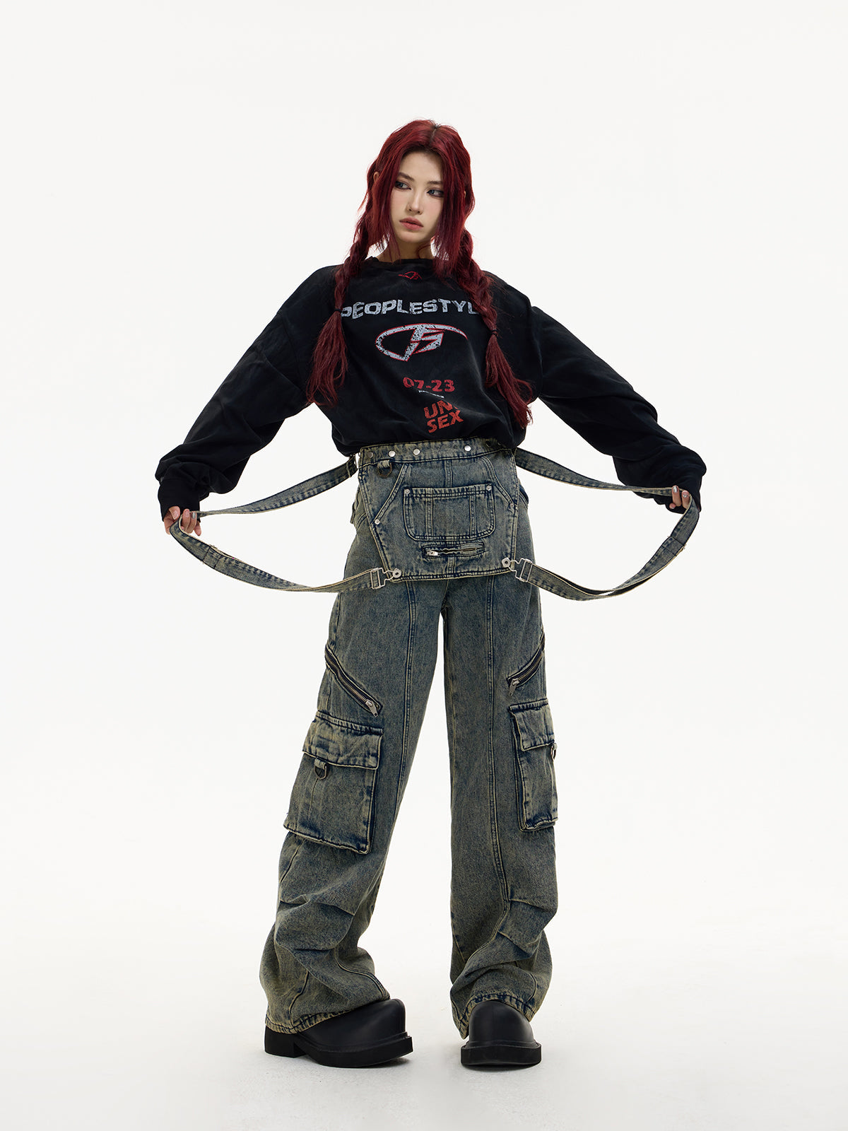 Detachable Suspender Washed Multi-pocket Cargo Jeans