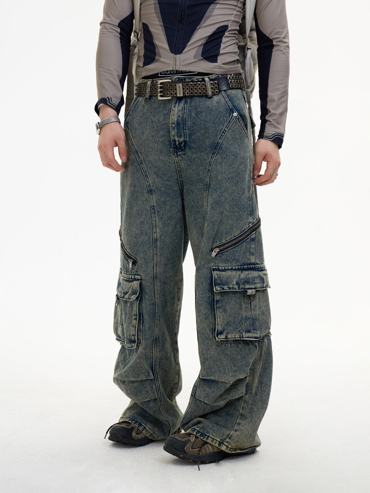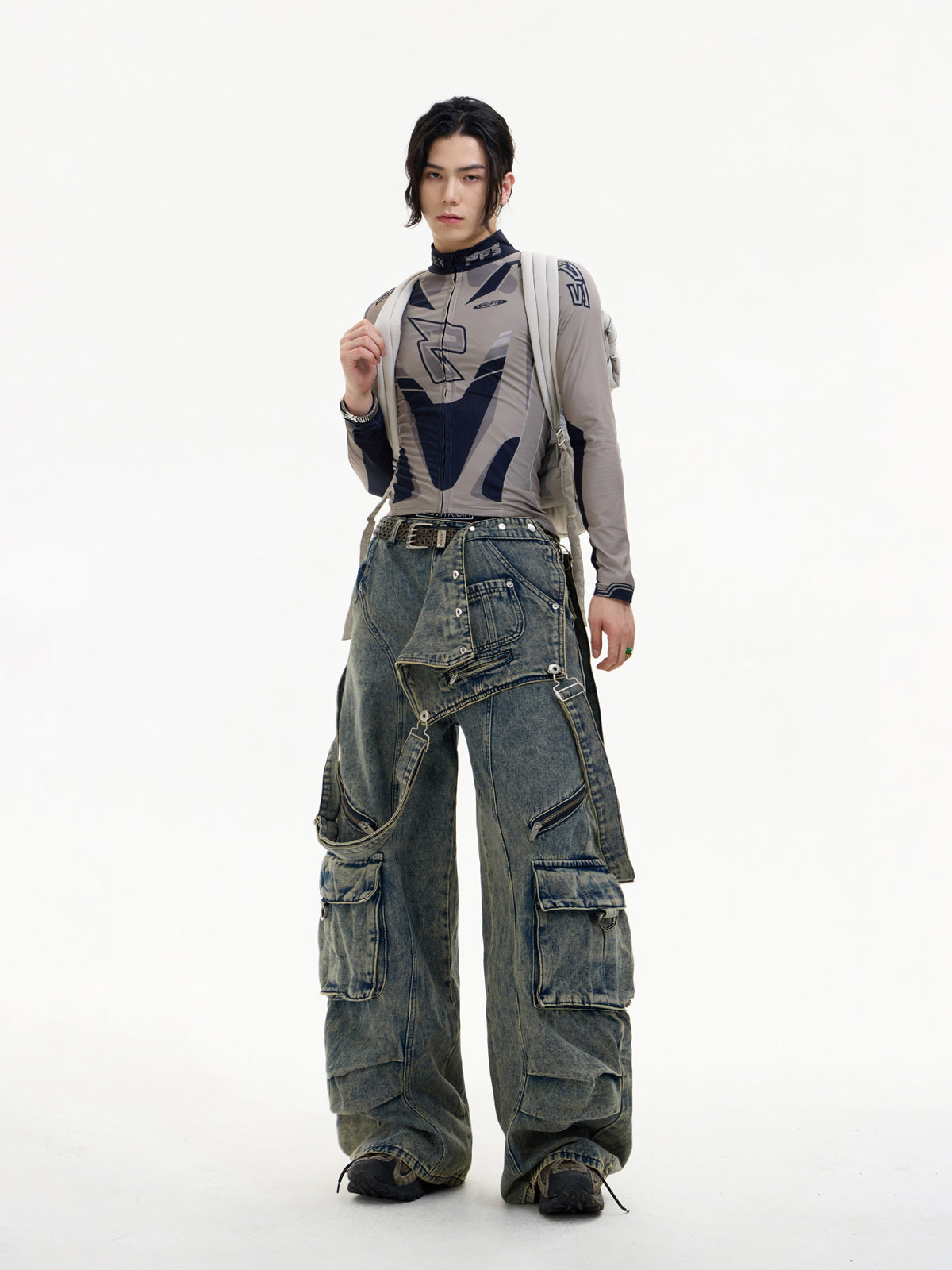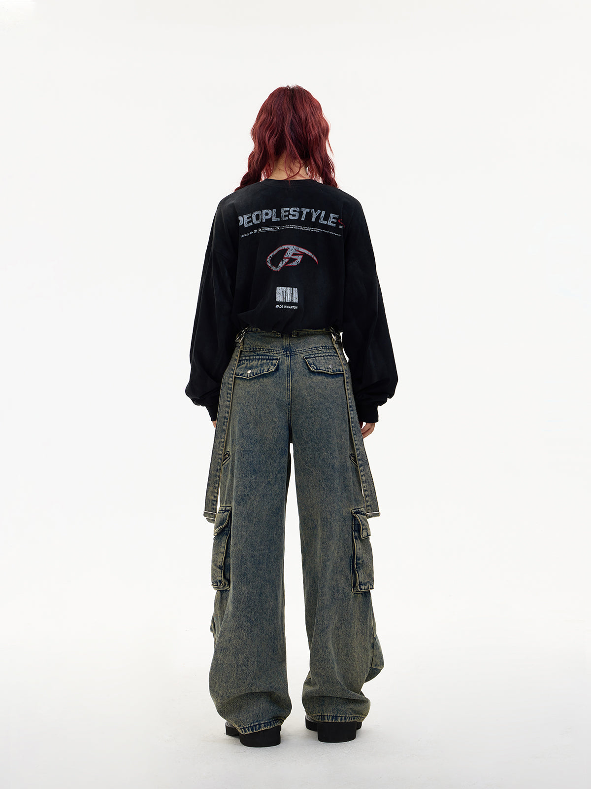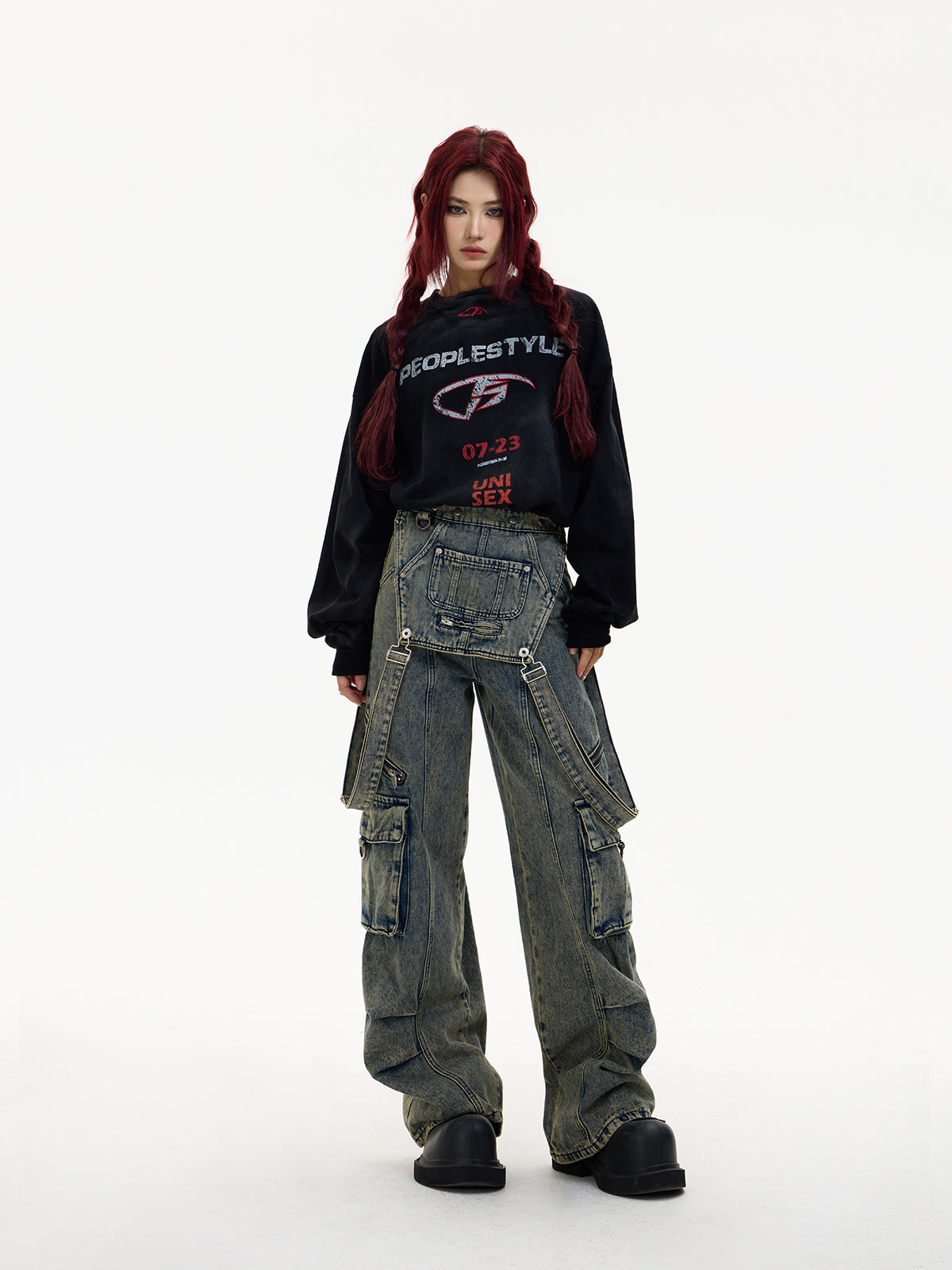 Detachable Suspender Washed Multi-pocket Cargo Jeans