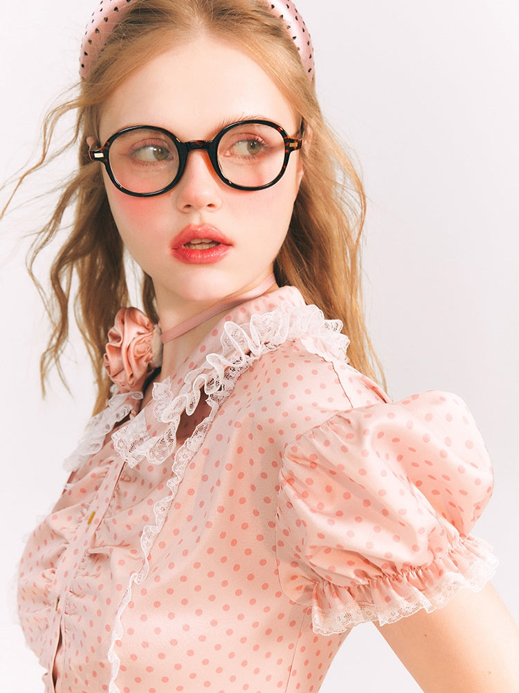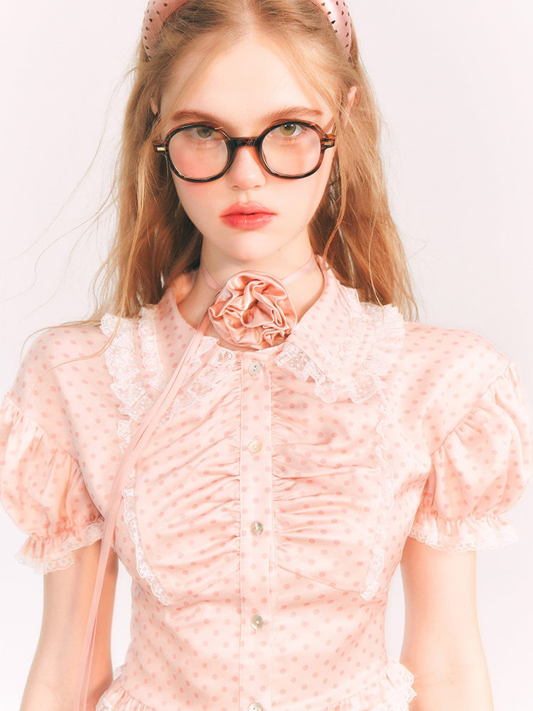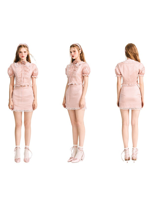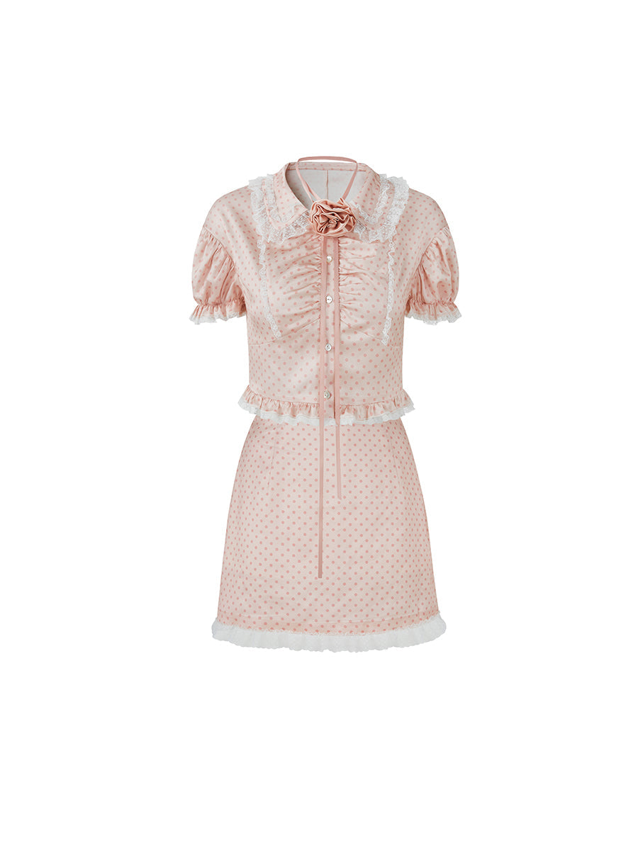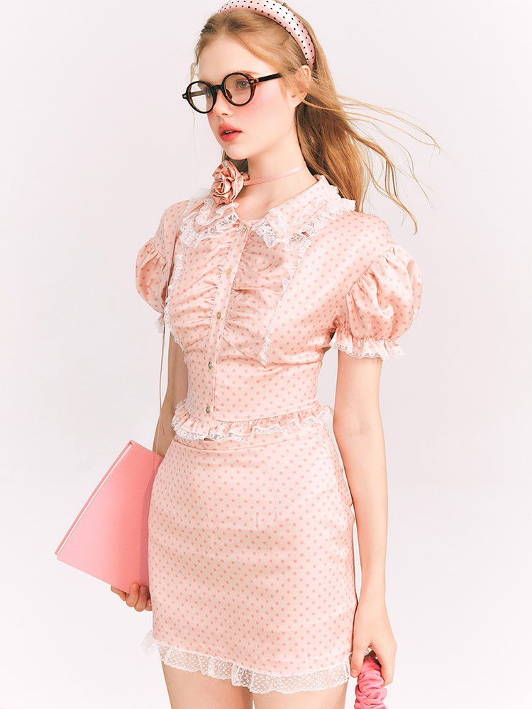 Dot Puff Sleeve Shirt & Lace Stitch Mini Skirt