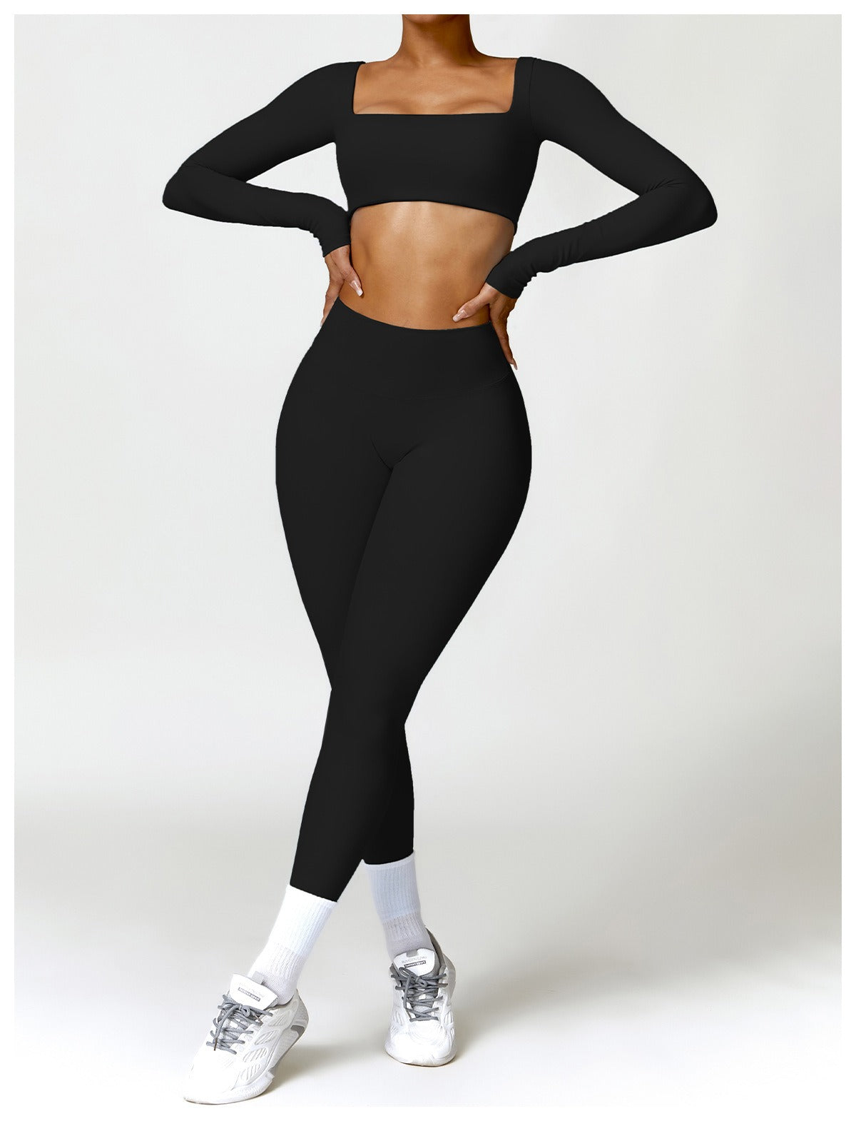 Our classic bodycon set features our signature sculpting leggings with a high and elastic waistband and matching crop top with a square neckline, double lined design and long fitted sleeves. Both pieces hug your body in all the right places. Style together or separately to create a multitude of looks. Xoxo