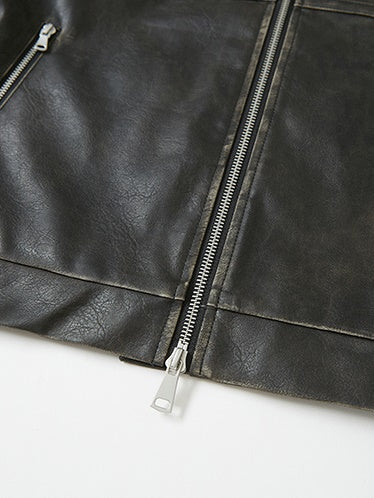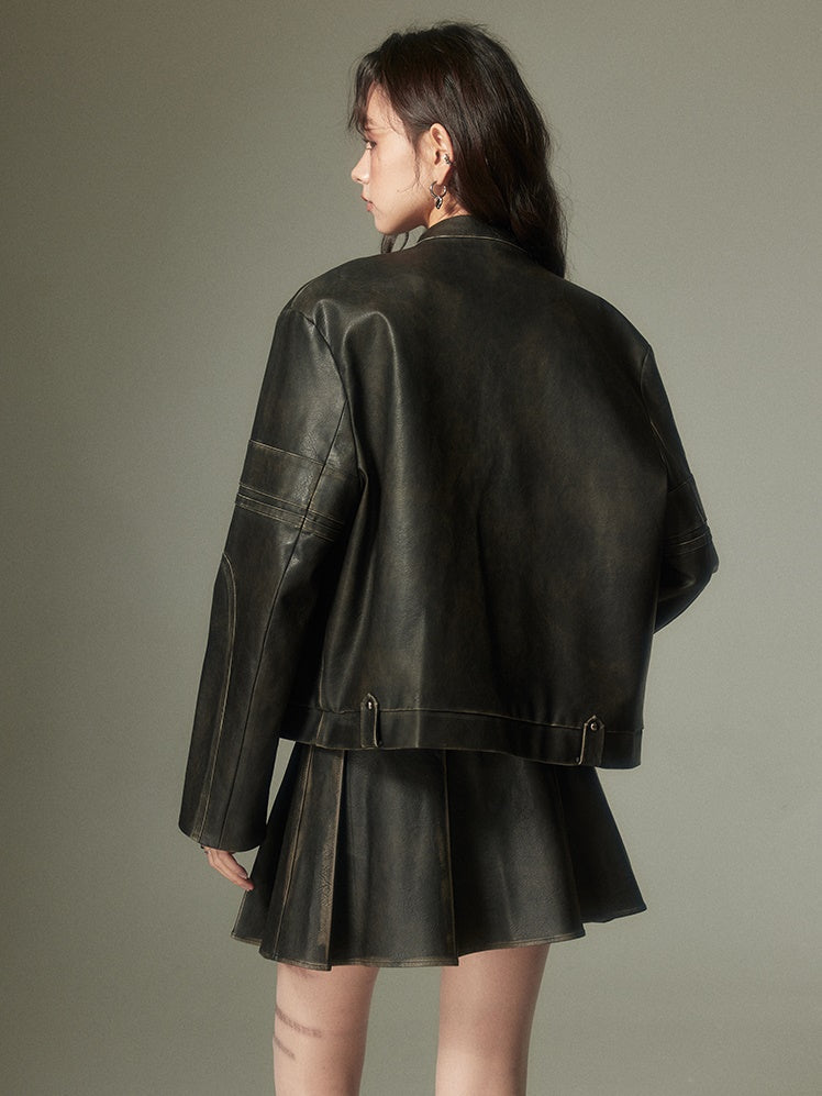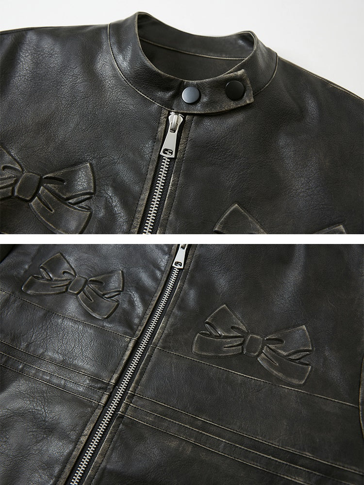 Emboss Ribbon Leather Stand Collar Jacket