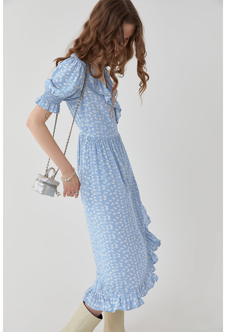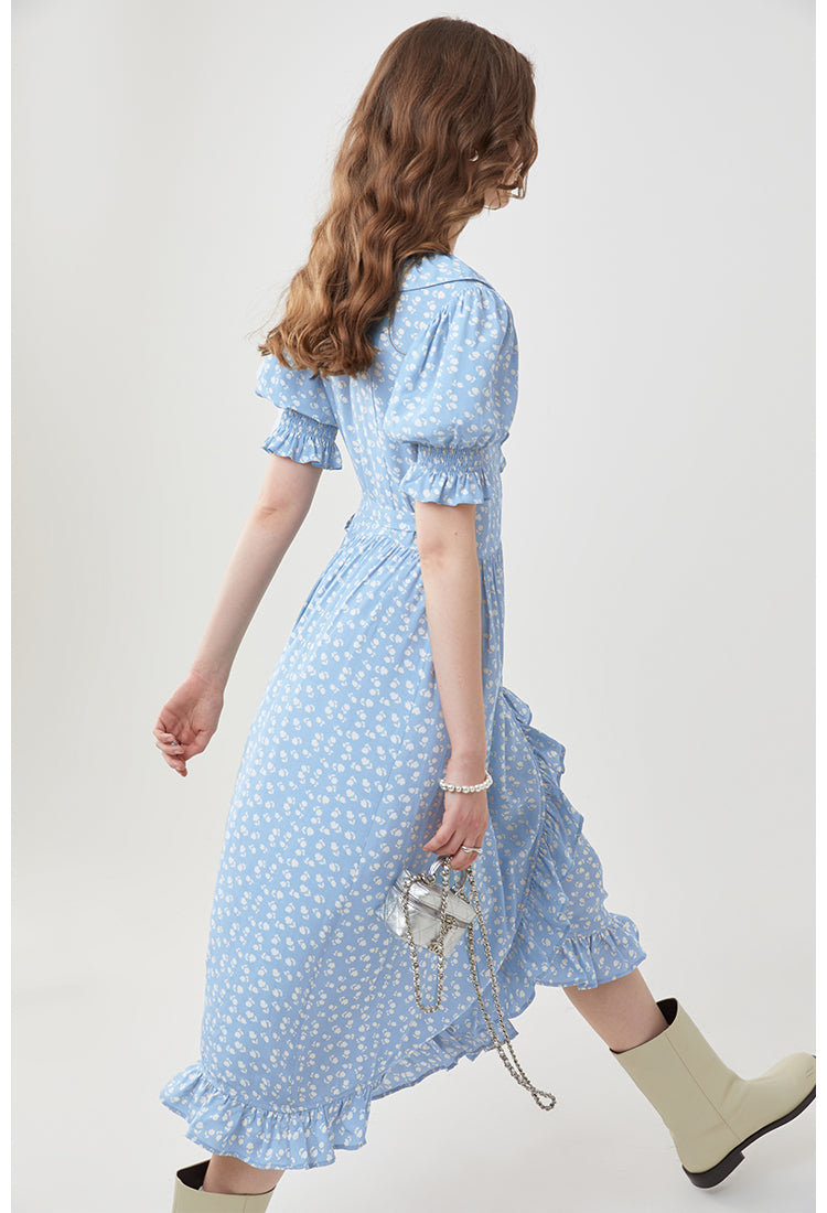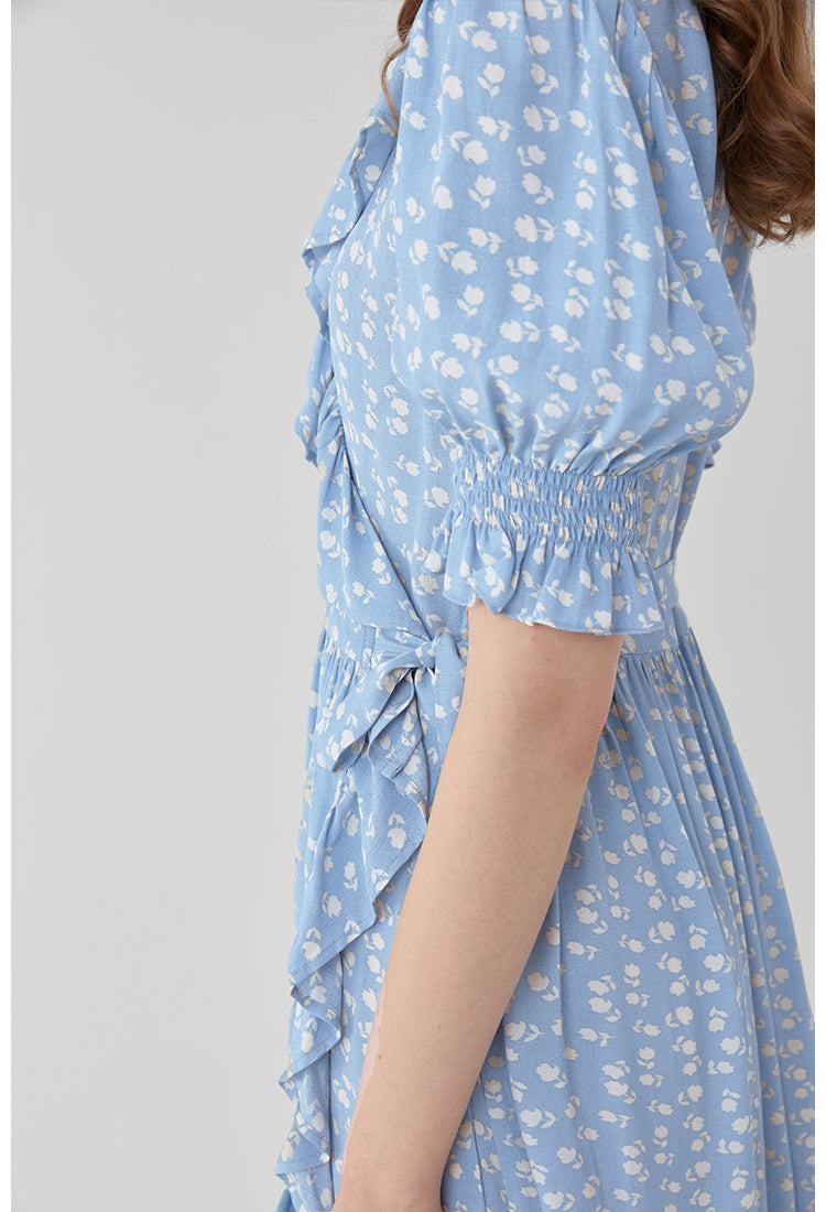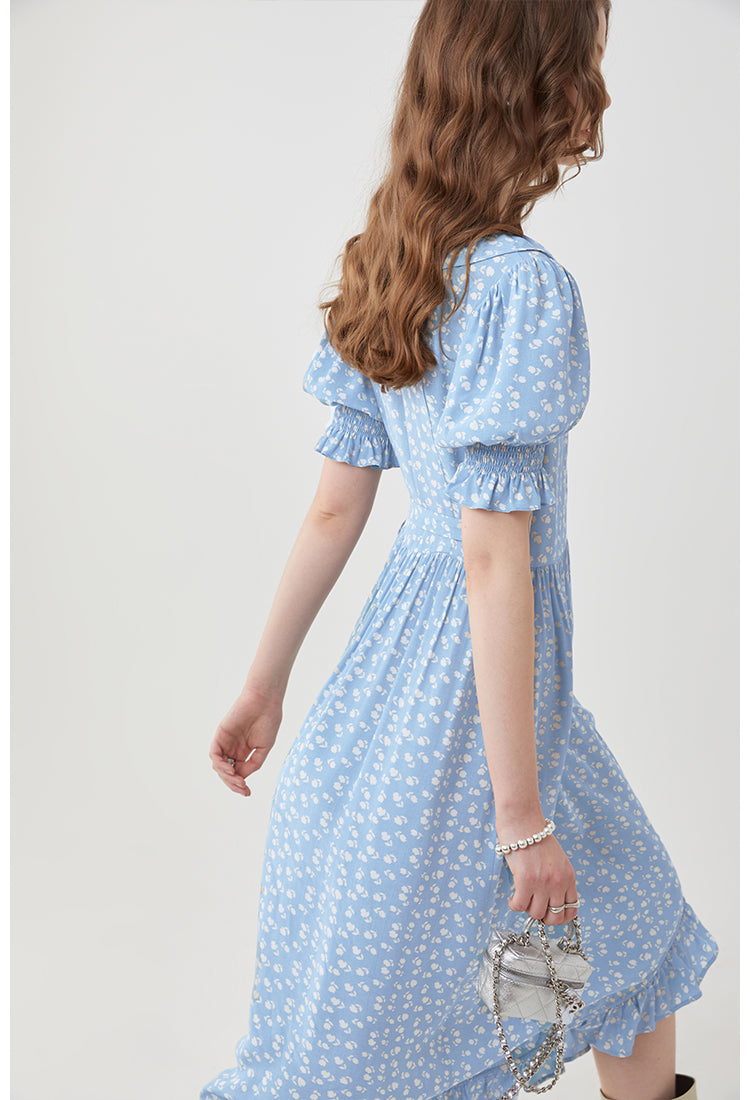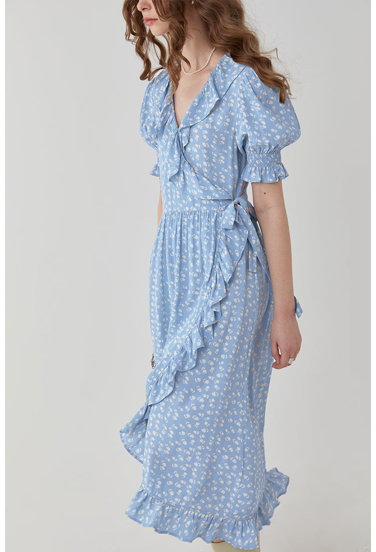 Floral Waist-Cinching Bubble Sleeve Maxi Dress