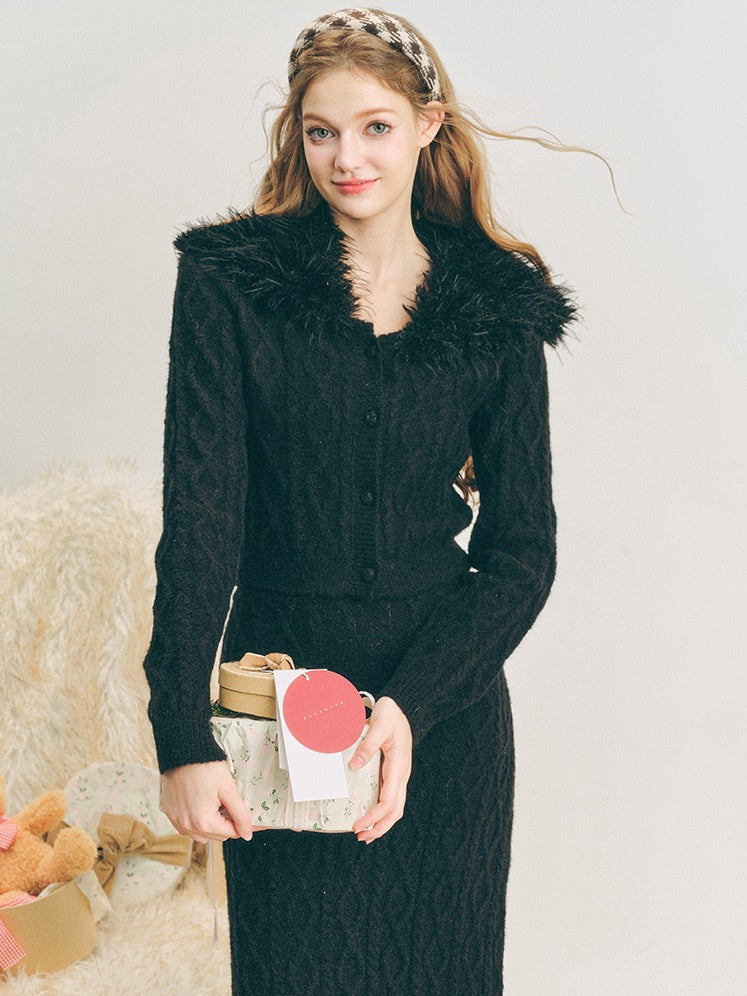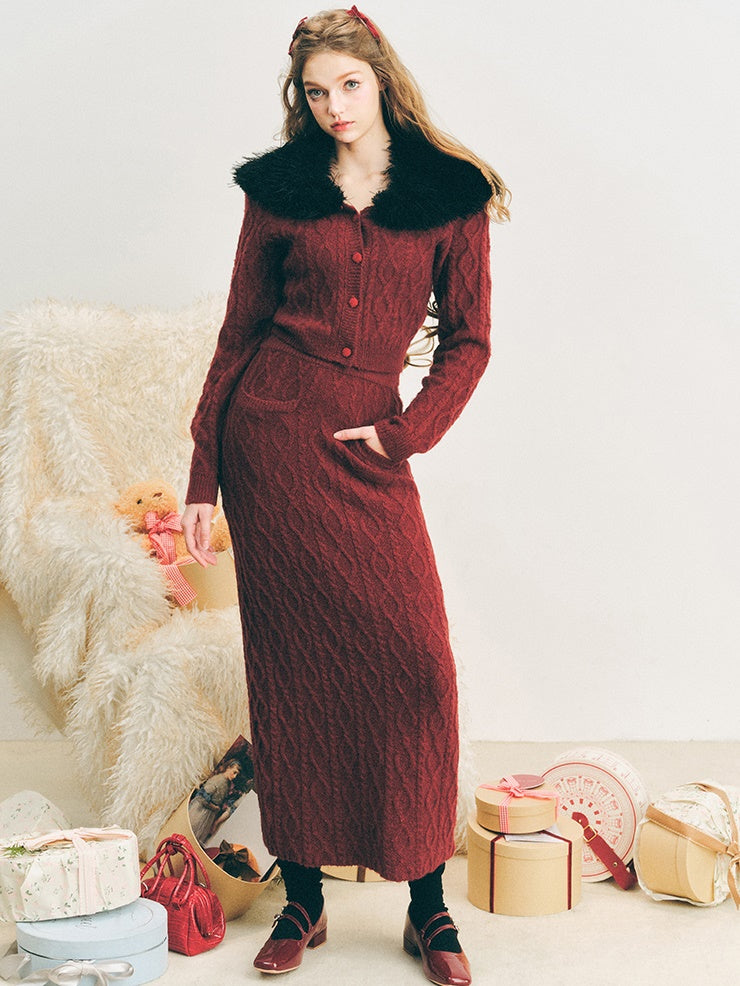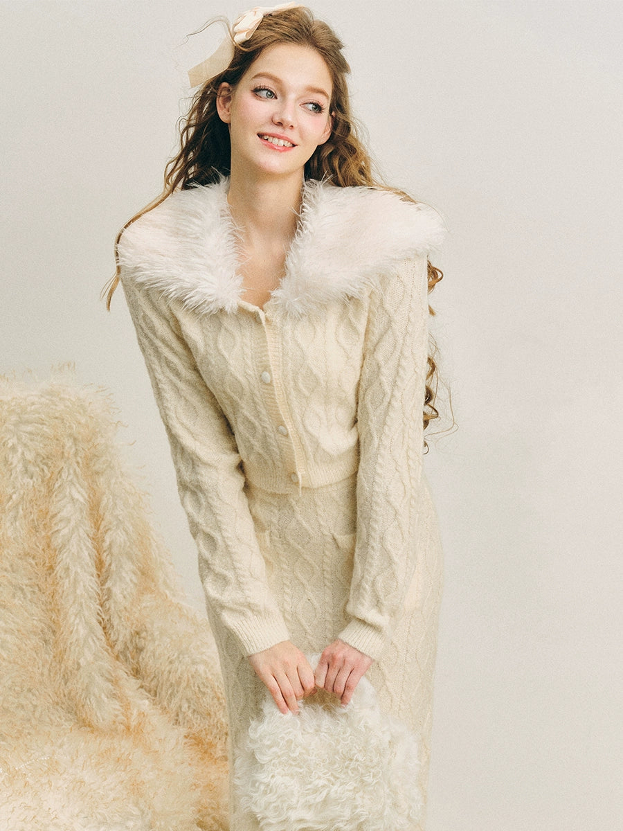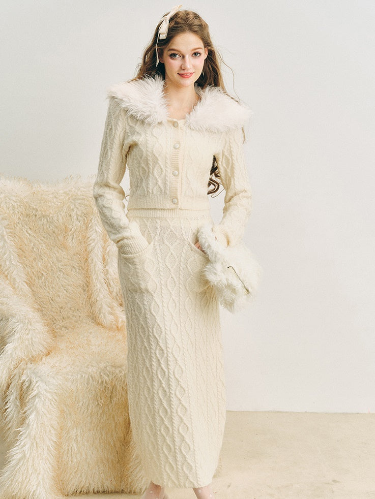 Fur Collar Twist Knitted Cardigan & Long Skirt