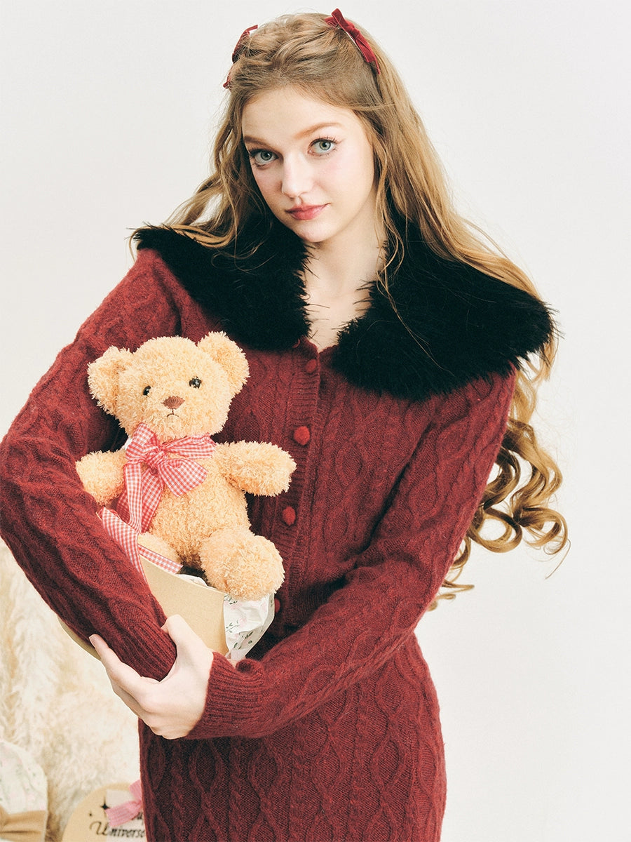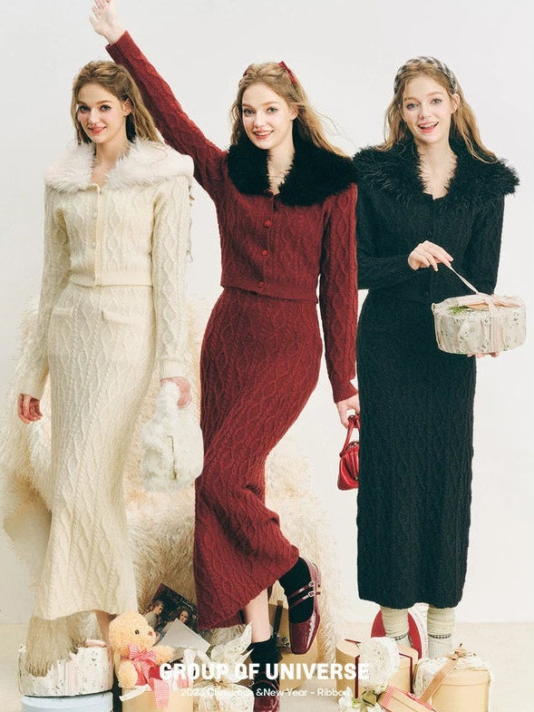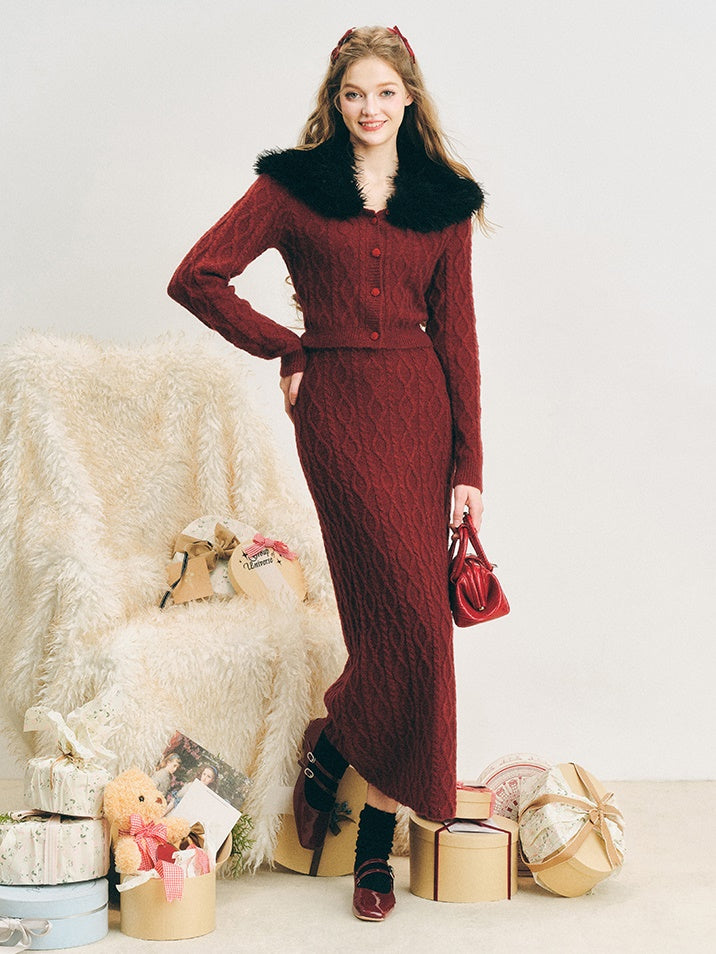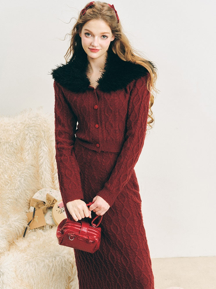 Fur Collar Twist Knitted Cardigan & Long Skirt