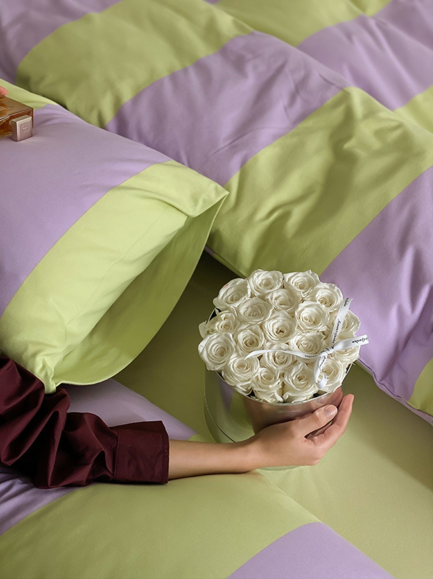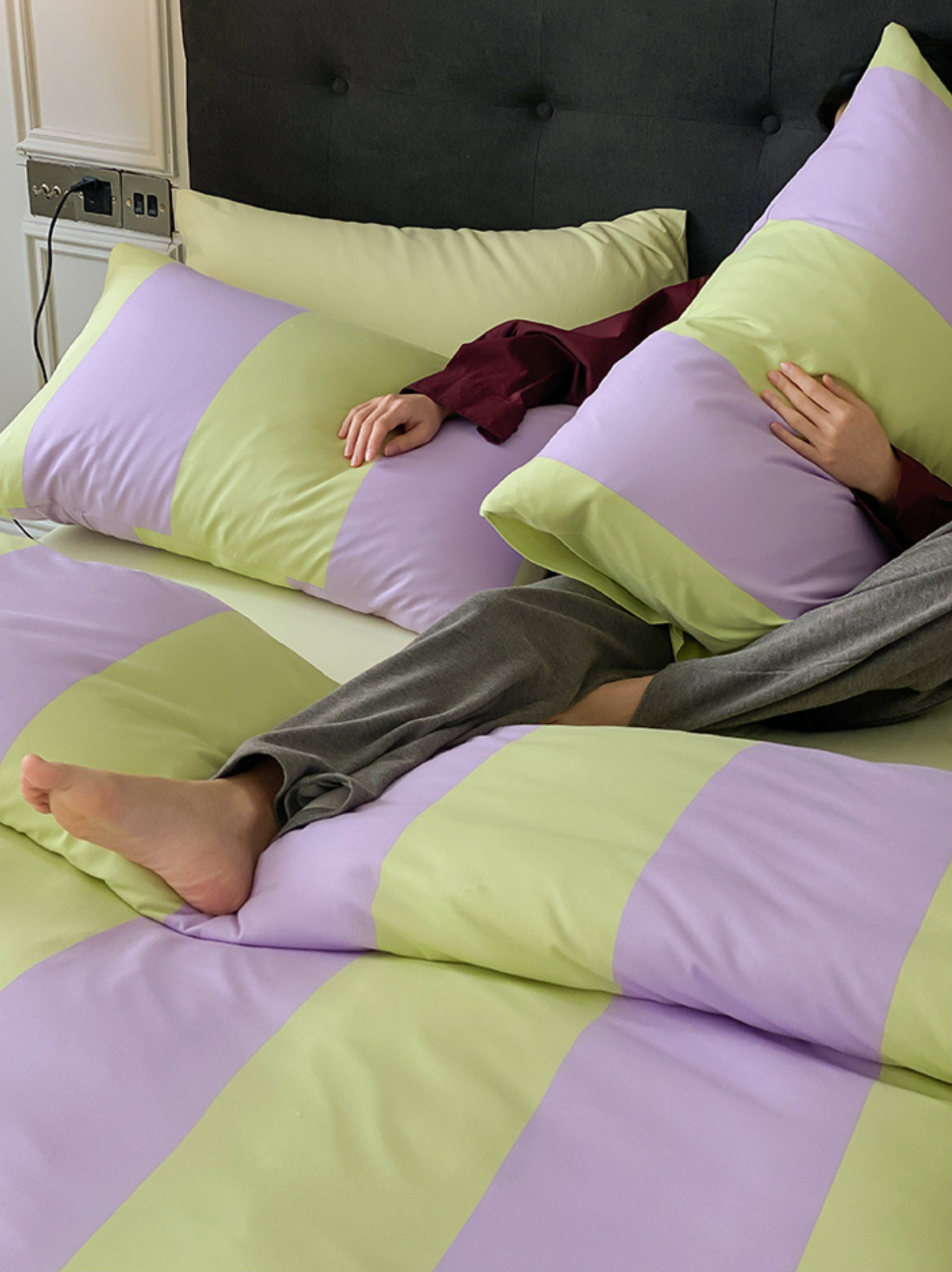 Grape Hyacinth: Purple-Green Stripe Cotton Knit Bedding Set